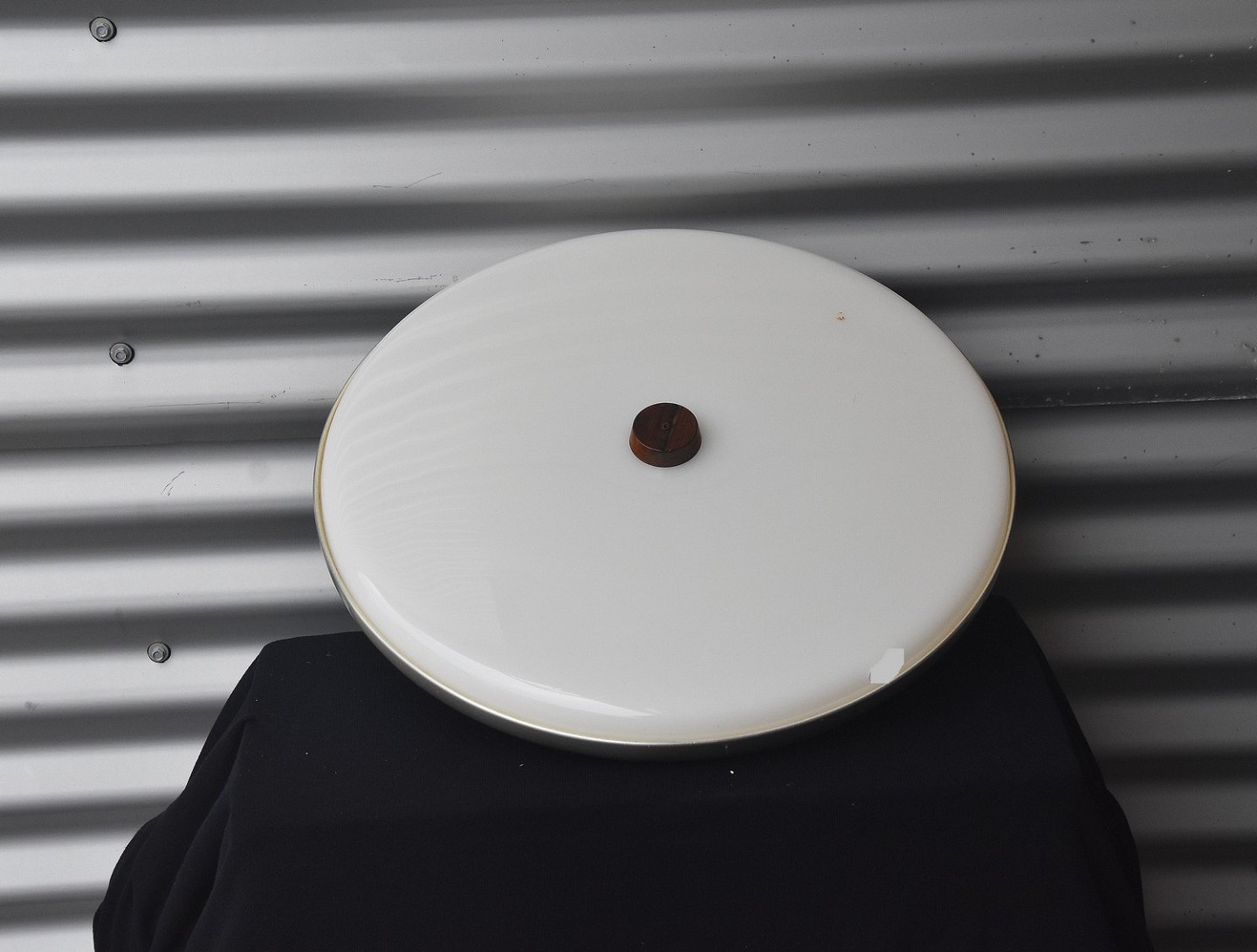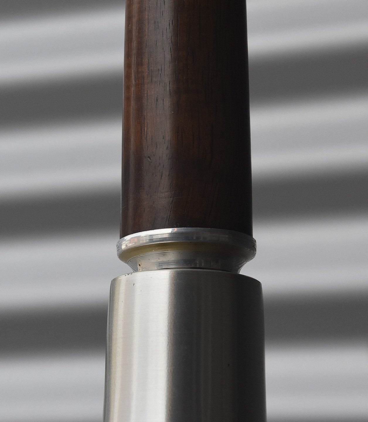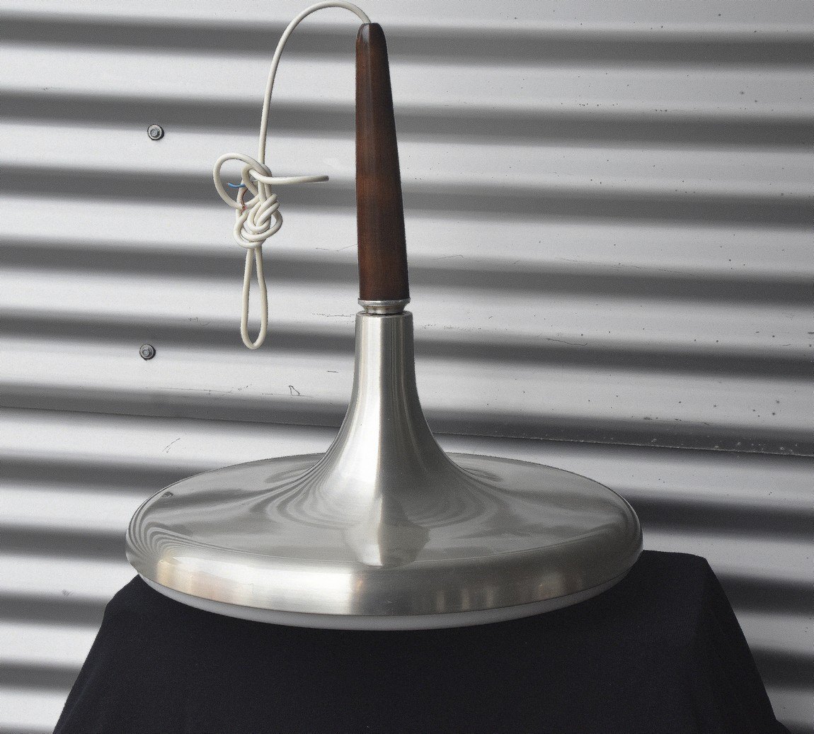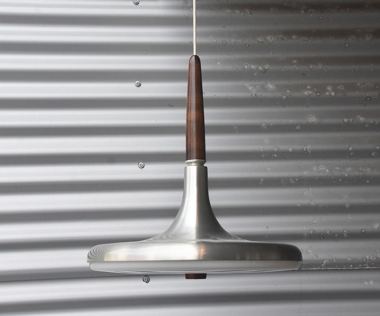 Pendel i poleret metal og palisander. Der er sat en plast lysdæmper i nederste kant, denne lysdæmper er sat fast med en knop af palisander