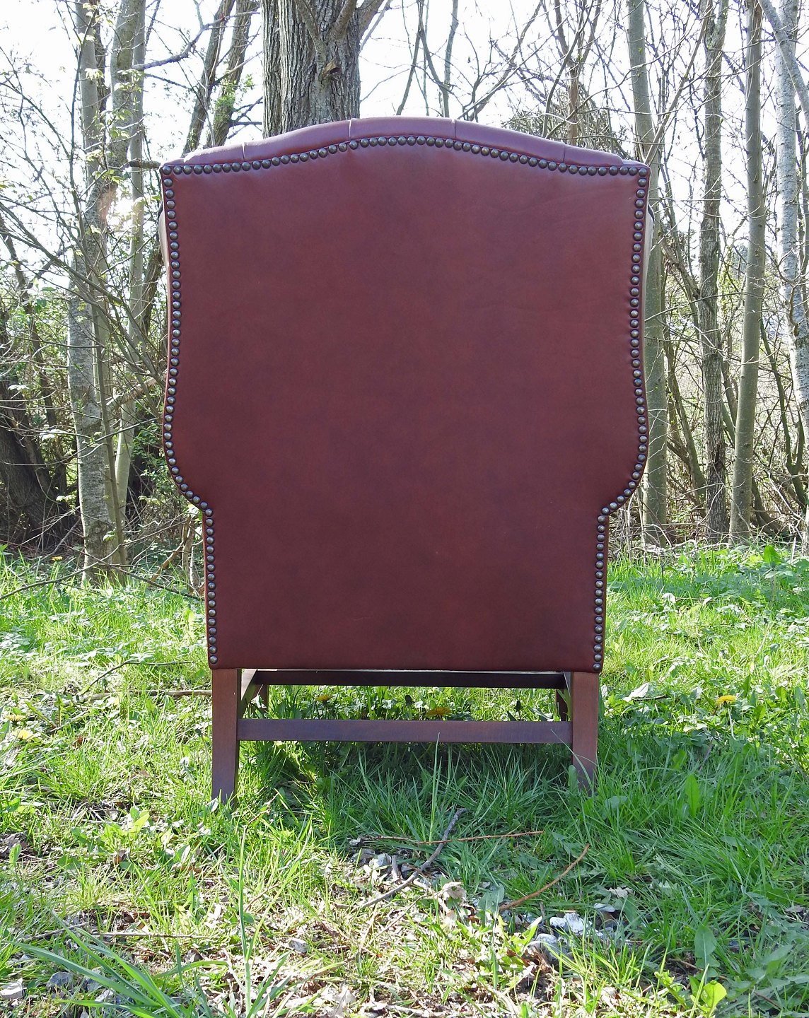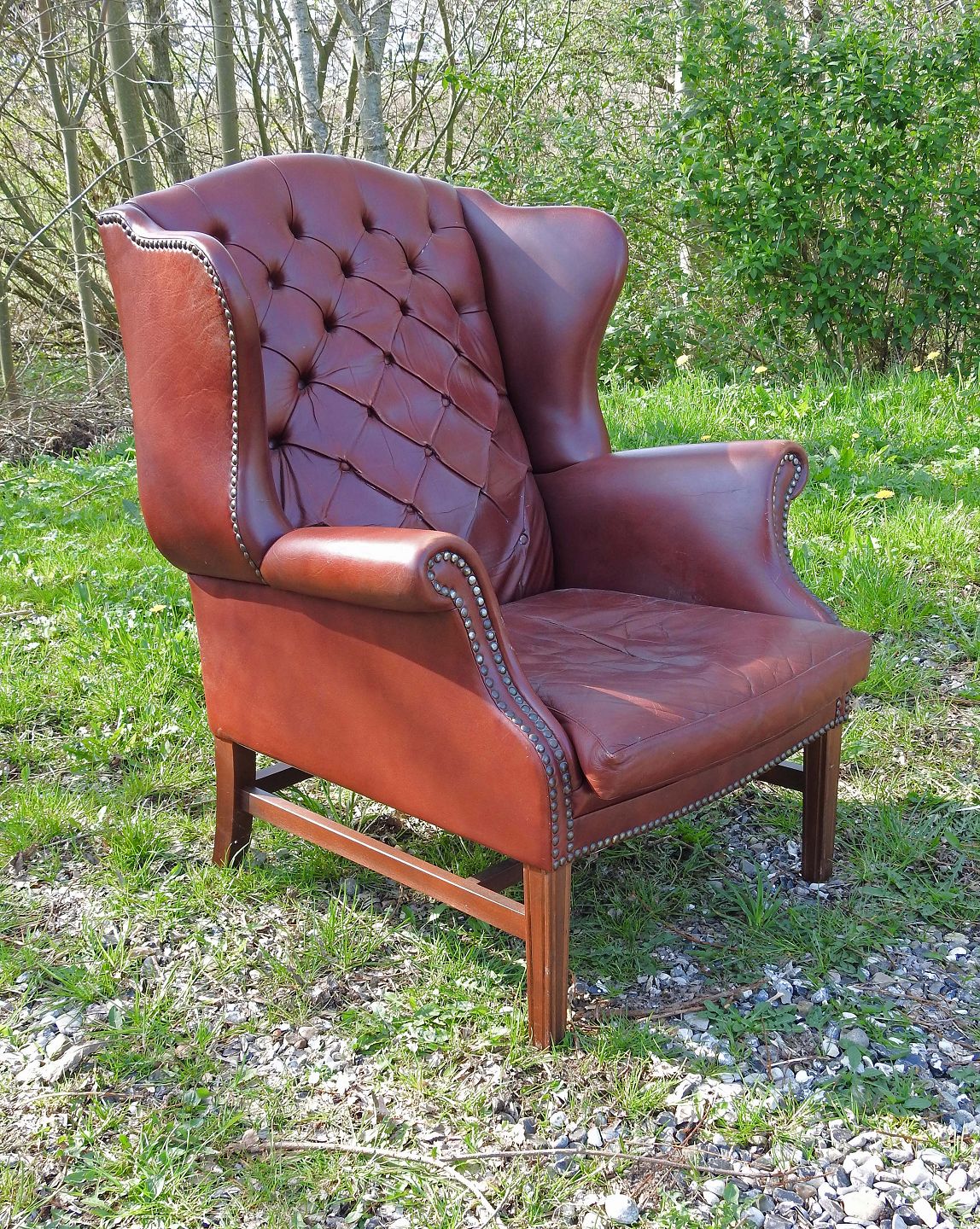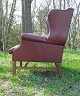 Øreklapstol, lænestol, højrygget stol, læderstol, chesterfieldstol, brun læder stol, herrestol, armstol