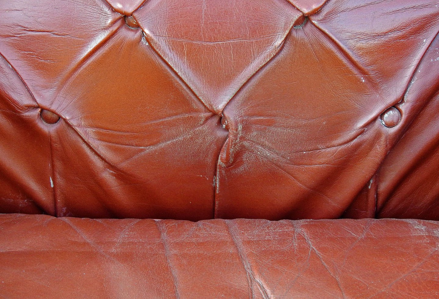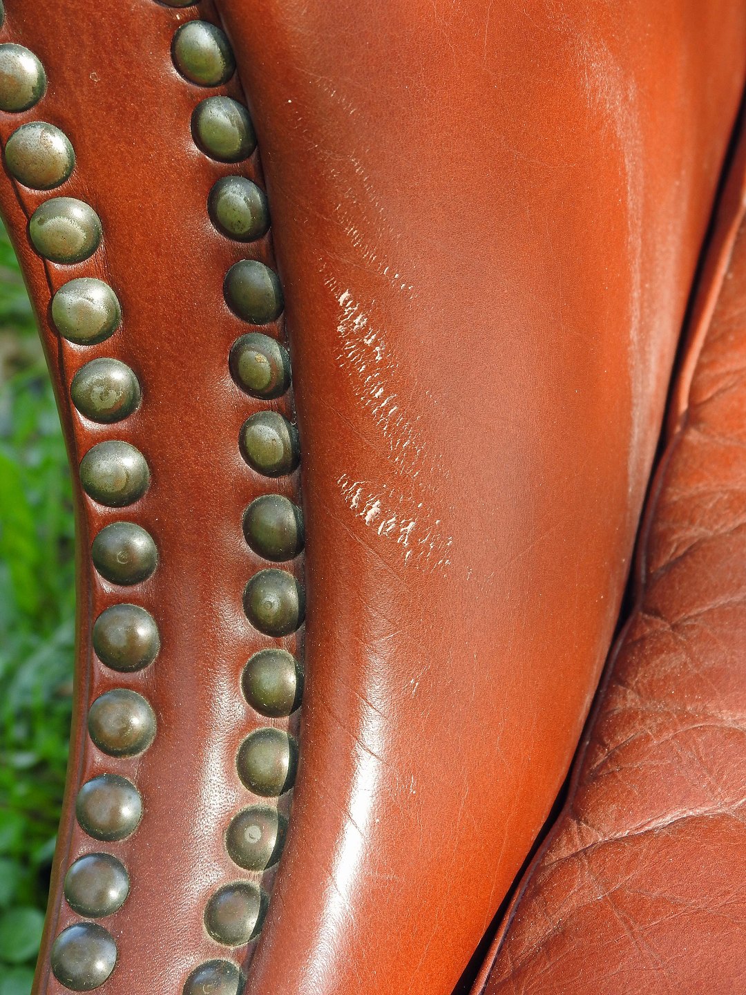 Stolen fremstår med patina og enkelte ridser på læderet ved armlæn.