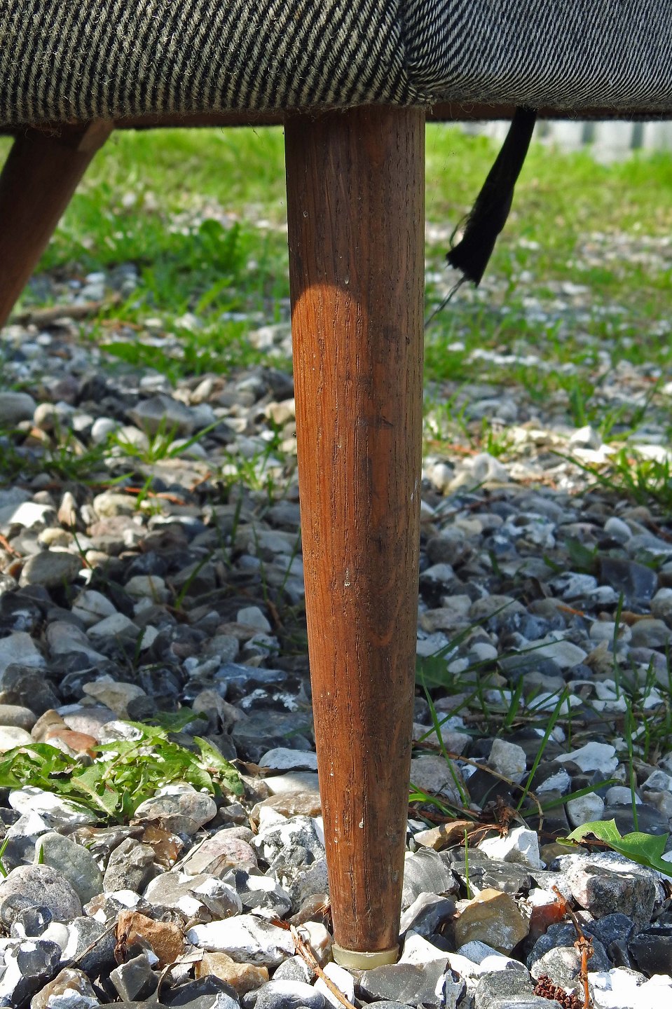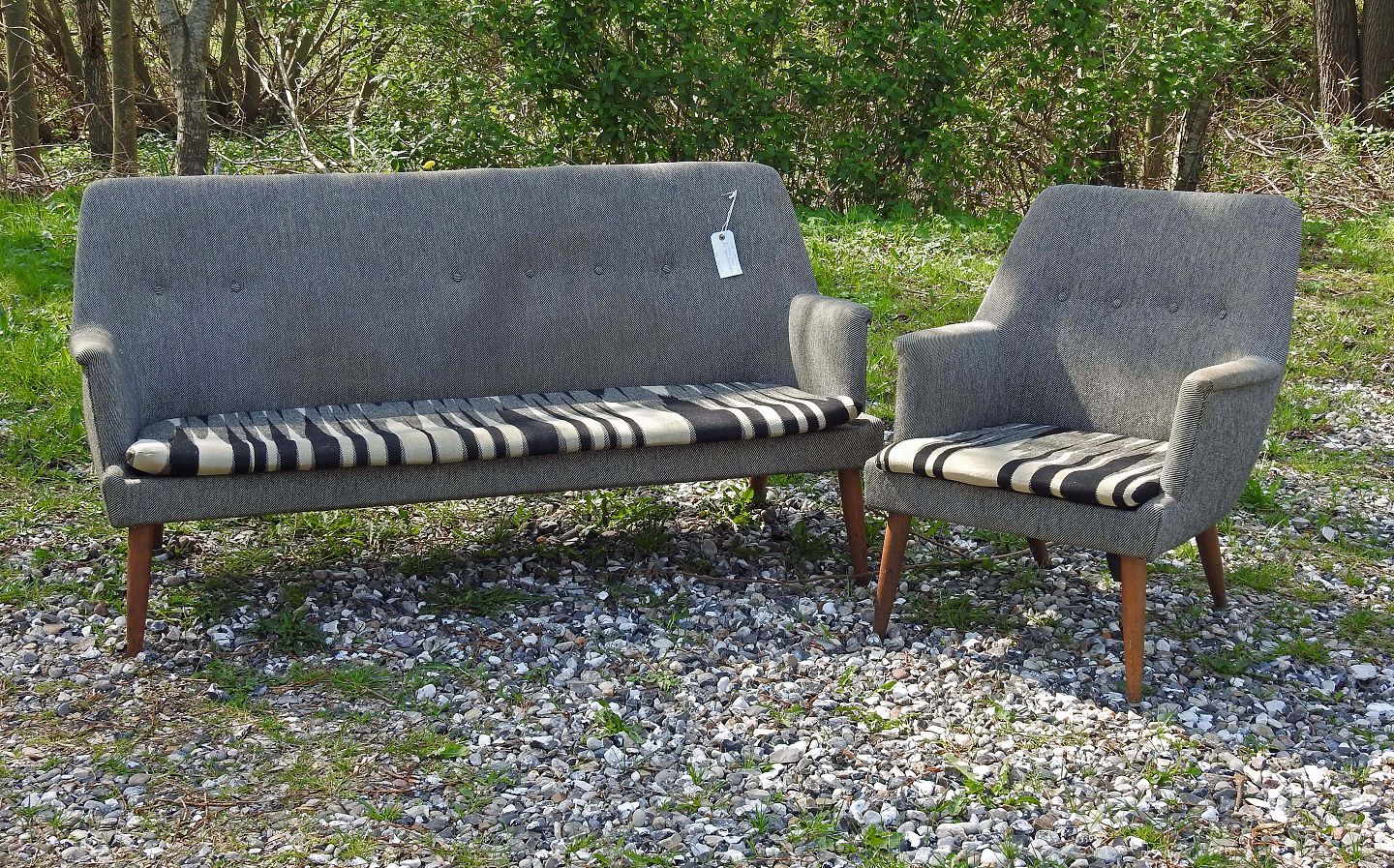 Møbelsættet er med originalt stofbetræk i uld med mønstret hynder i sort, hvid grå på gråmeleret møbel med ben i mørk olieret egetræ