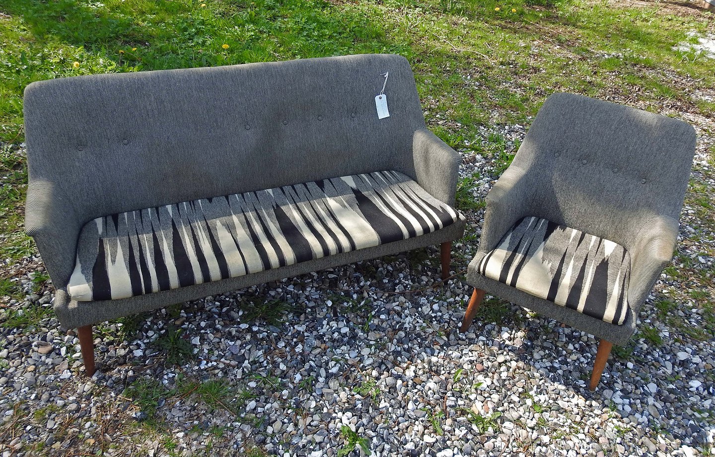 Sæt med 2,5-3 pers. sofa og lænestol fra 1950'erne med originalt stofbetræk