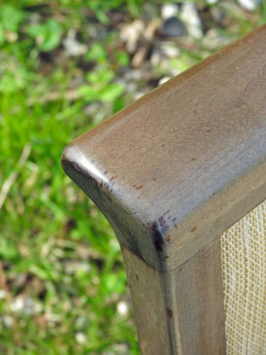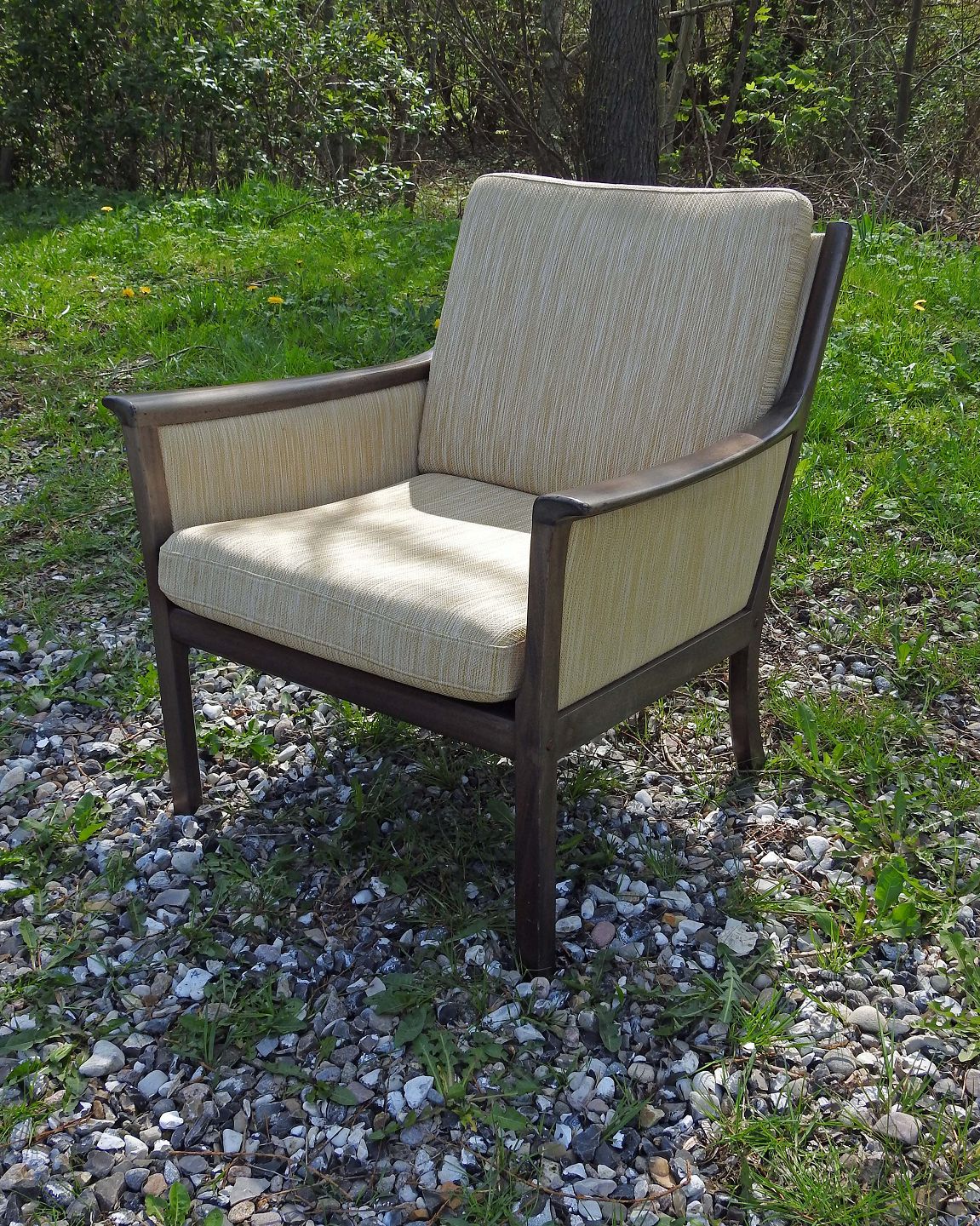 Fremstår med stel af lakeret men solbleget mahogni og intakt gyldenmeleret uldbetræk. Lettere brugsspor på ben.