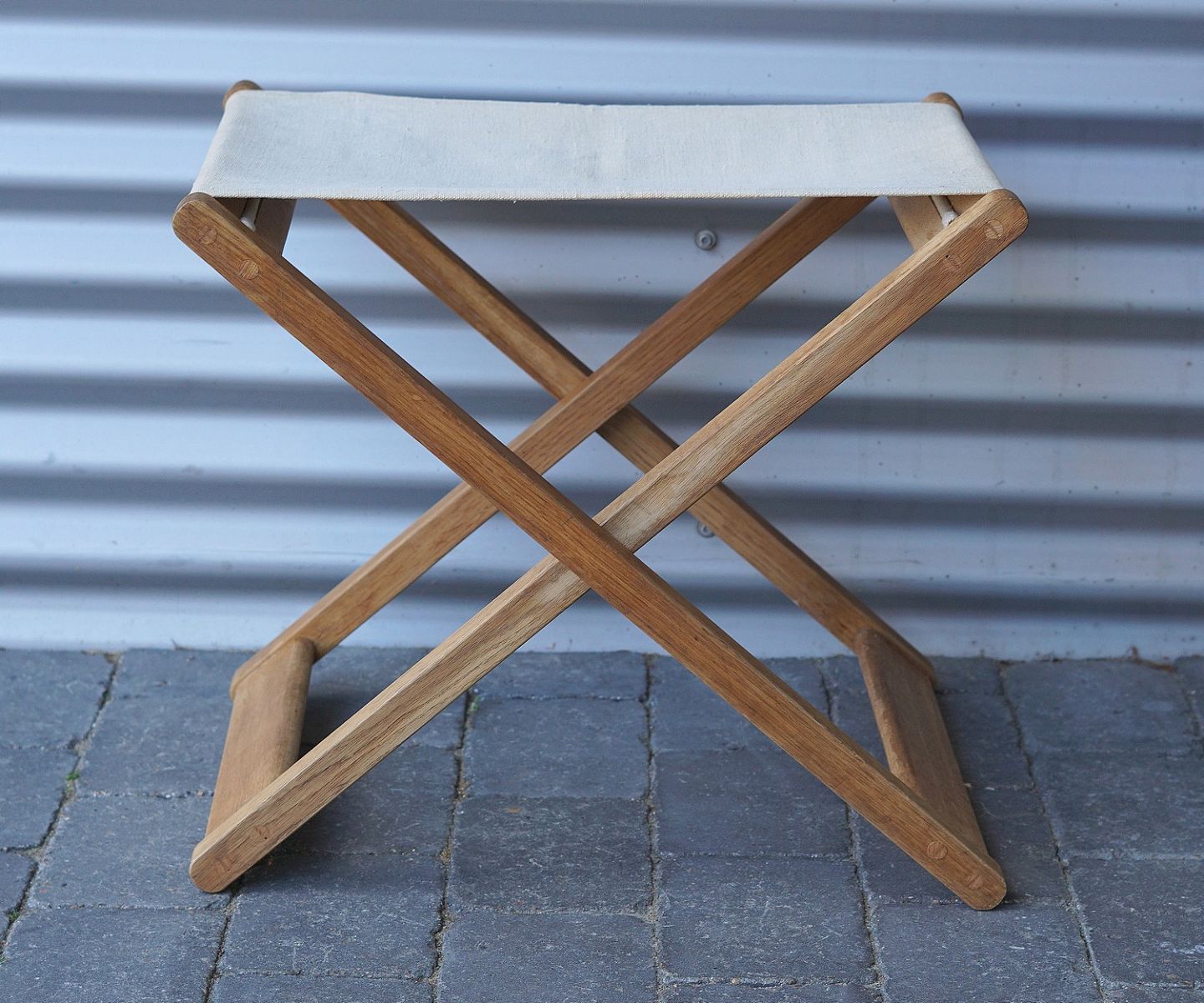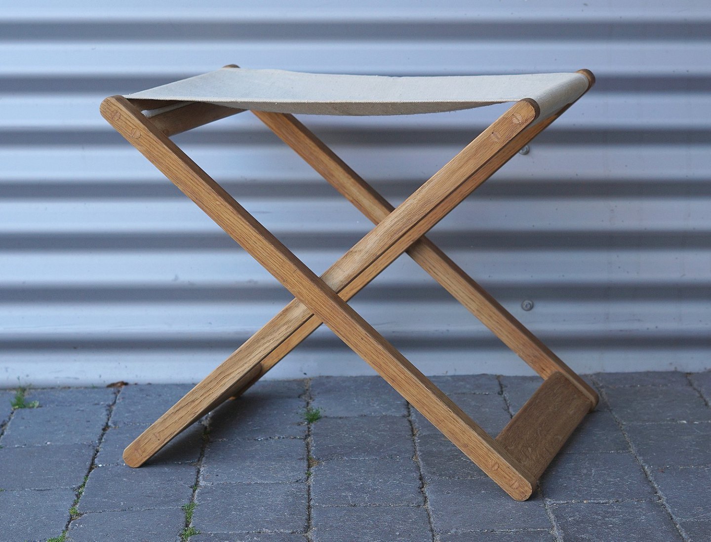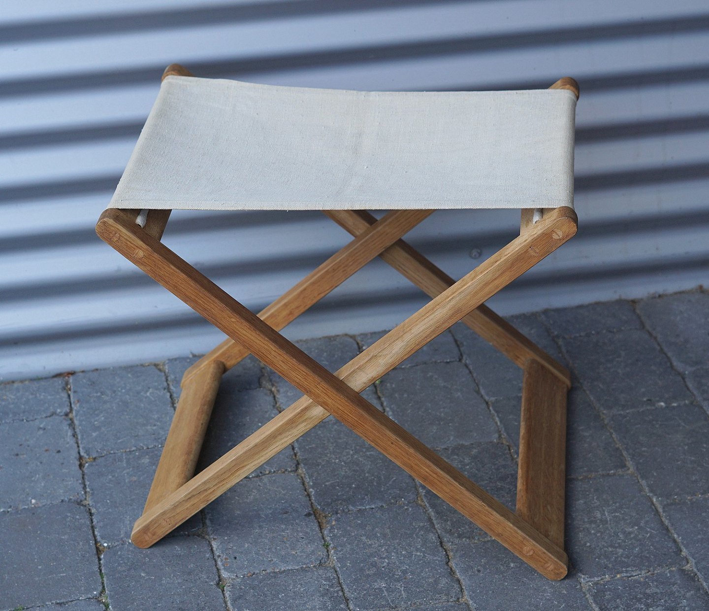 Folde taburet af egetræ, med sæde af lærredstof