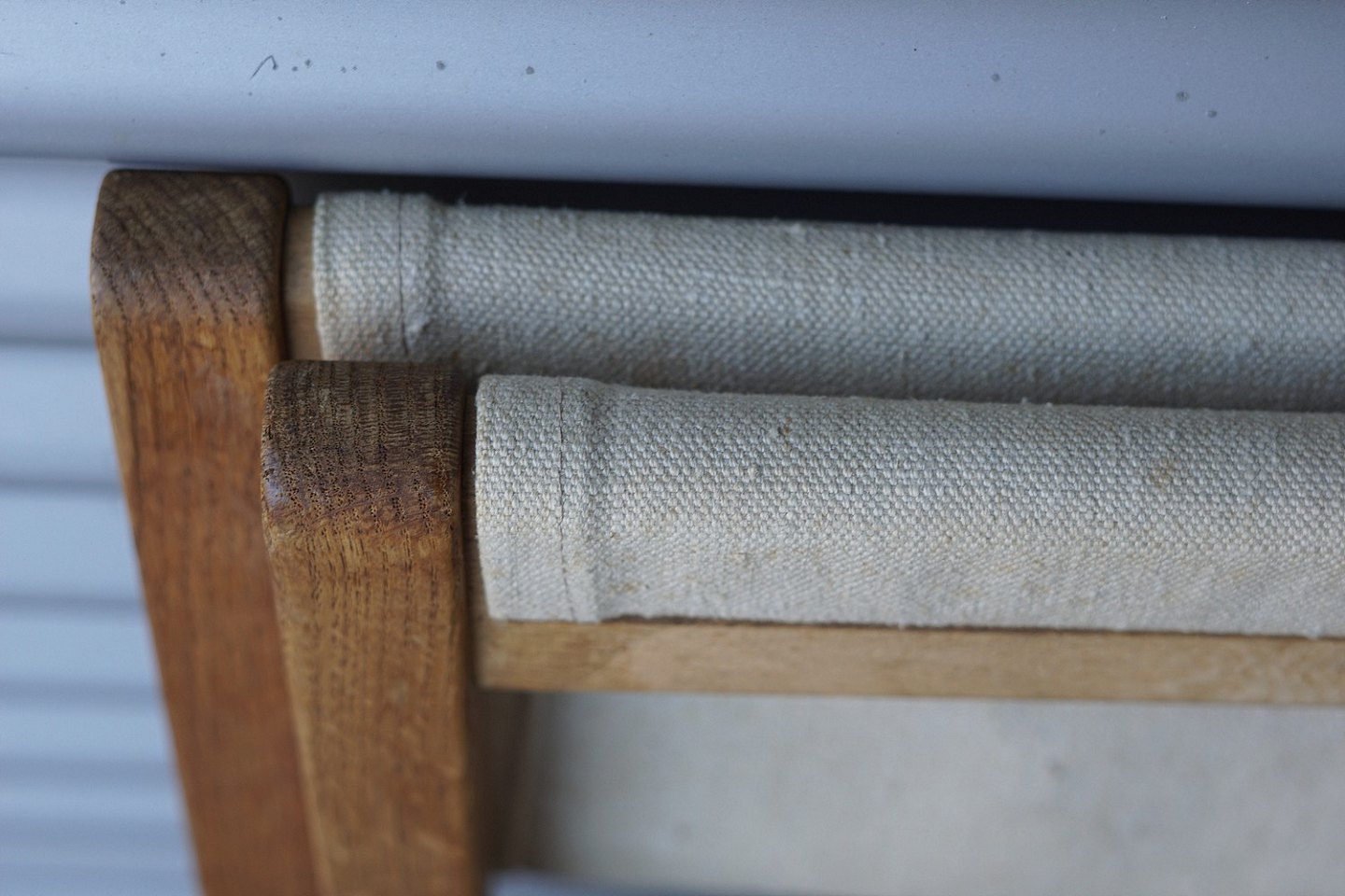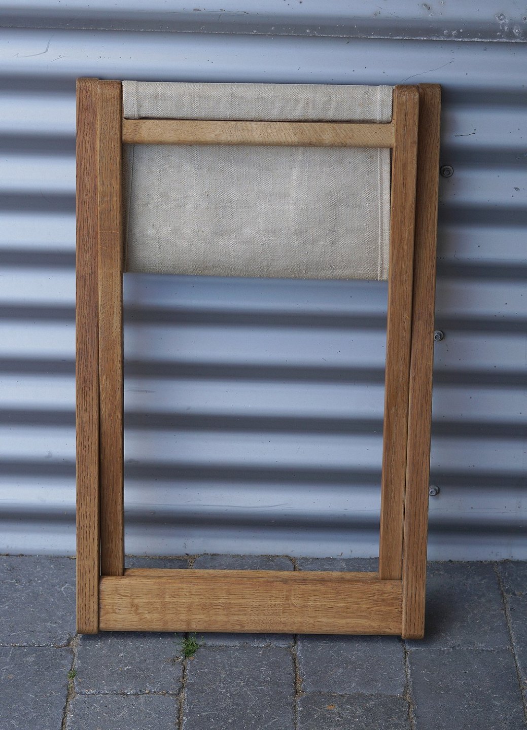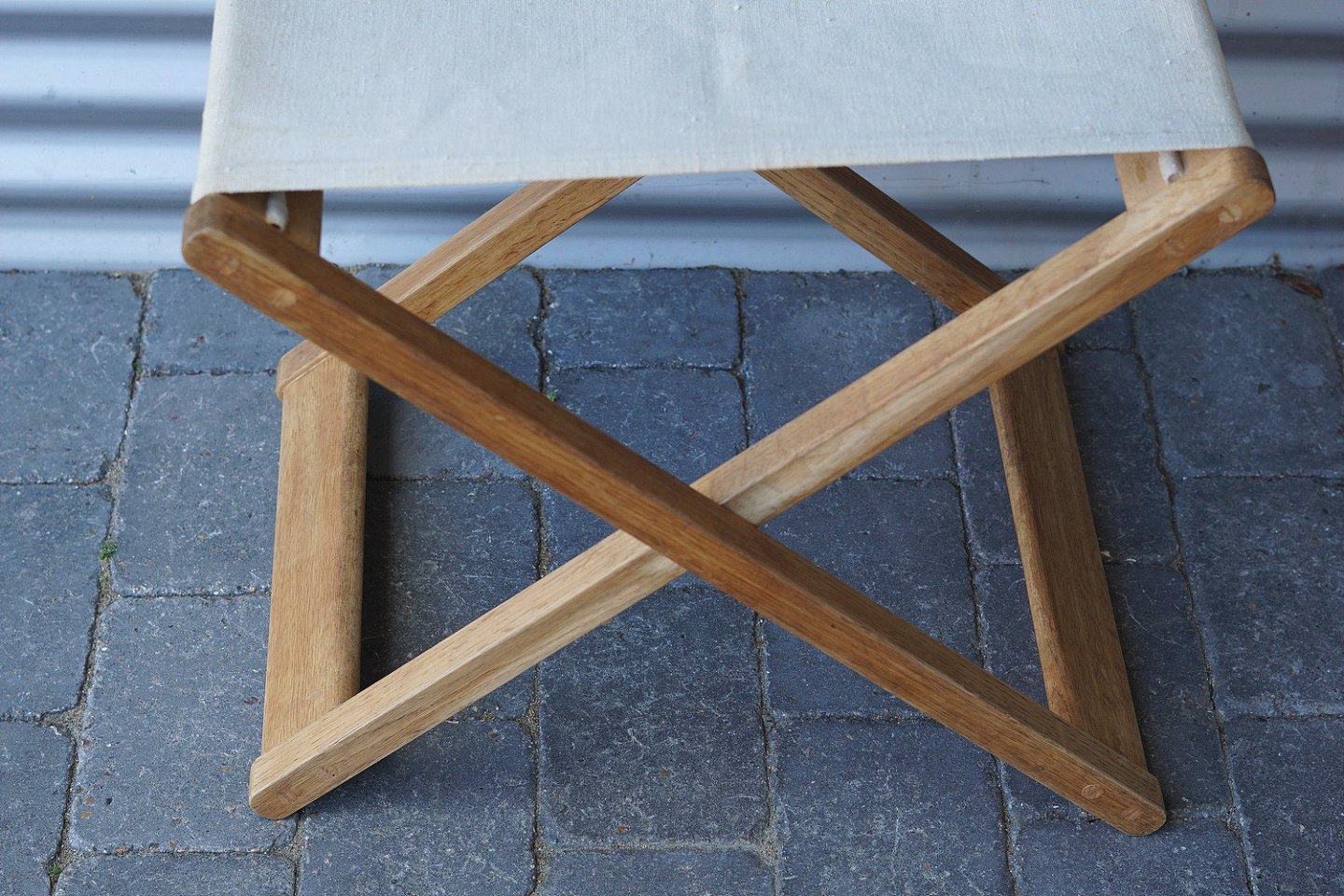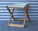 Folde taburet af egetræ, med sæde af lærredstof