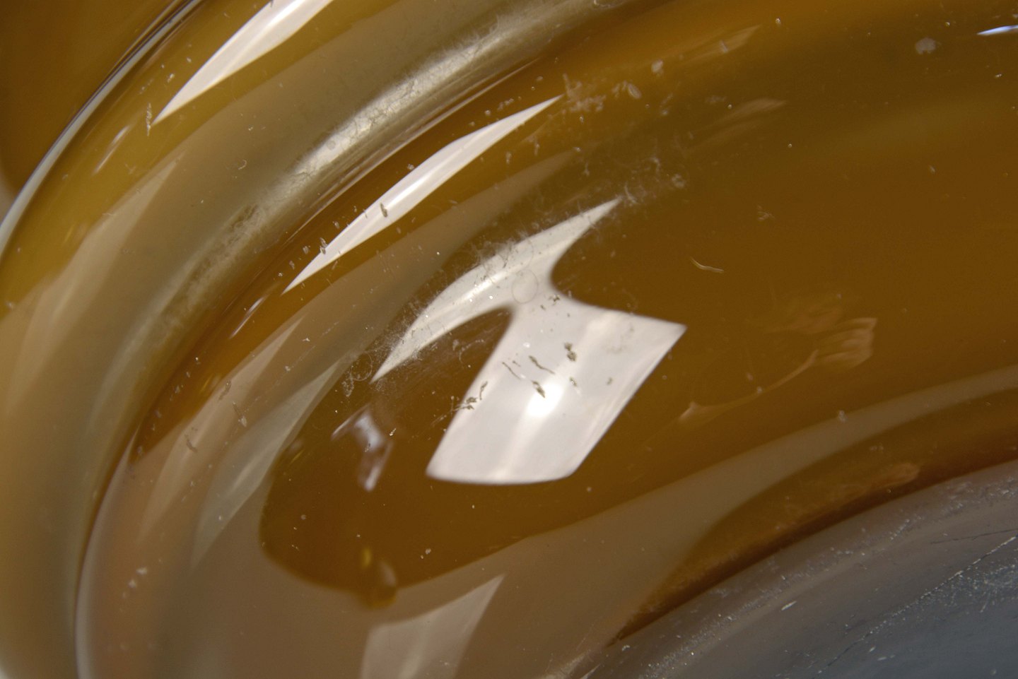 Skålen fremstår med brugsspor på overlagsglasset ellers intakt.