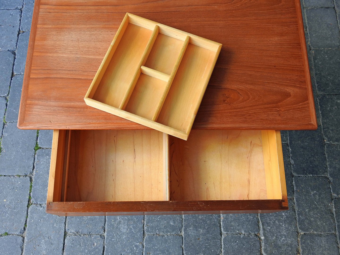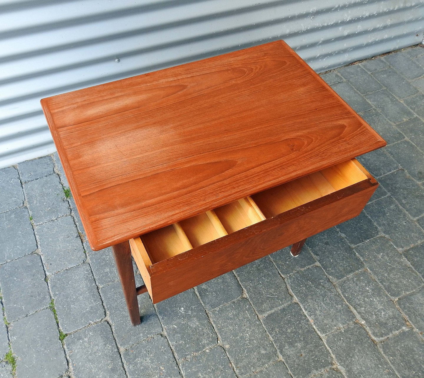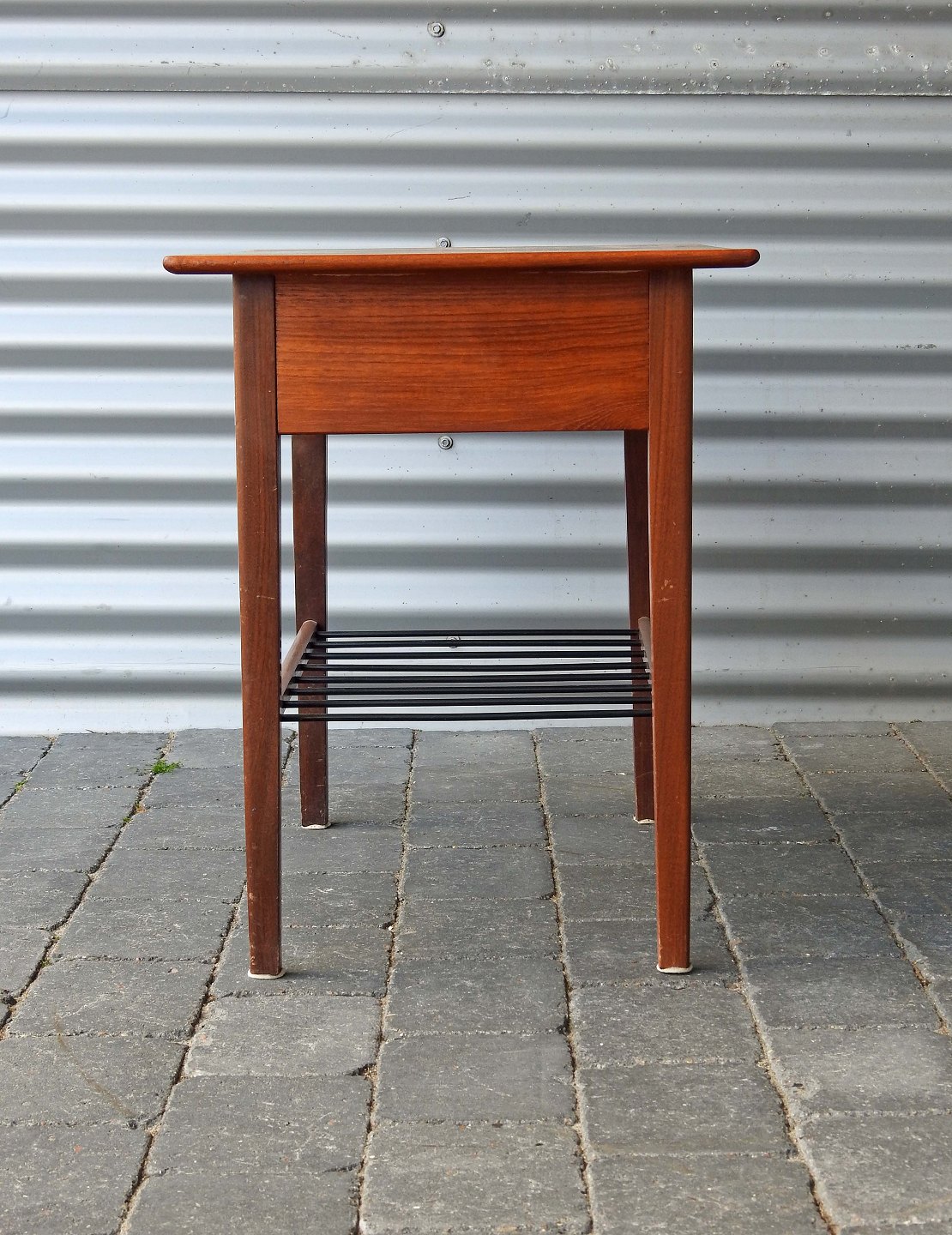 Sybord i teaktræ med tremmehylde og indsatskuffe