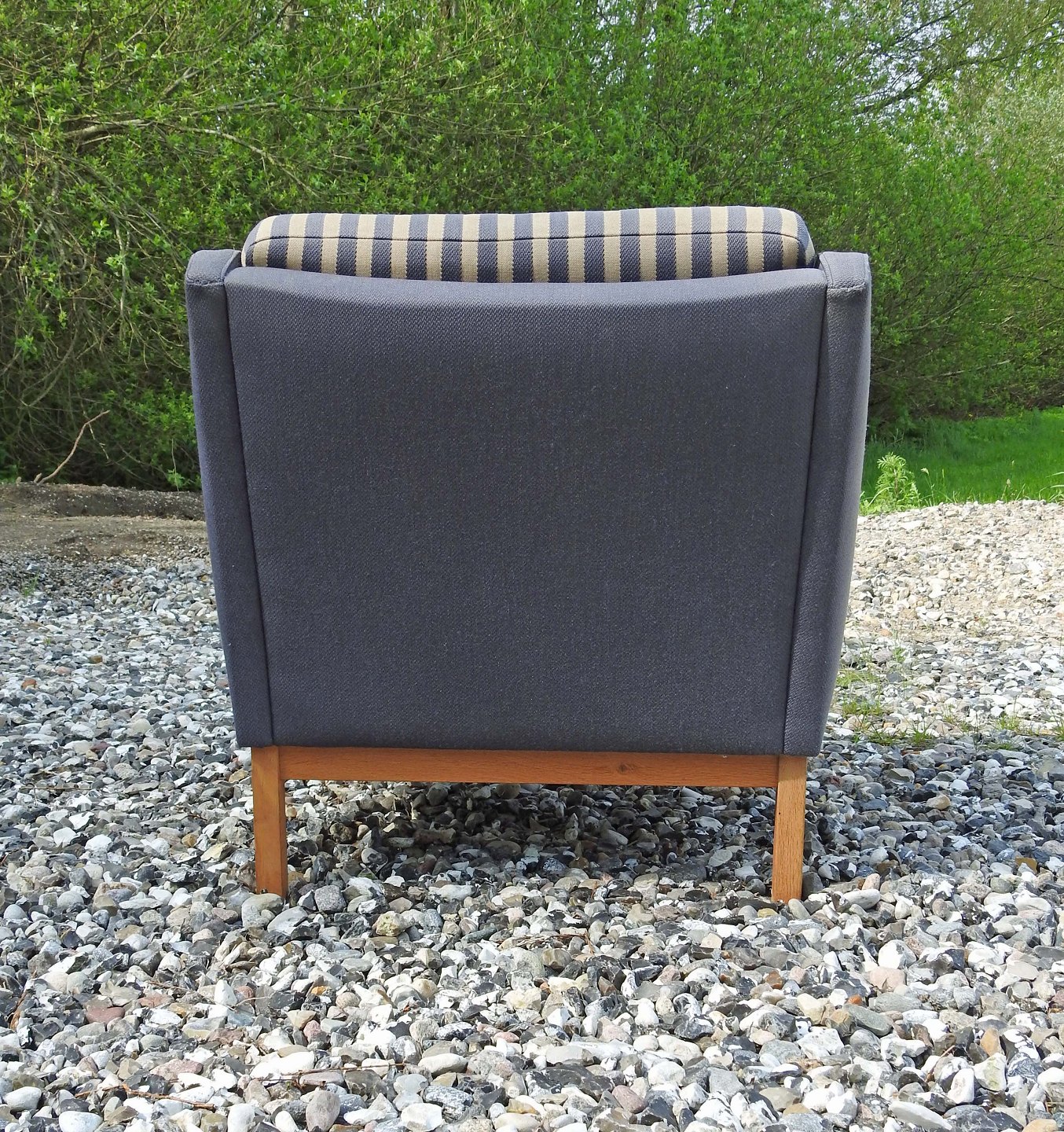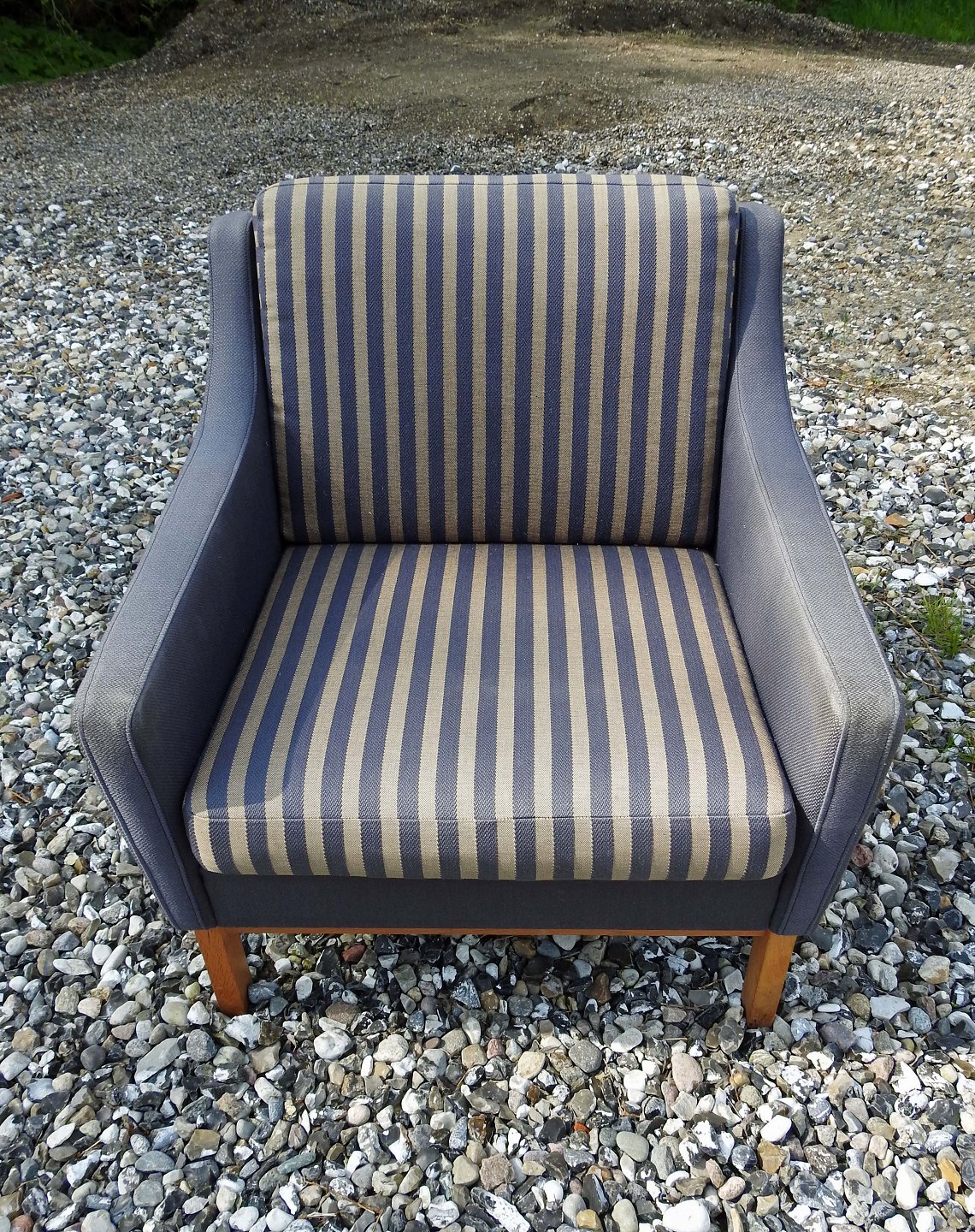 Fremstår med intakt stofbetræk med lettere slid ved armlæn og brugsspor på ben