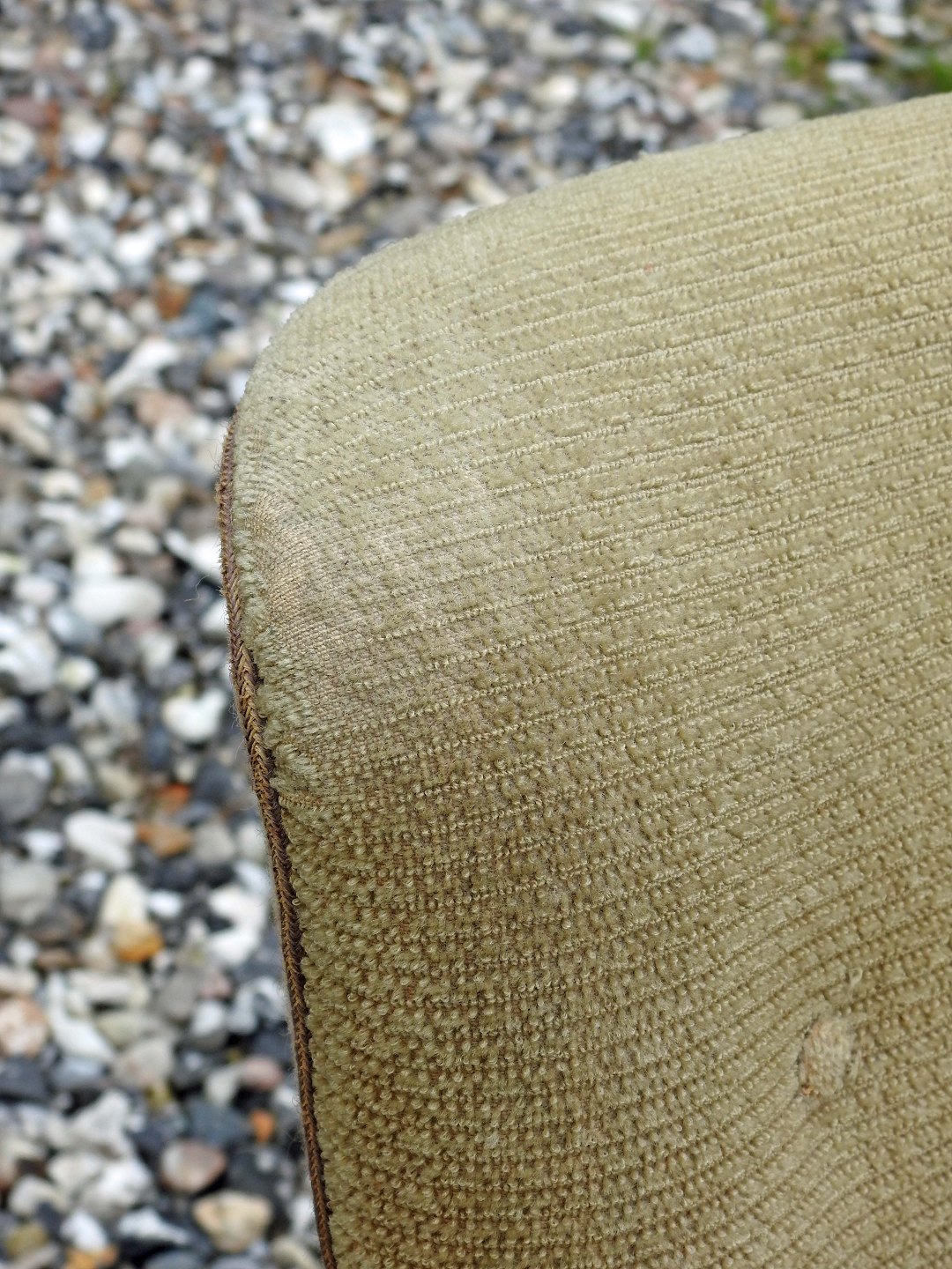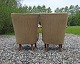 Fremstår med brugsspor på stel, lettere slid på stof i kant af ryglæn mindre hul i stoffet på den ene stol