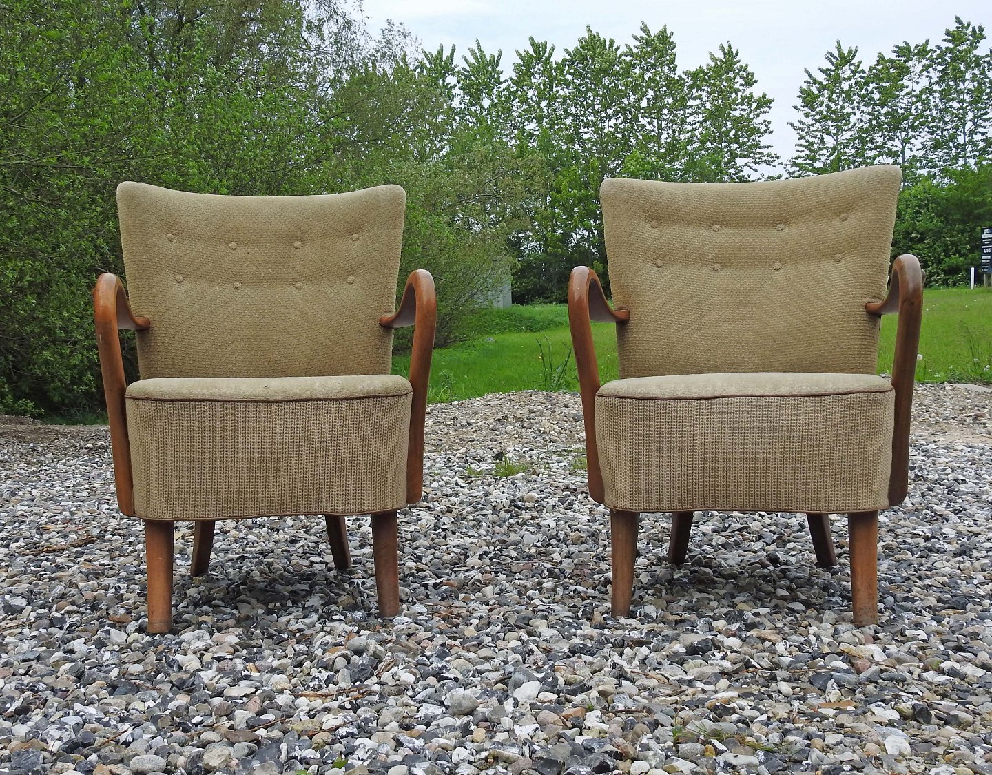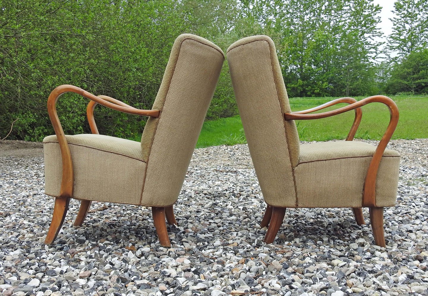 Et sæt lænestole i bejdset bøgetræ med svungne armlæn og polstret af Alfred Christensen