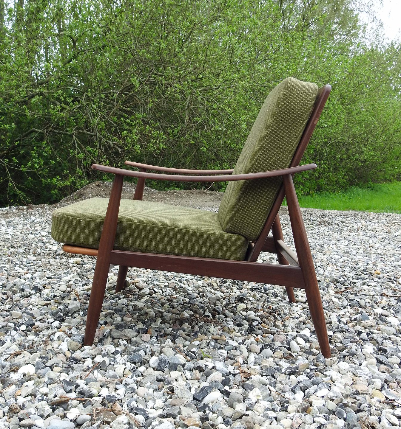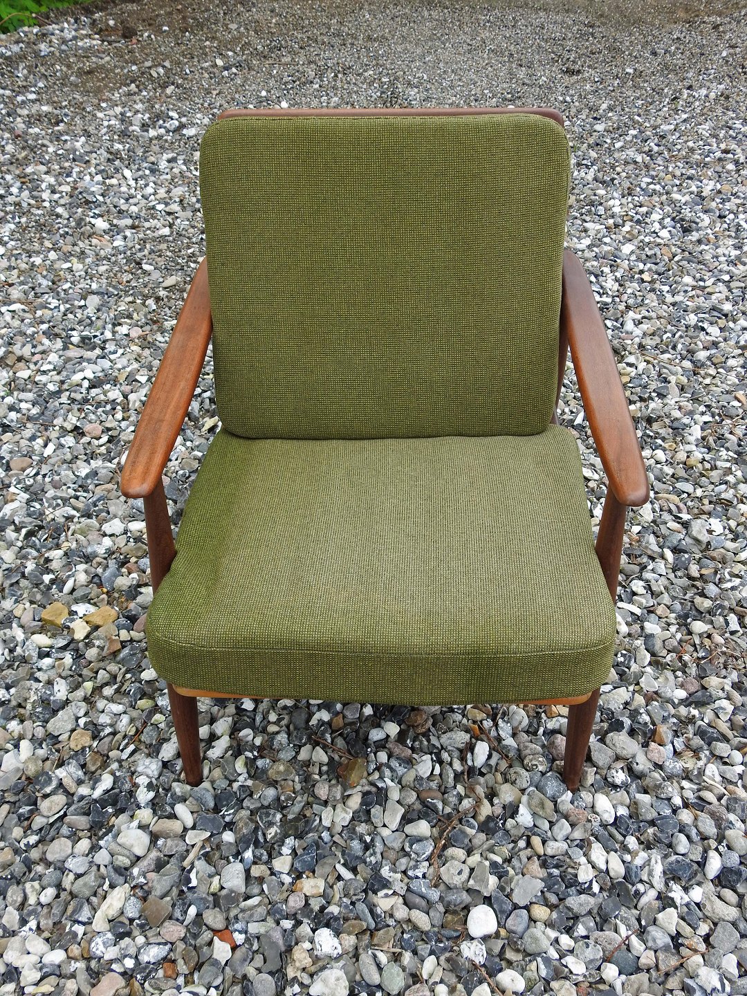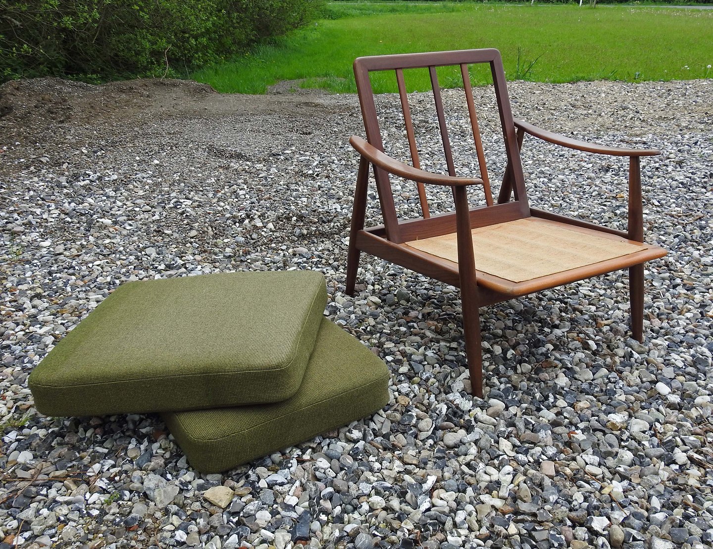 Lænestol i teaktræ med polstret hynder i grønt uldstof