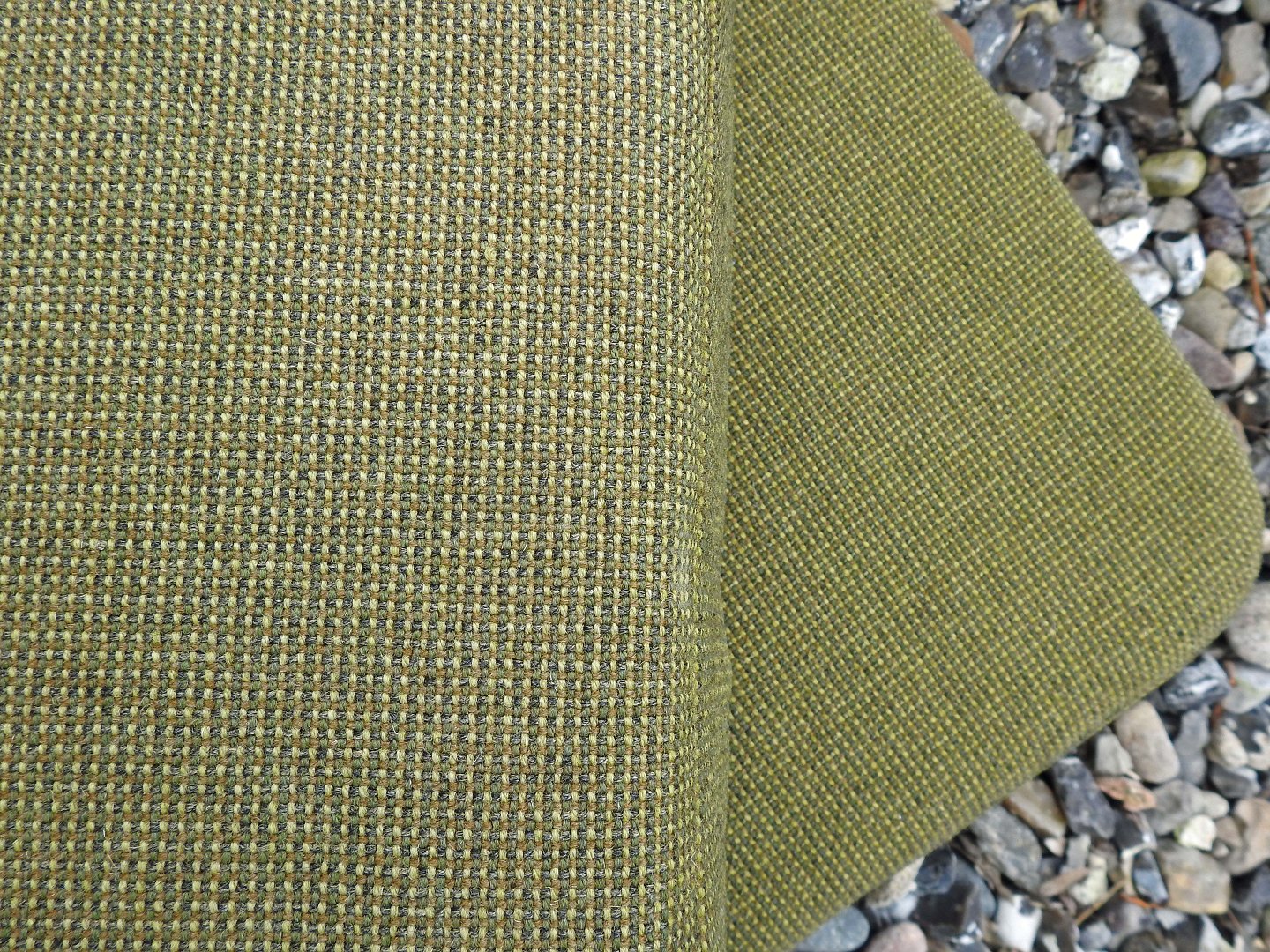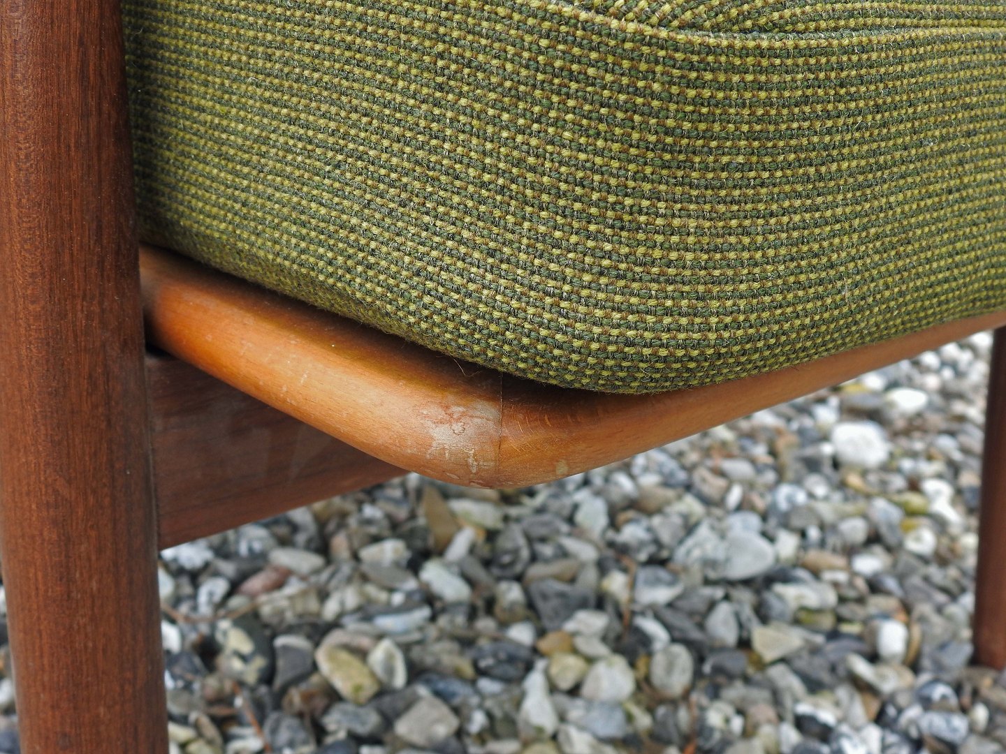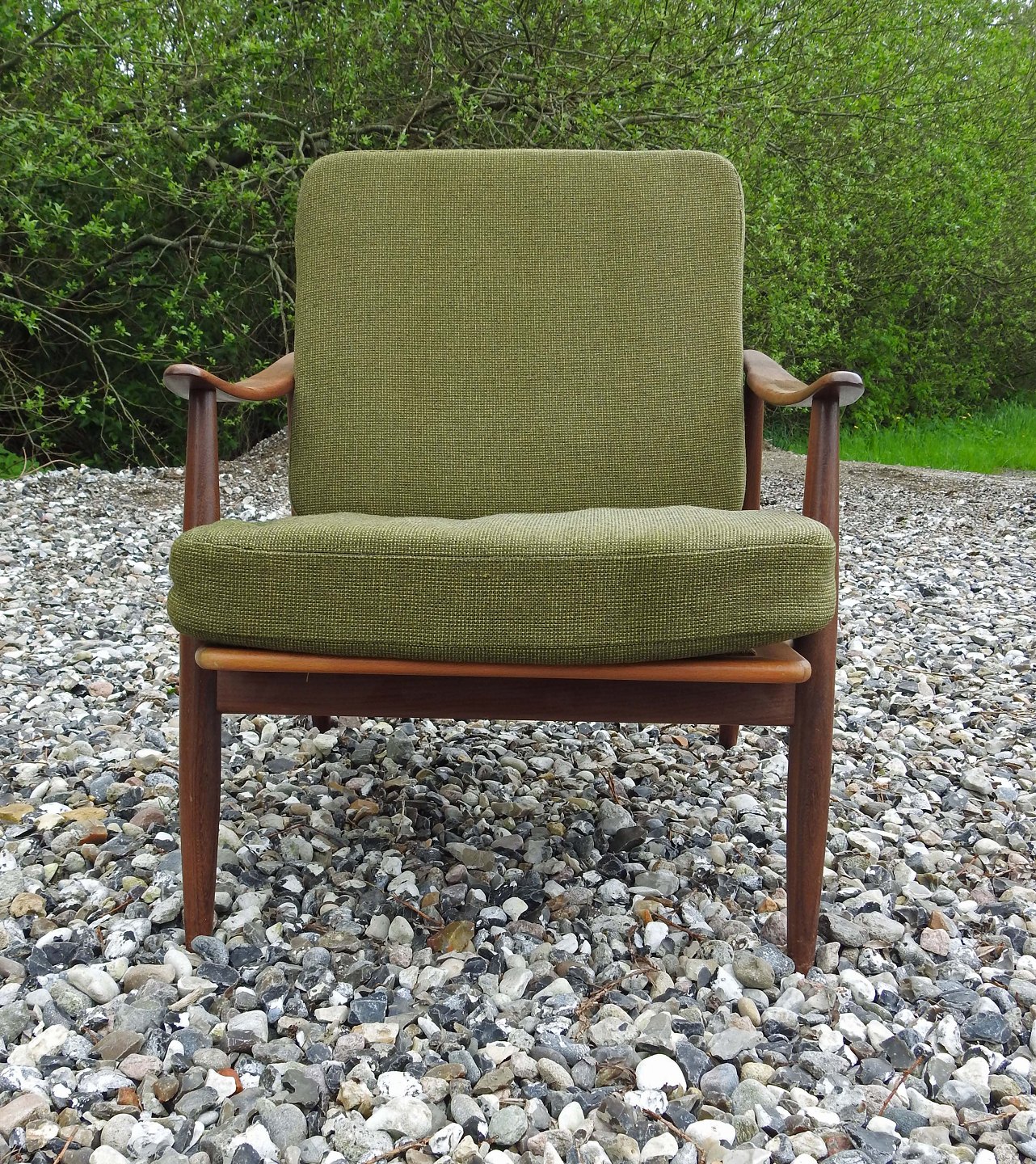 Lænestol i teaktræ med polstret hynder i grønt uldstof