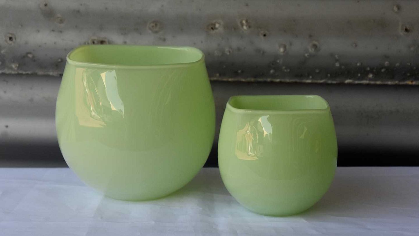 Quadro Urtepotteskjulere med tøndeformet glat korpus og 4-kantet rand. Mintfarvet glas med klart overfang. urtepotter fra serien Quadro