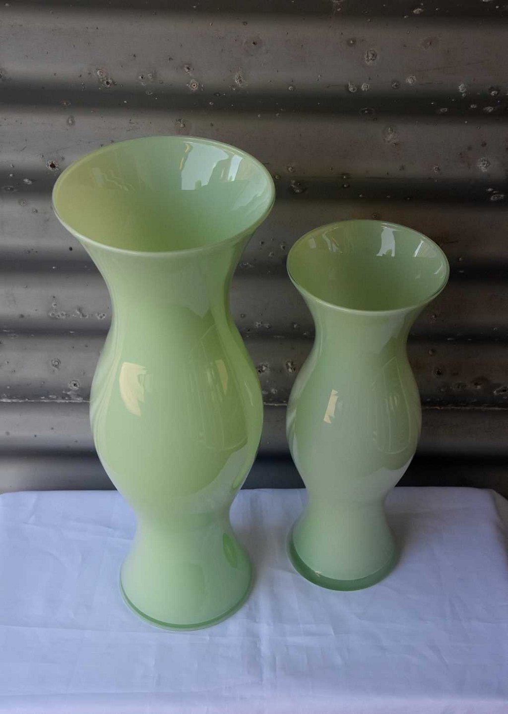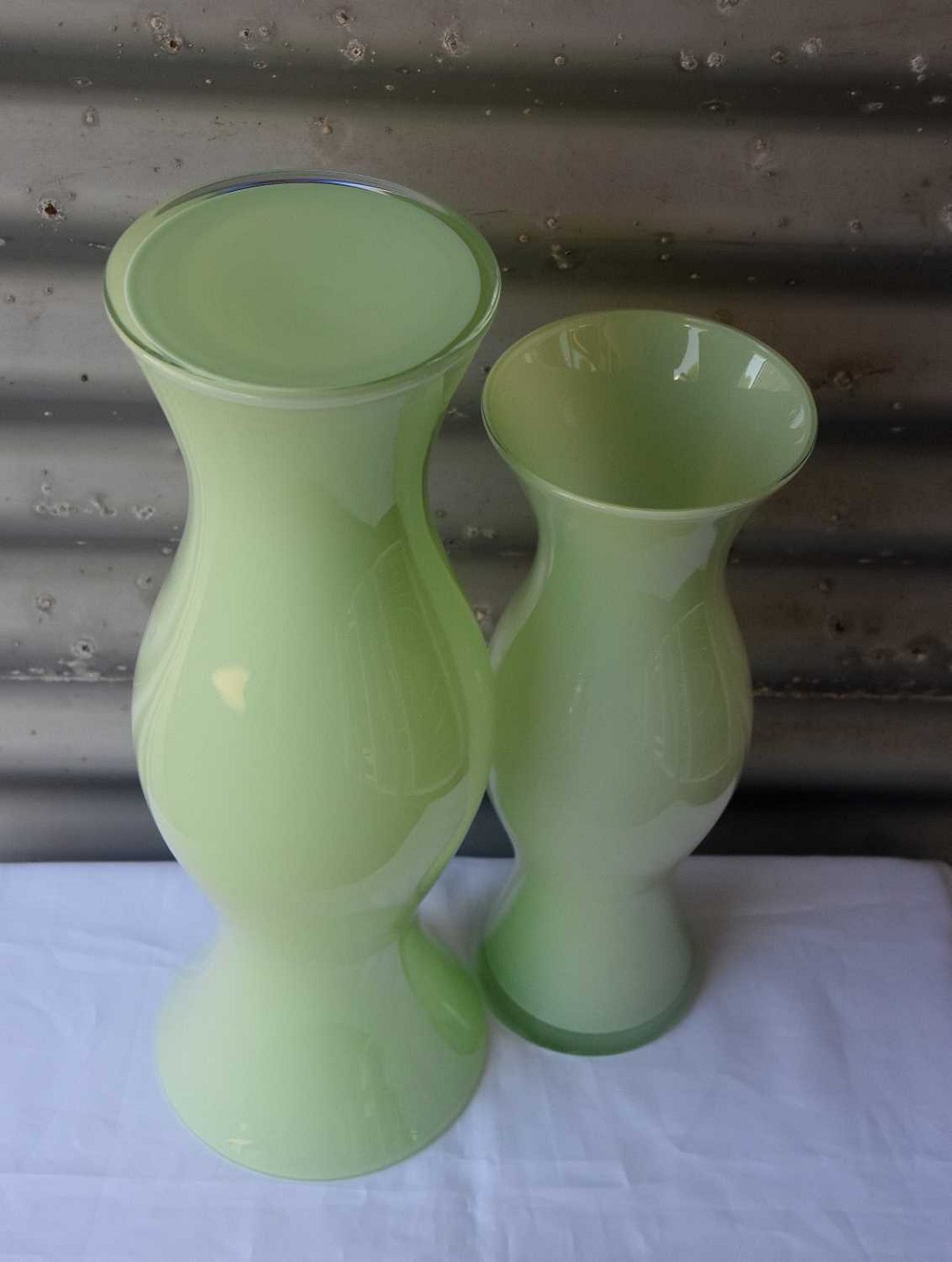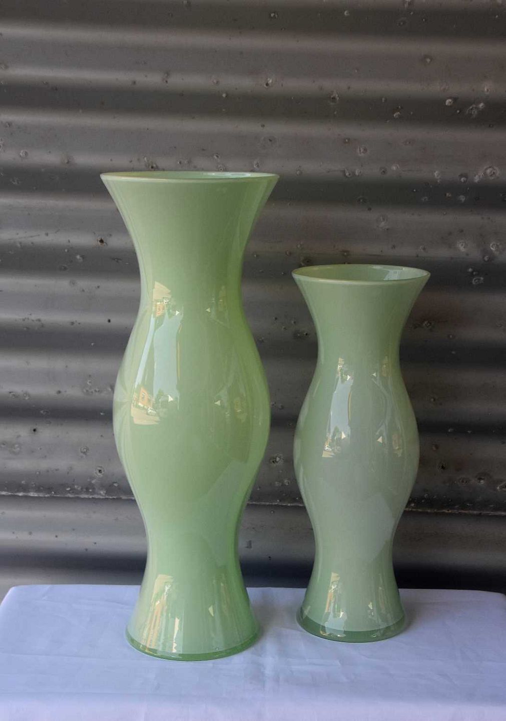 Mintgrønne vaser, Quadro, stor og lille vase med klart overfang. Cylindrisk/konveks. Blæst i form og gerbaudsprængt