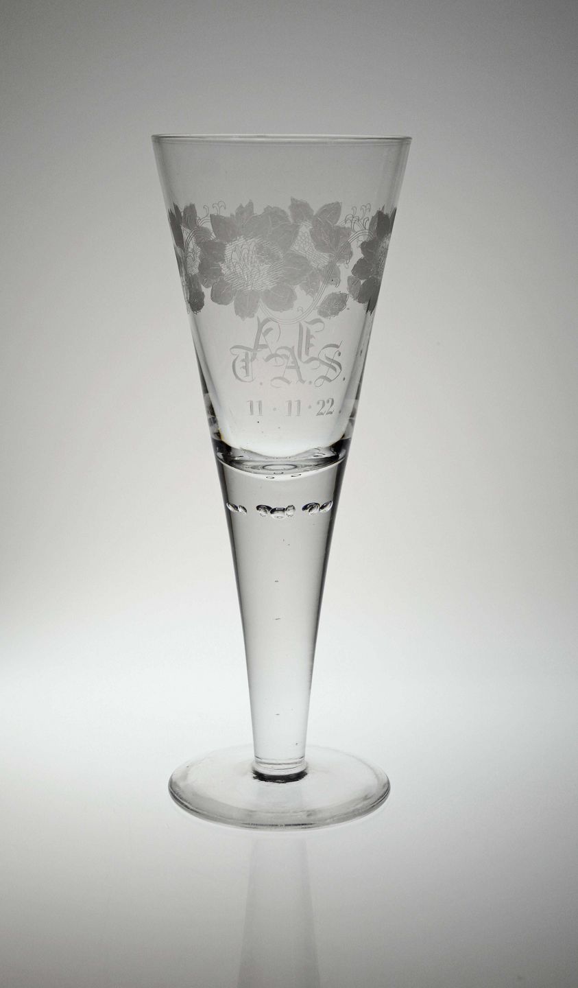 Pokalglas med blomster, bogstaver og dato 11-11-22. Glasset er glattet i bund. En ring af små luftbobler under kummen. Se figur 163 hvid glasbog. Kastrup Glasværk.