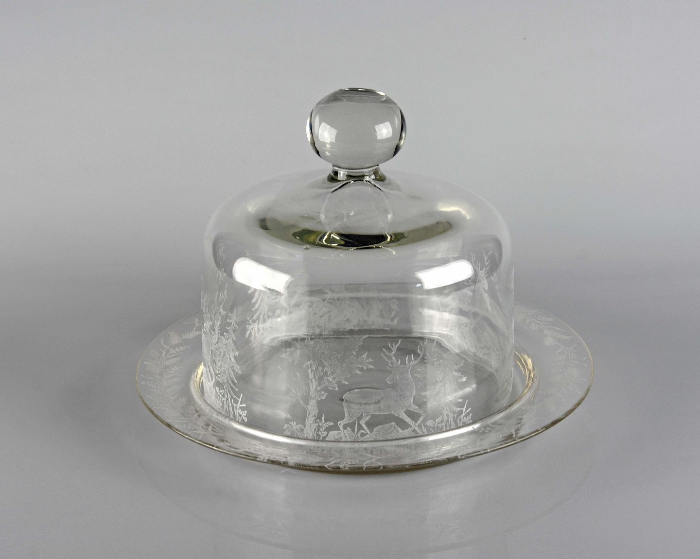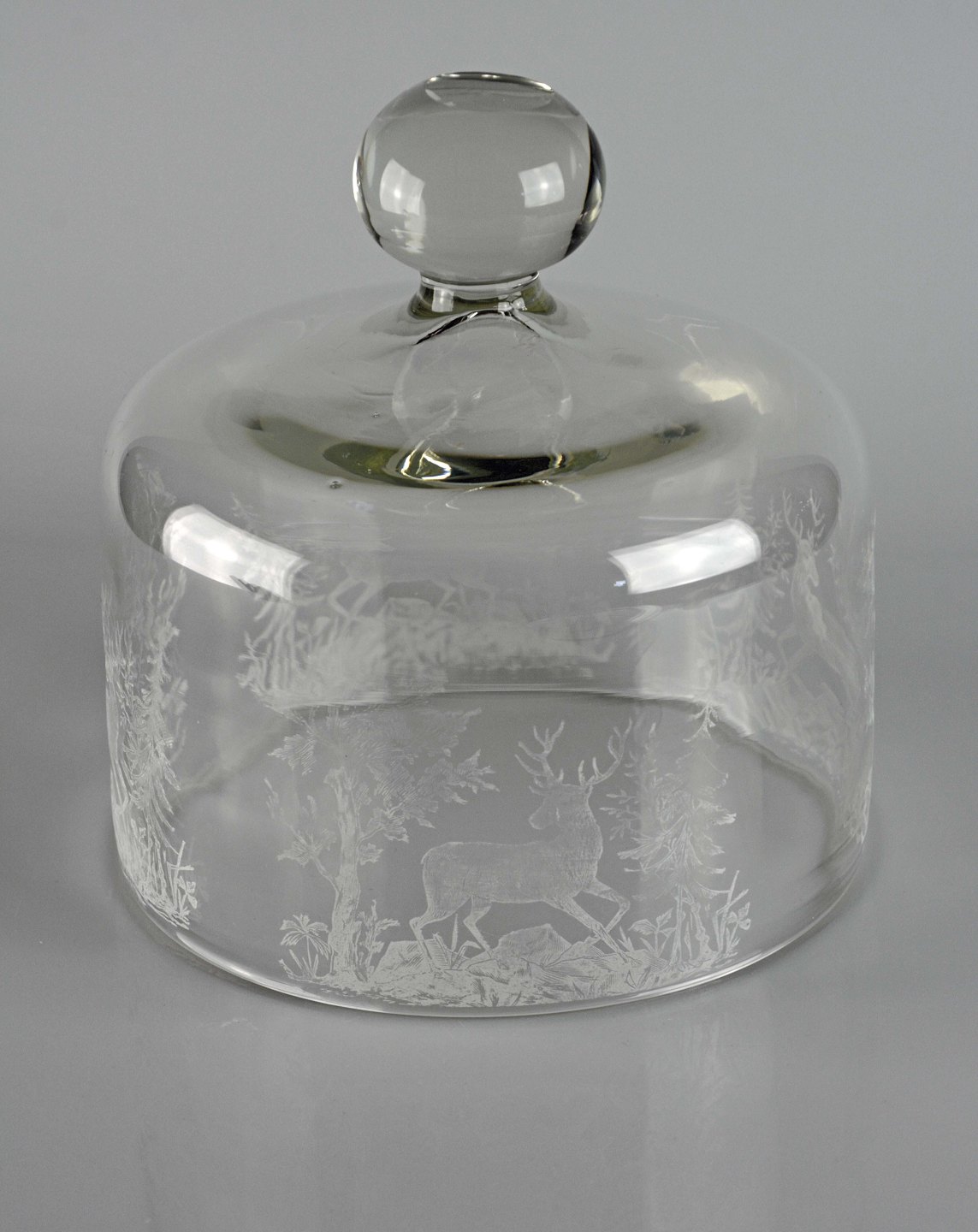 Osteklokke i glas med motiv af rådyr og skov fra Kastrup Glasværk ca. 1910. ætset motiv.