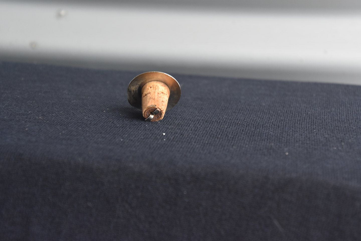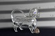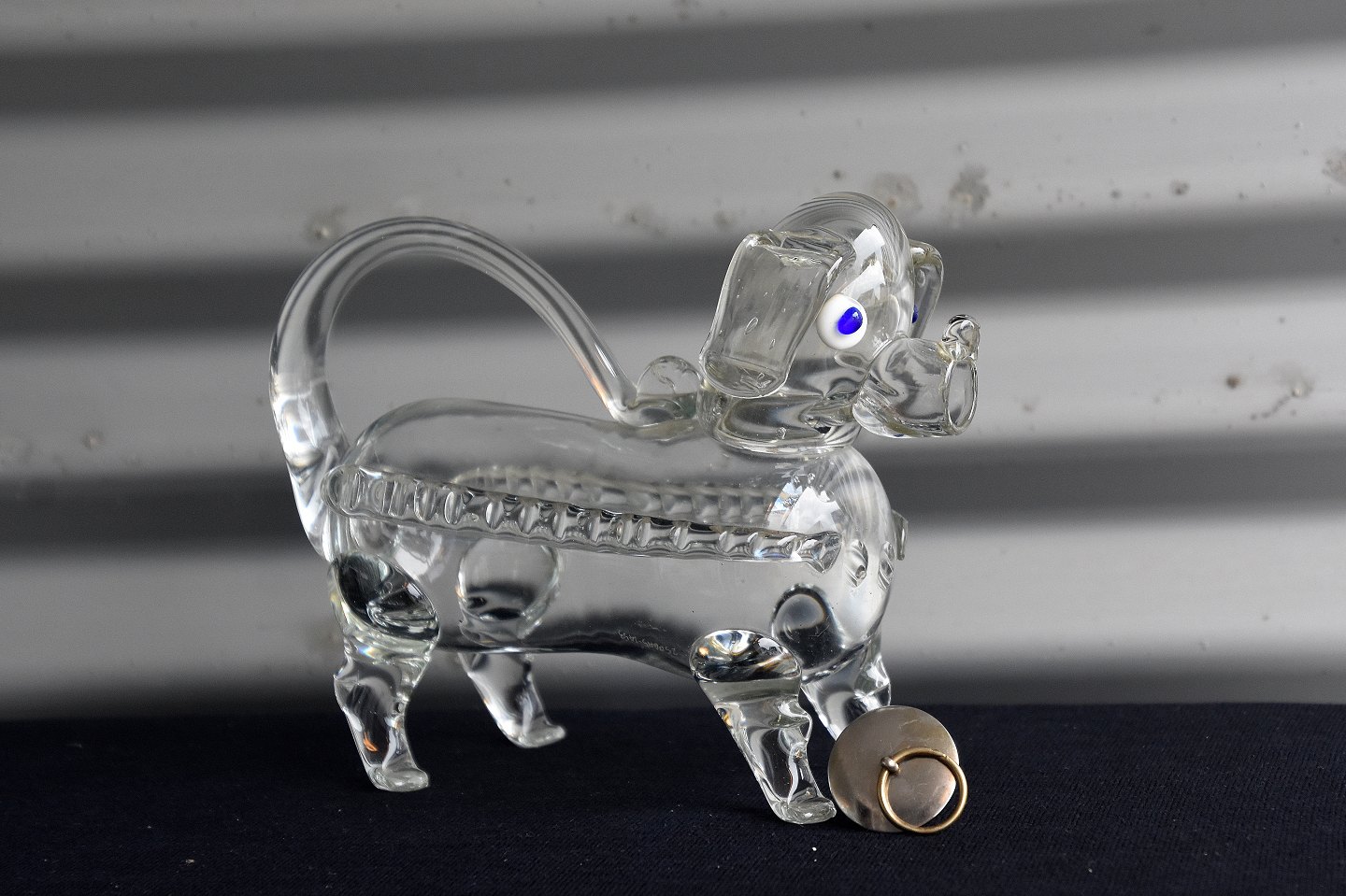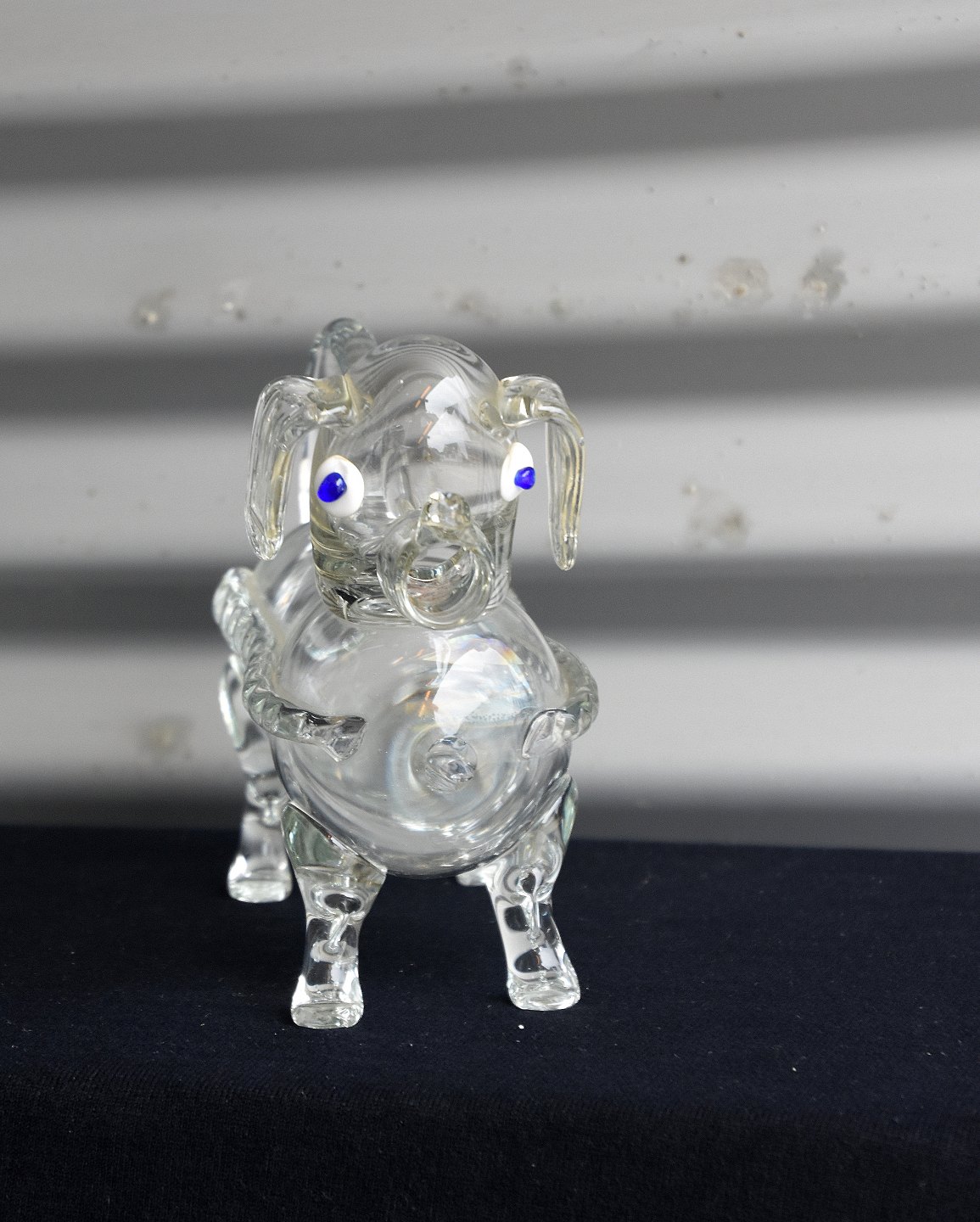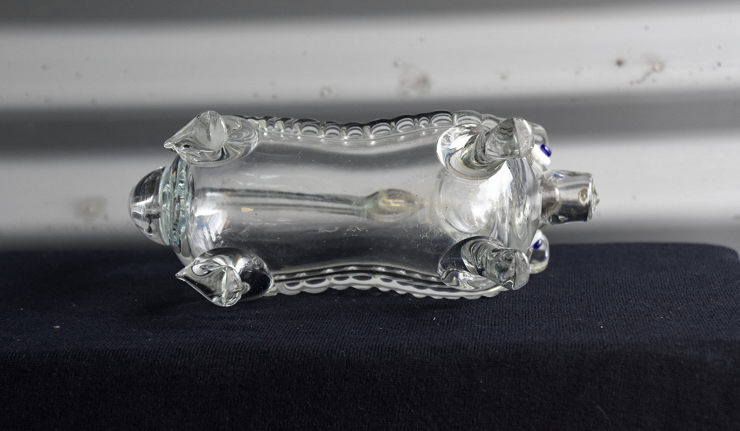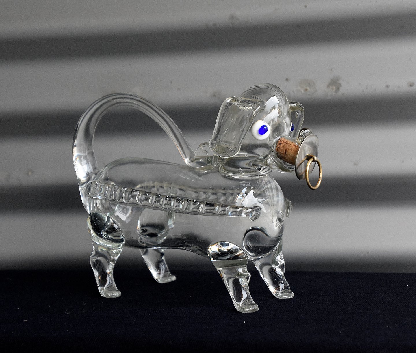 Brændevinskaraffel "Fyldehund". Lang rørformet krop med tandetlister på siderne, afsnøret hoved med påsatte ører, stive påsatte ben. den drevne snude er til at hælde af. Opalhvide øjne med blå pupiller.