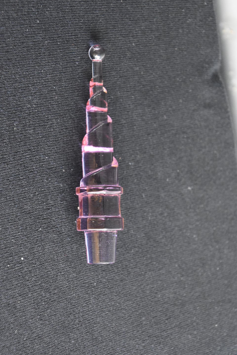 Karaffel i serien Byens Tårne, "Vor frelser Kirke". Kugleformet karaffel med prop af "Vor Frelser Kirkes" spir, proppen er svagt lilla.
