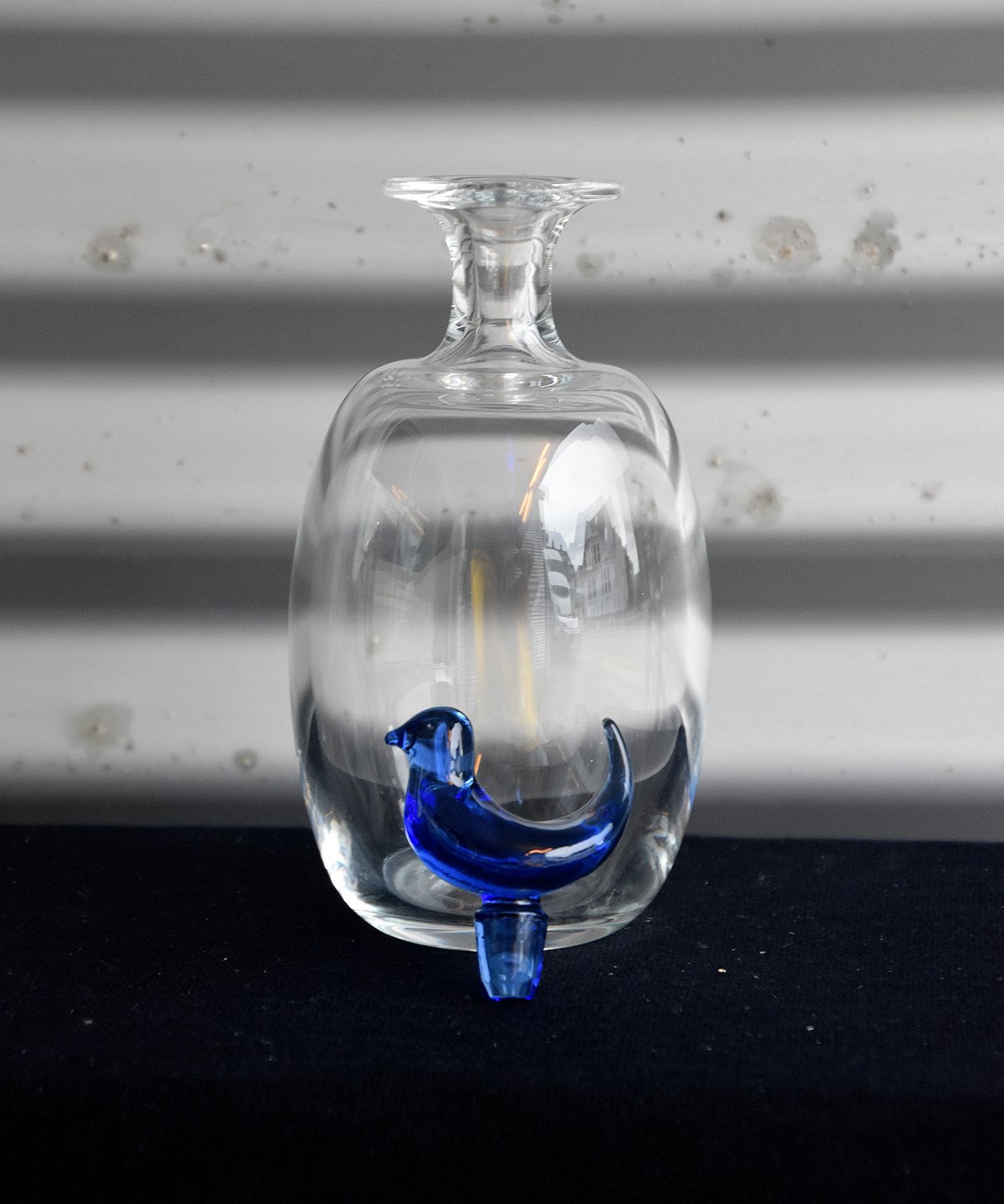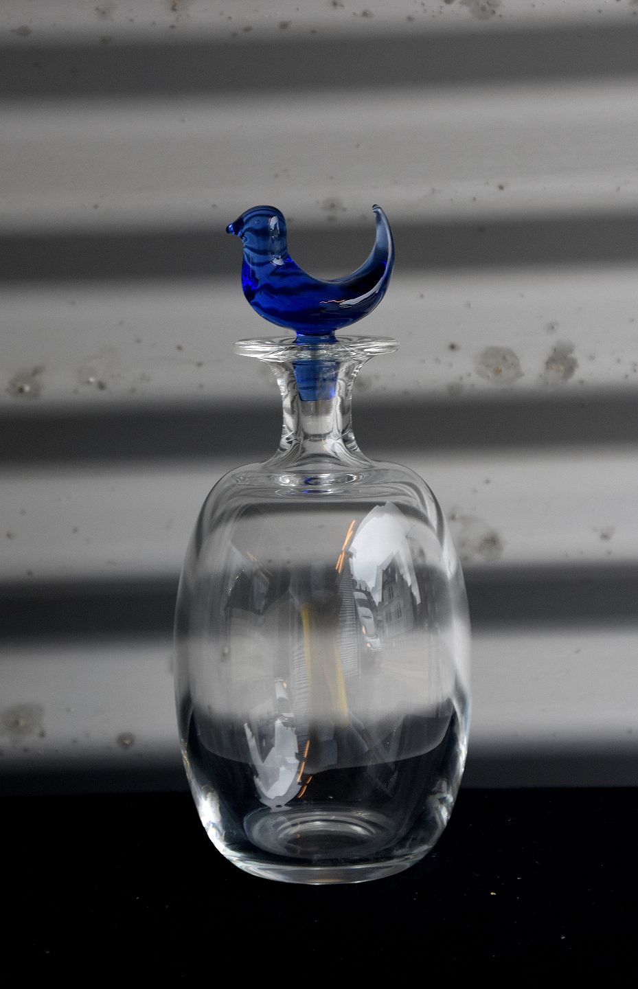 Tøndeformet karaffel fra serien "Noah" med hals og udsvejet flad rand. Safir blå prop udformet som en fugl