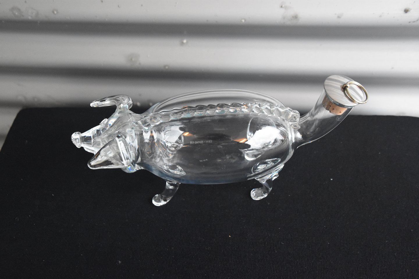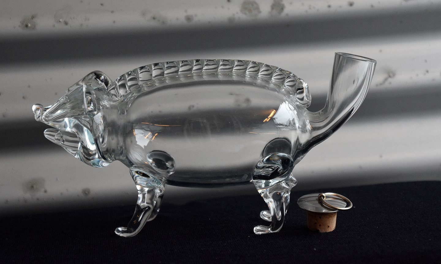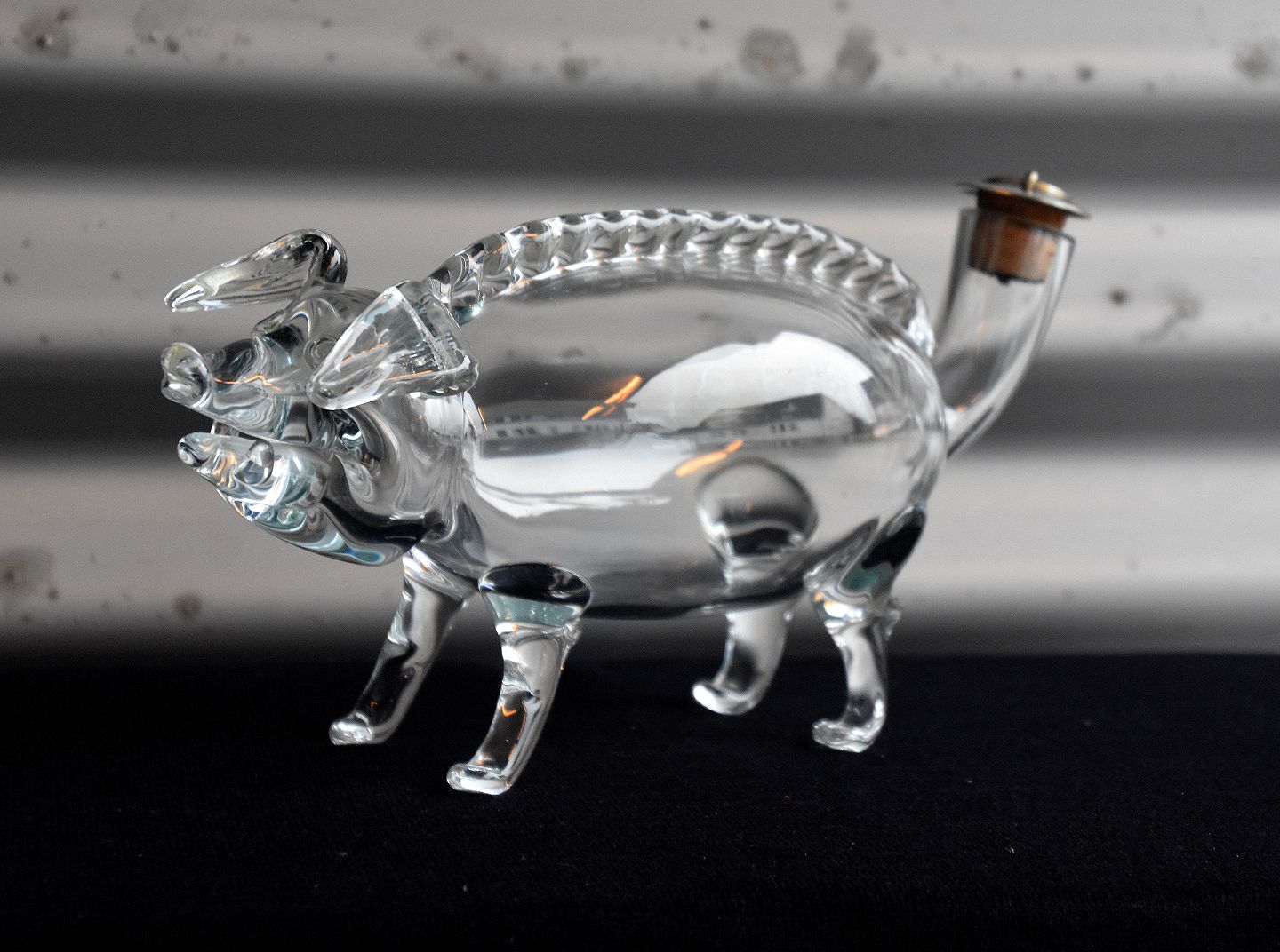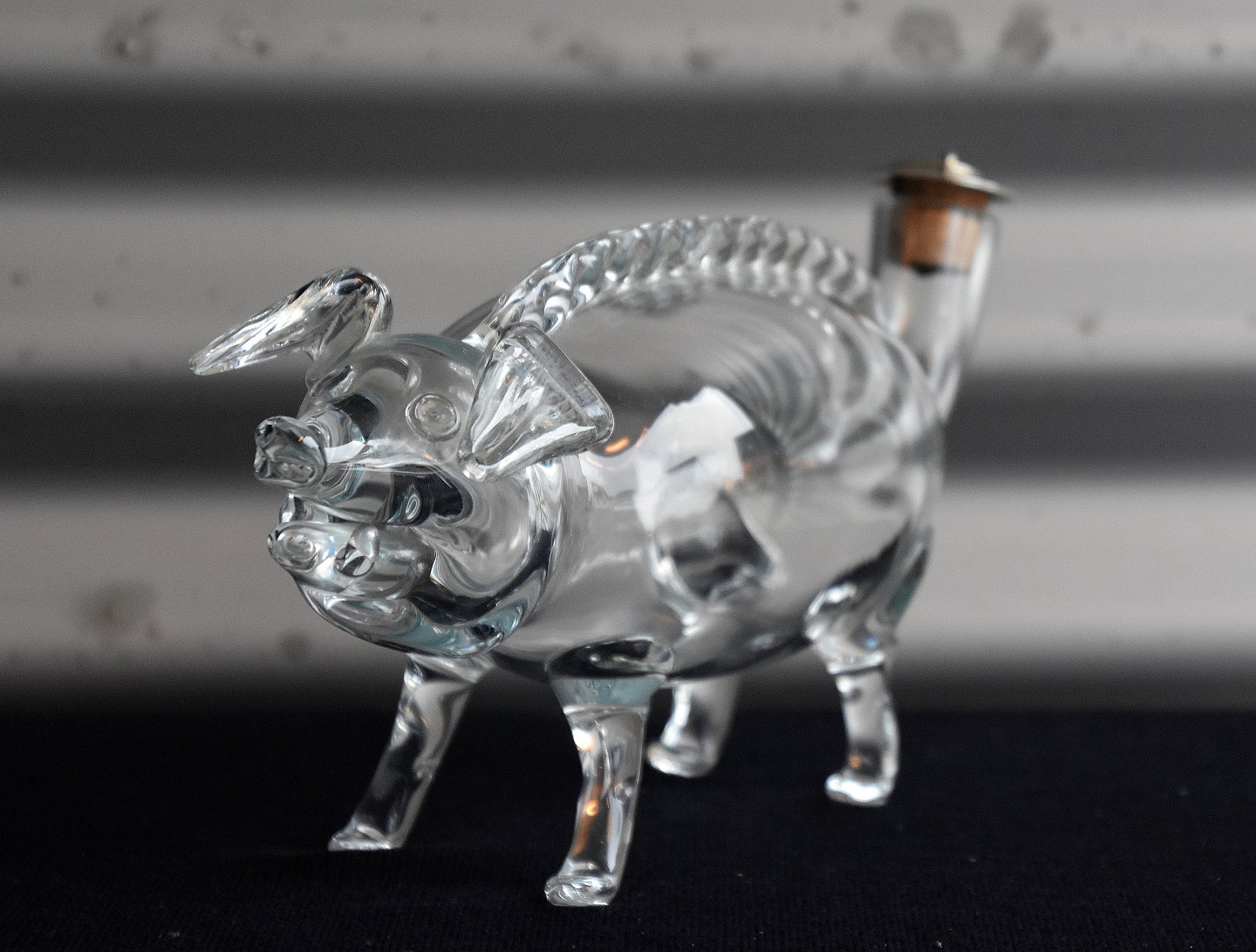 Snapsegris fra serien "Snapsedoctor". Blæst i klart glas med korkprop i halen