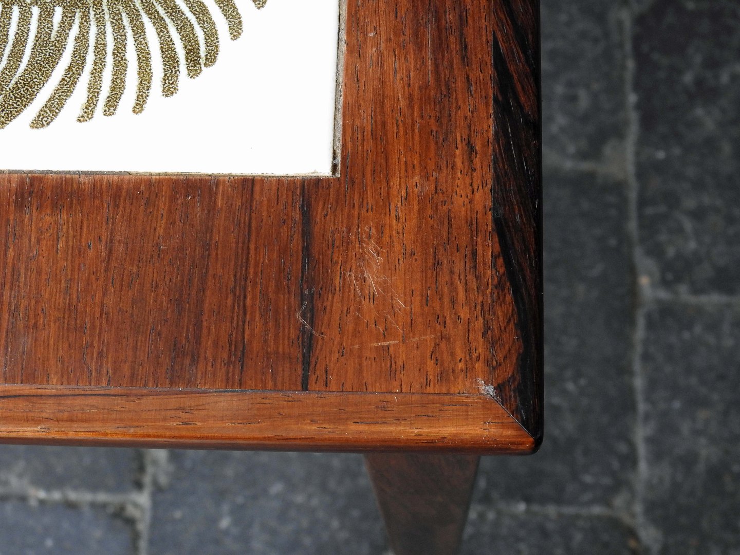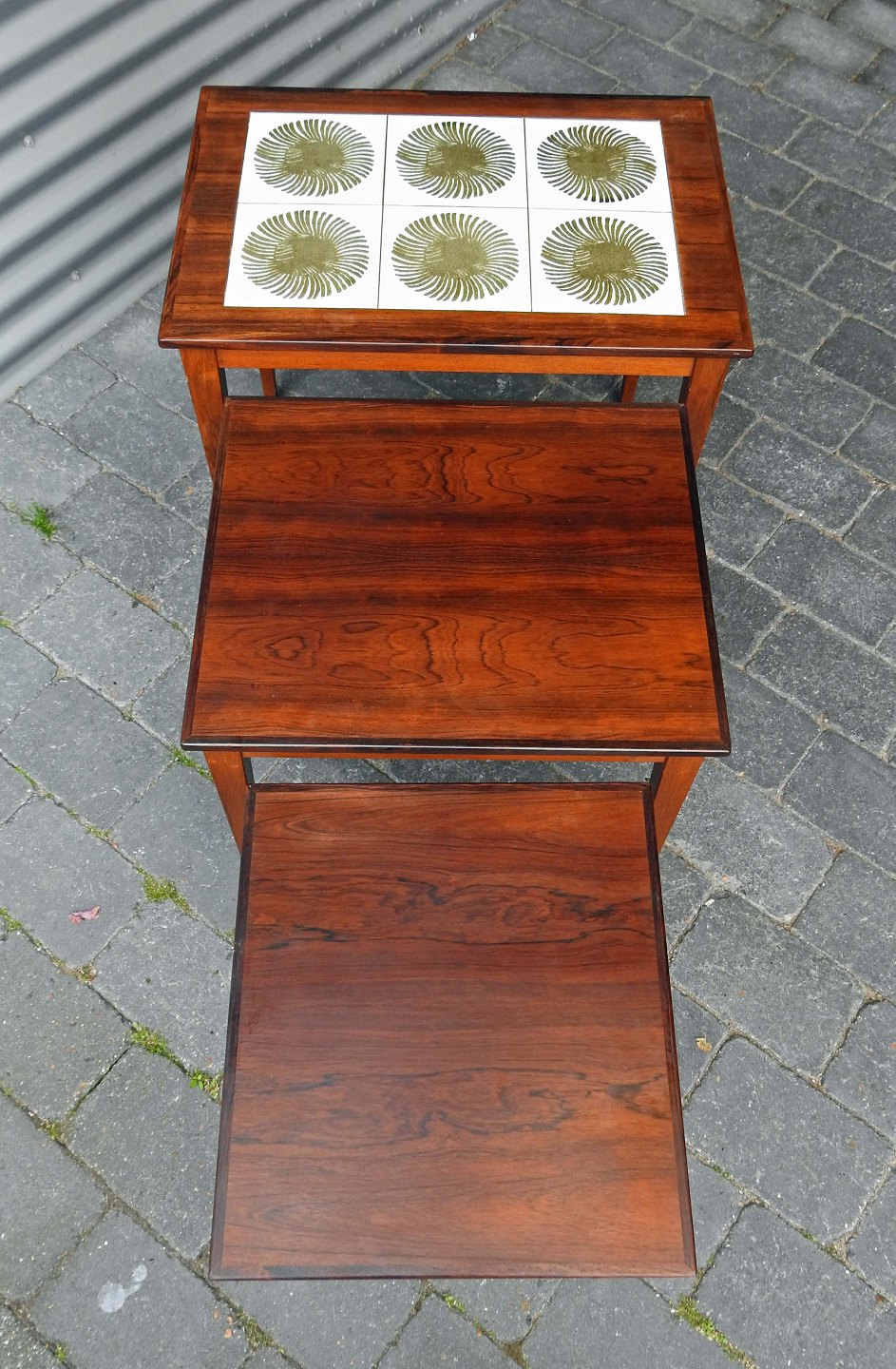 Et sæt indskudsborde i palisander med Royal Copenhagen kakler på øverste topplade