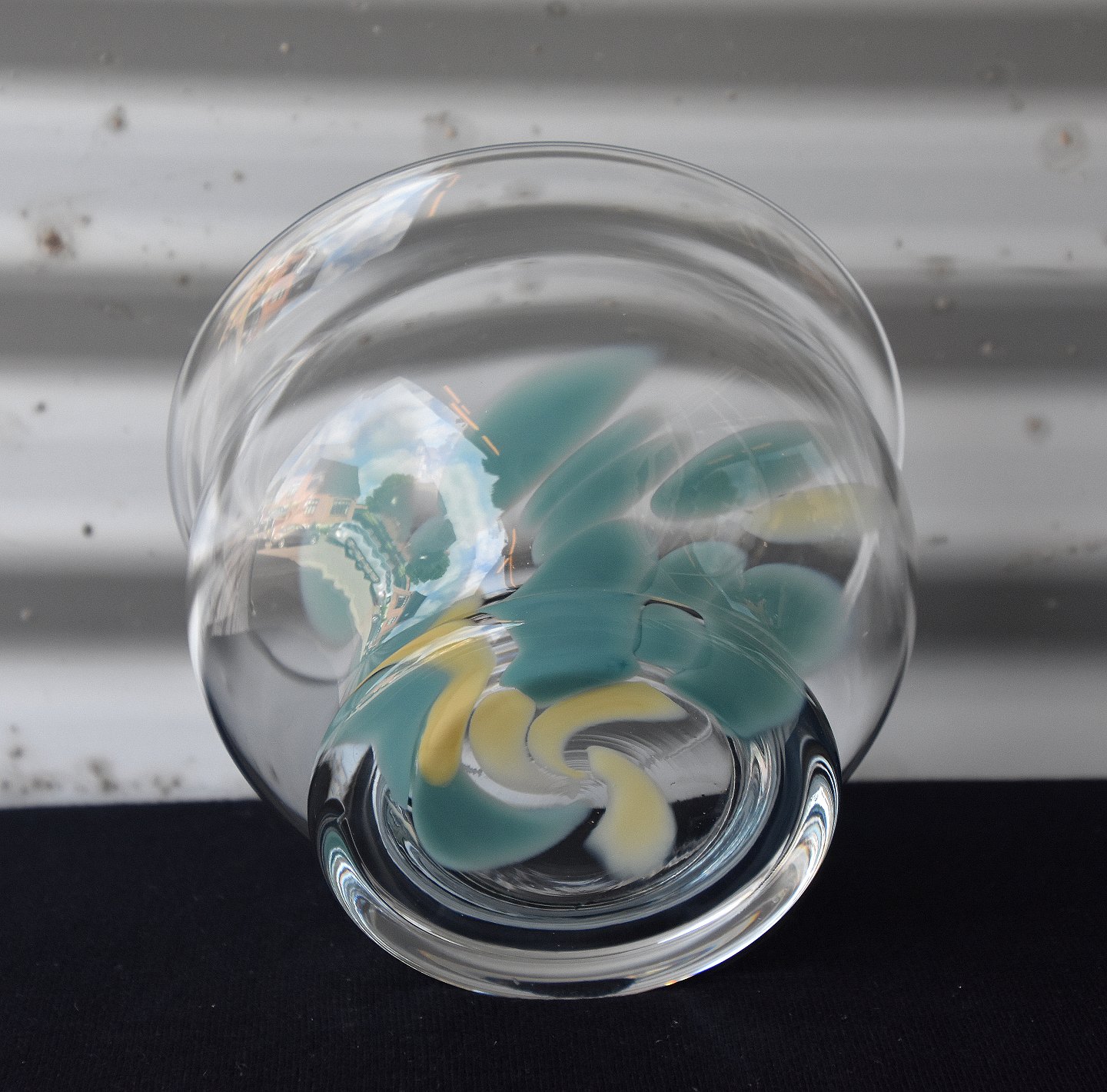 Harmony skål med udsvejet hals og udsvungen massiv fod. Blæst i klart glas med indlagt gule og grønne skår