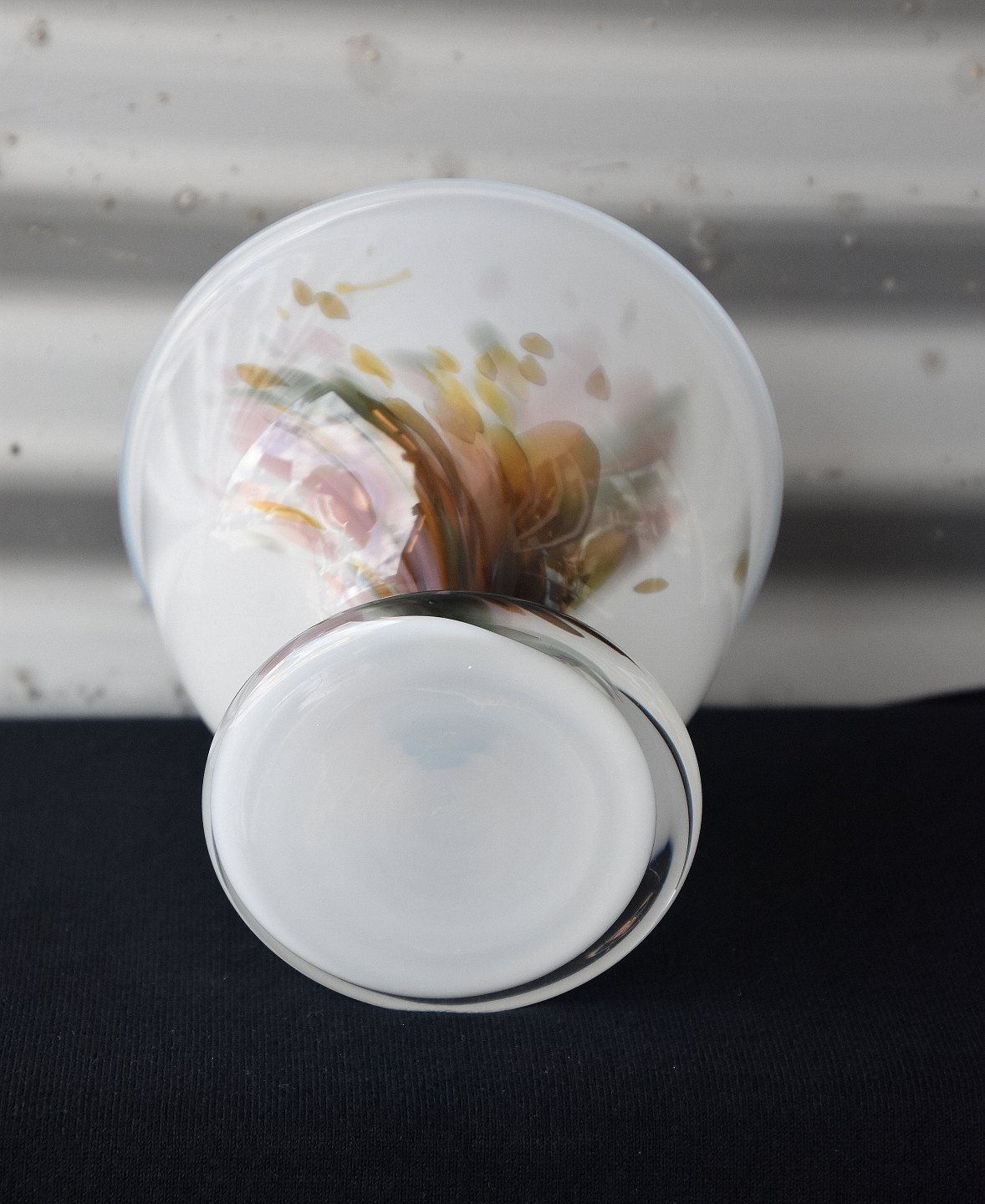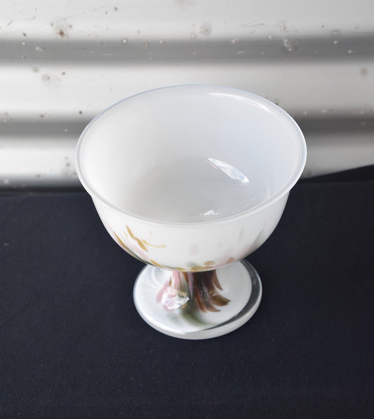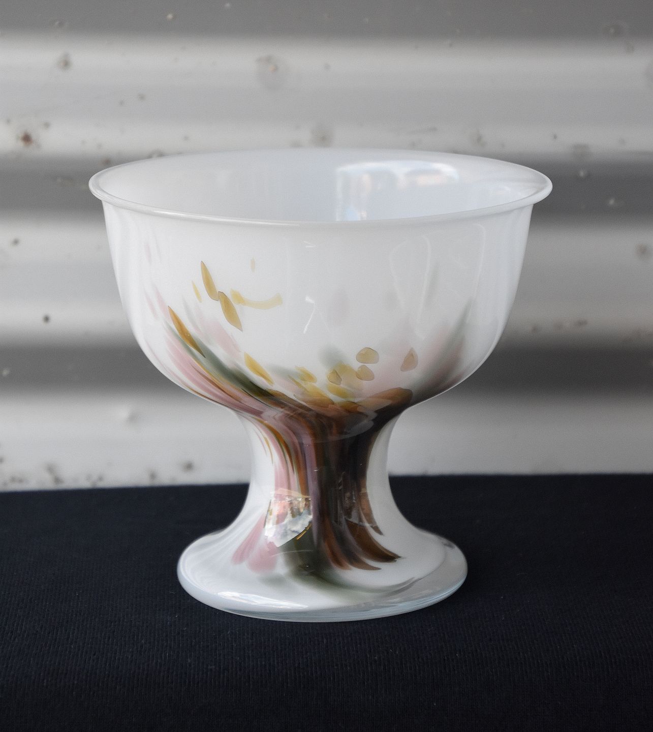 Najade blomster skål. Blæst i glas, indlagt dekoration i farvet glas, grøn/brun/rosa. Opaline underfang og overfang i klart glas. Gerbaudsprængt med opdrivning