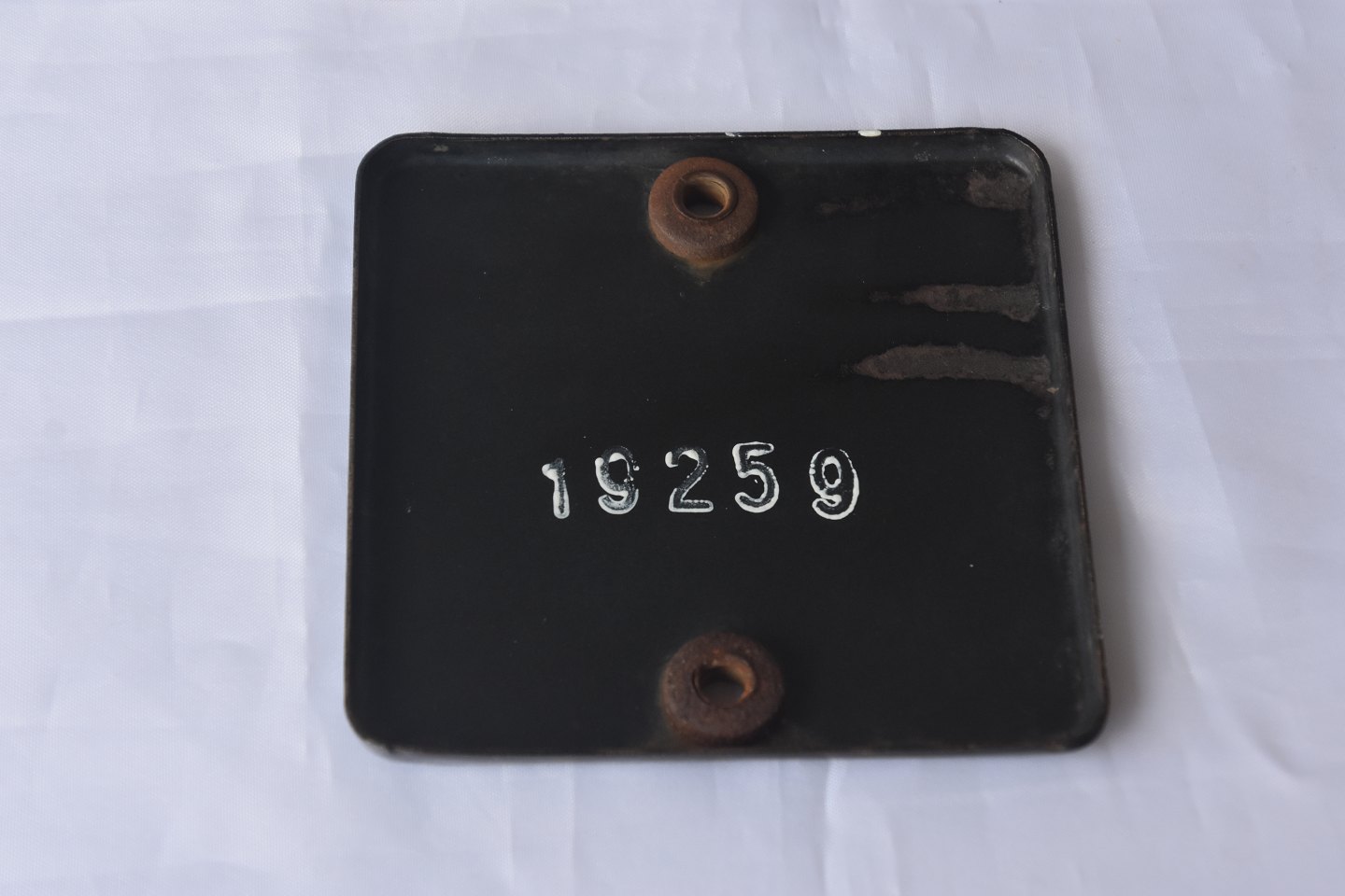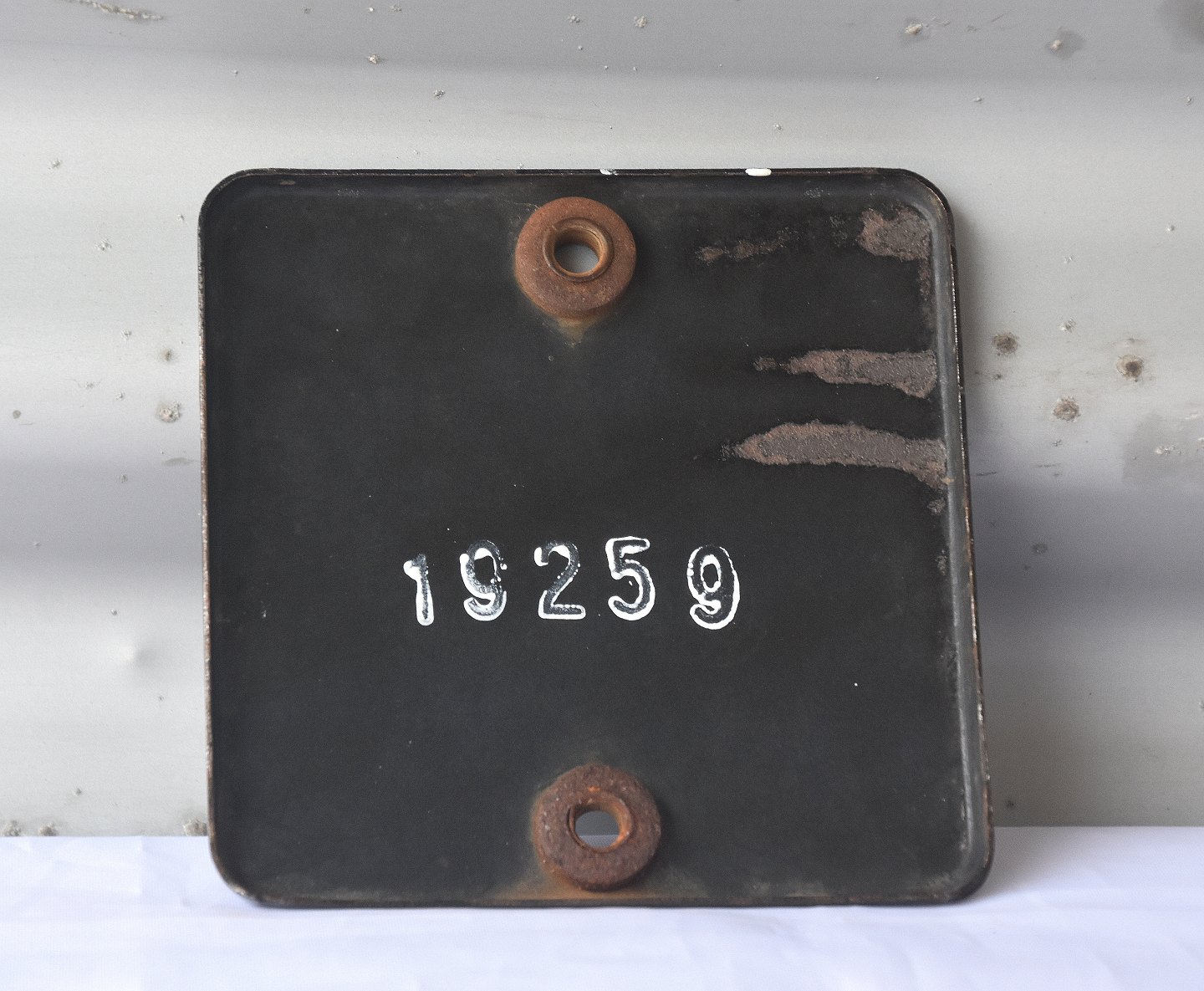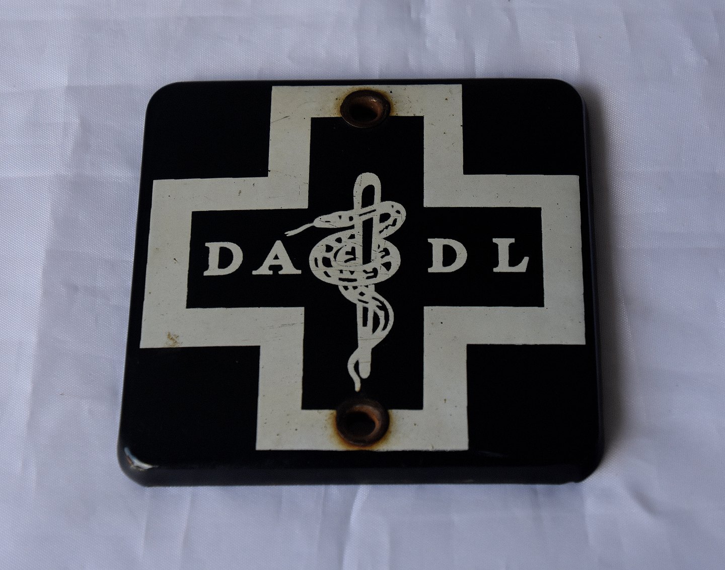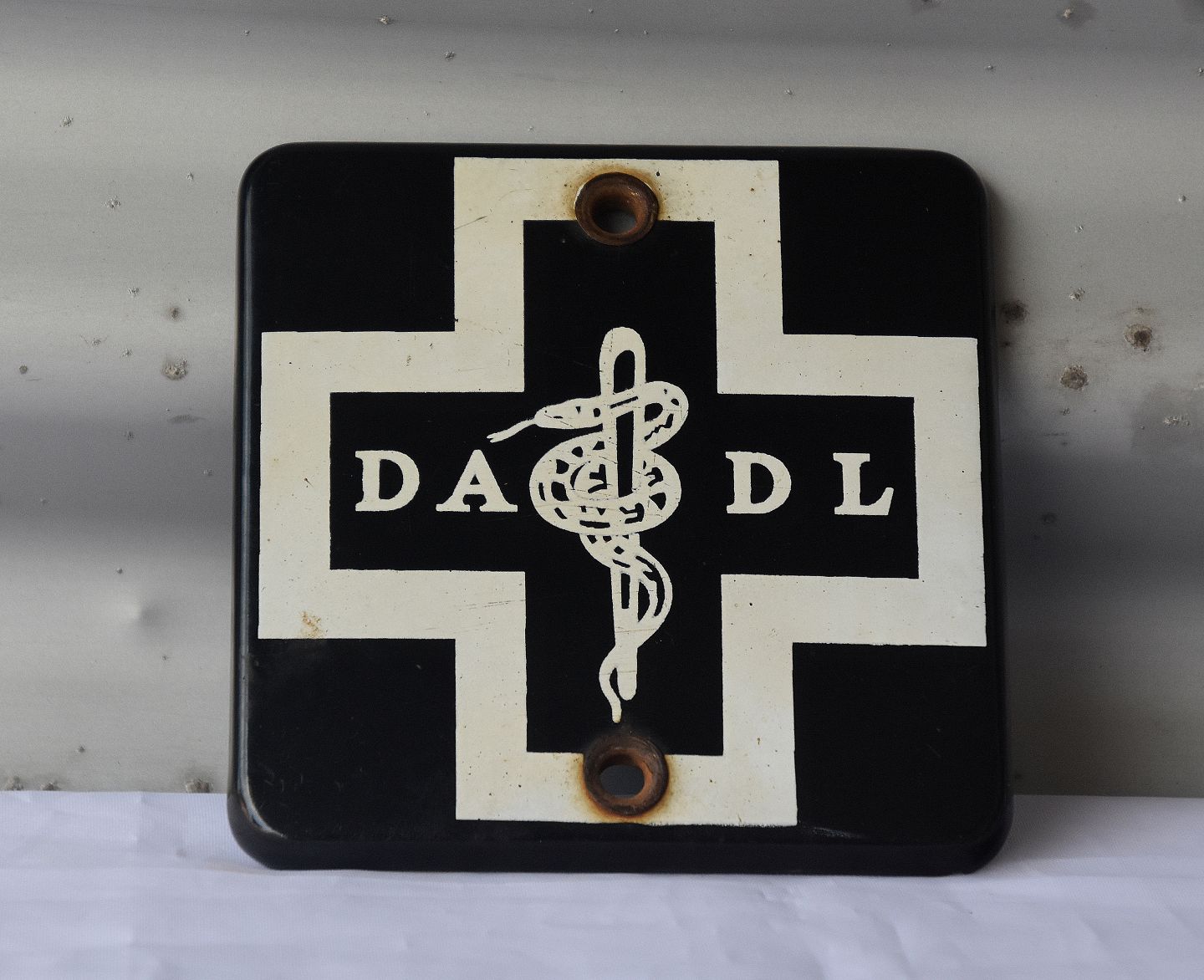 Emaljeret lægeskilt med æskulapsstav. Skiltet blev brugt op til 1950`erne.