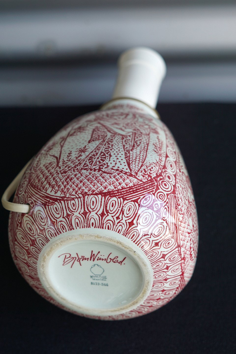 Bordlampe, produceret på Nymølle, med Commedia Dell`Art figurer. Bordlampen er tegnet med rødstreg