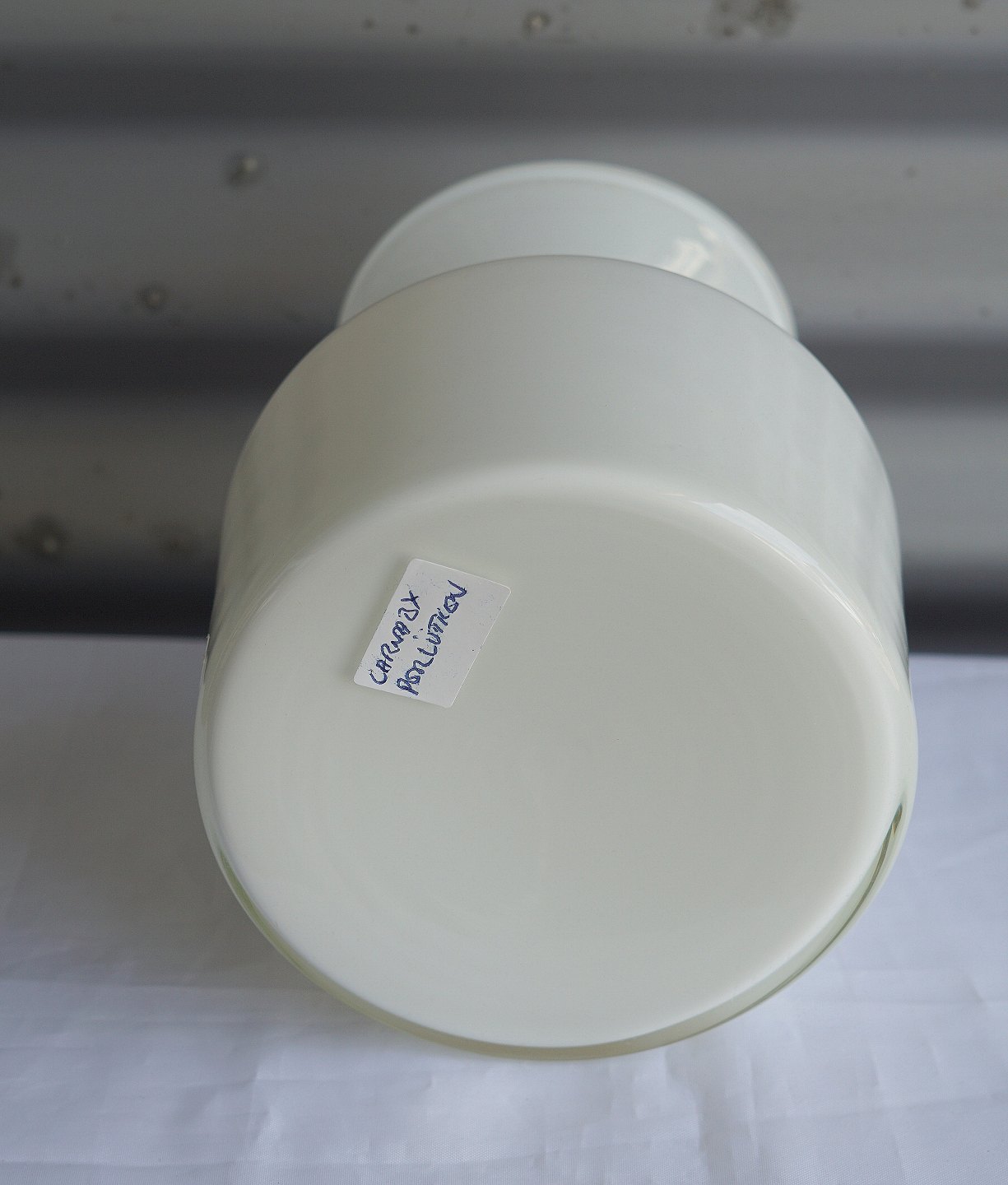 Hvid Carnaby vase. Vasen er blæst i opal med farvet mellemlag og klart glas overfang. Vaser er produceret på Fyens Glasværk for Holmegaard Glasværk.