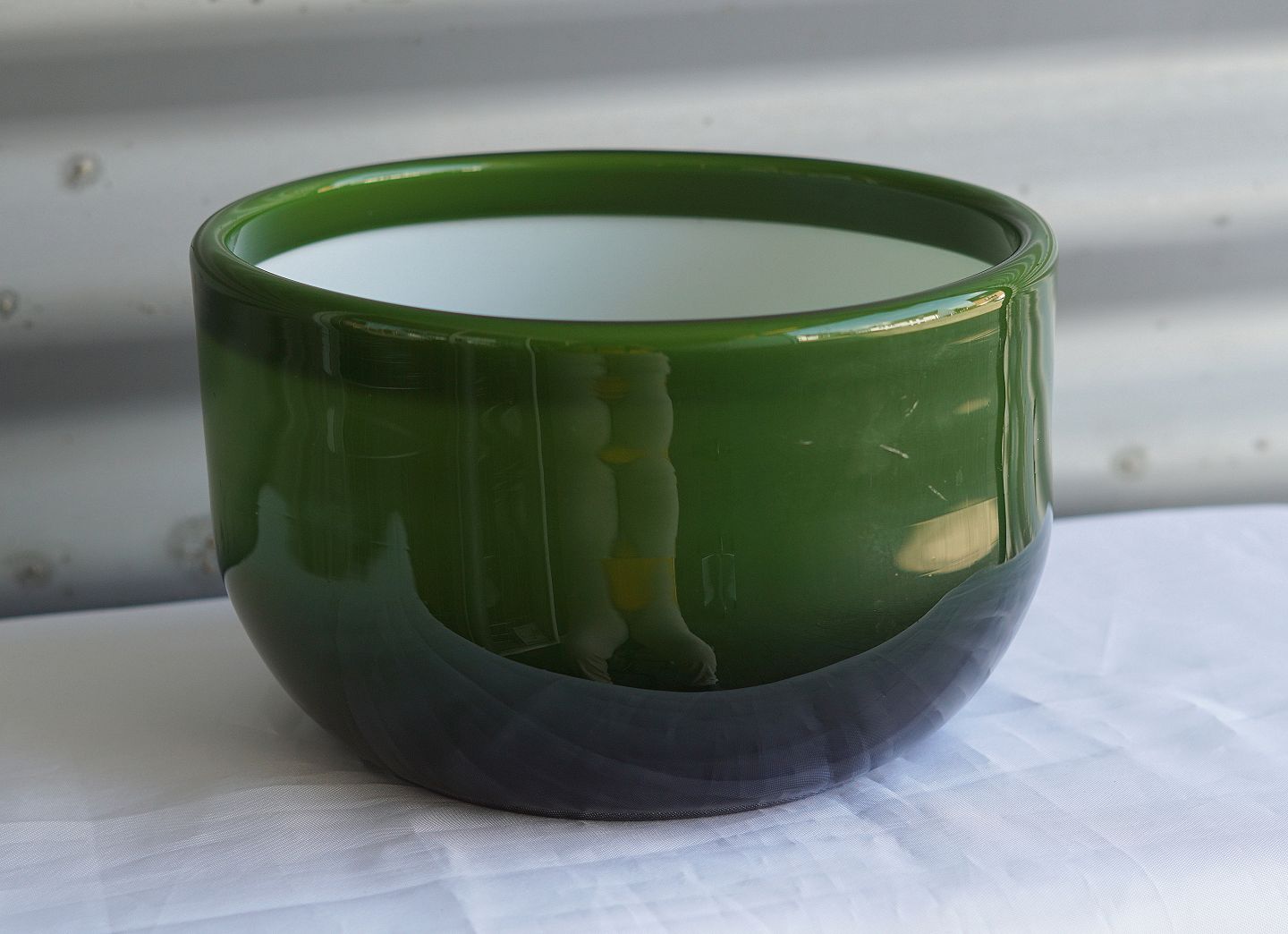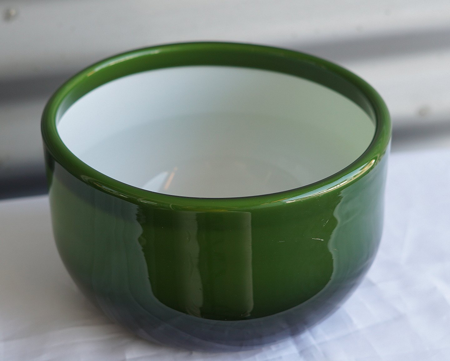 Palet-serien, jadegrøn skål. Fremstillet på opal post med farvet og hvidt glas overfang. Produceret på Fyens Glasværk, fra 1969 til 1976, for Holmegaard Glasværk
