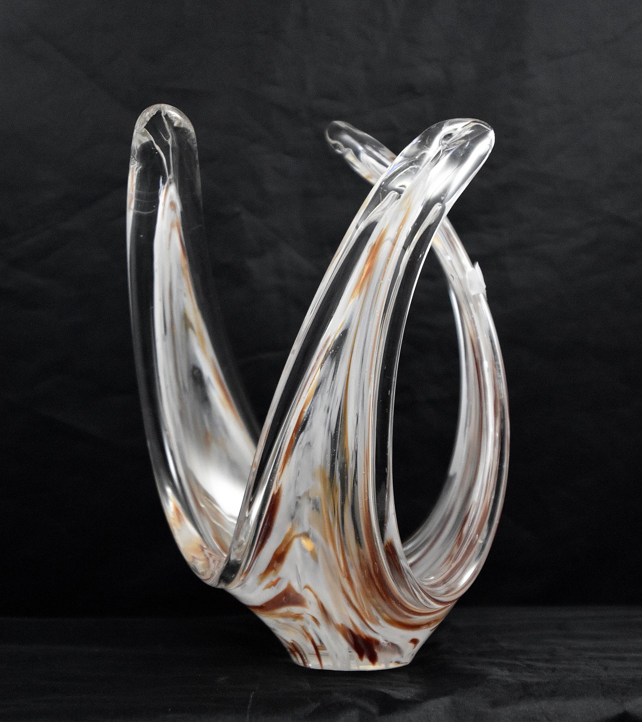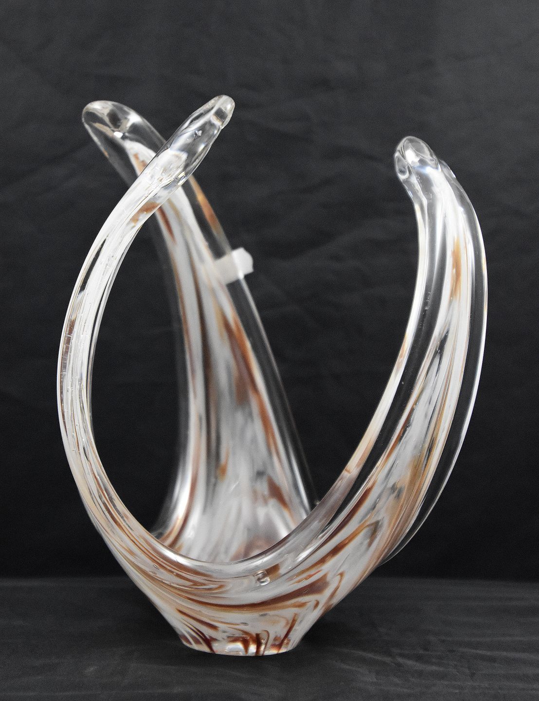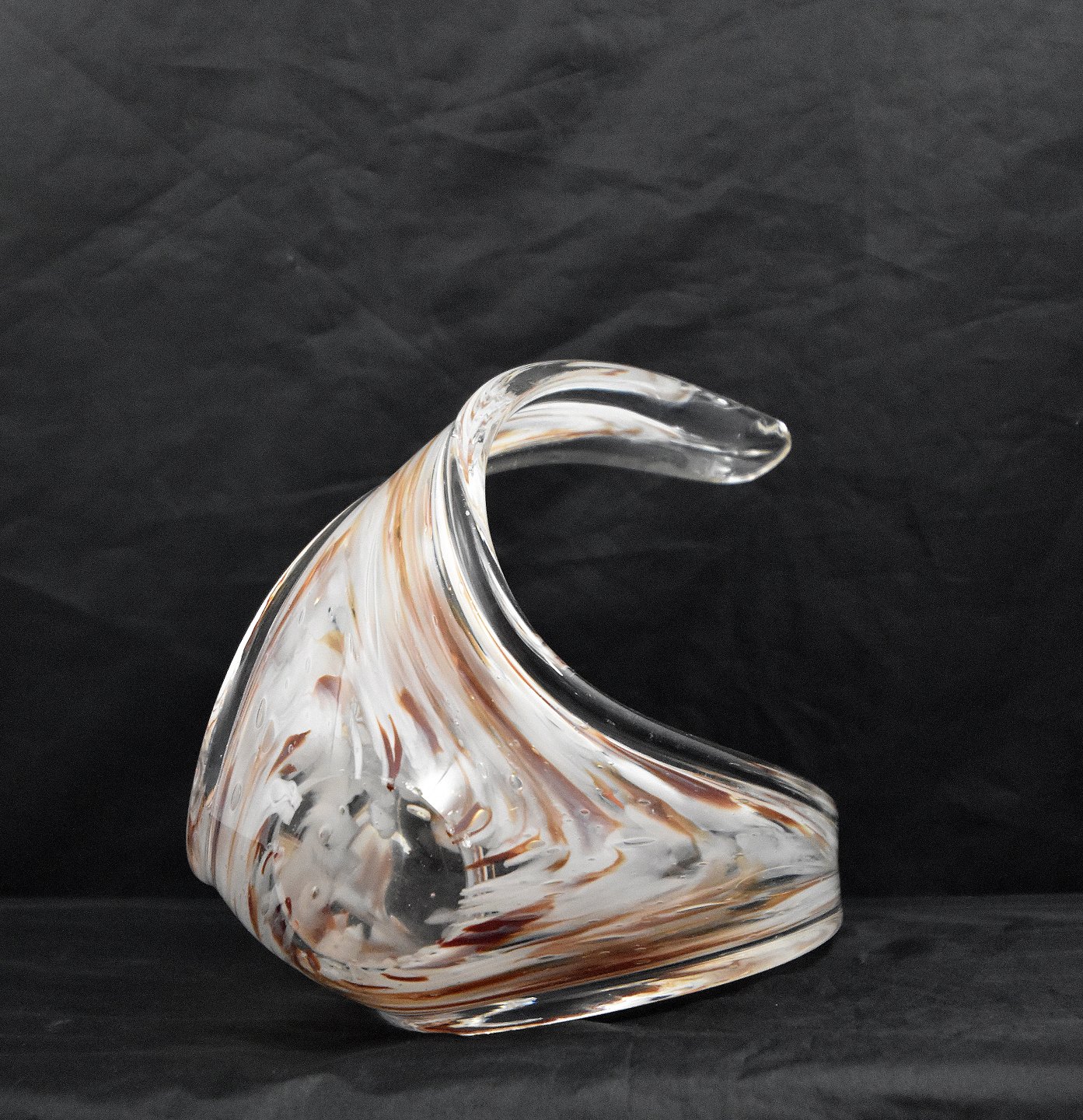 Skulpturel glas skål, lavet i opalglas med røde glassten som indlæg og klart glas som overfang