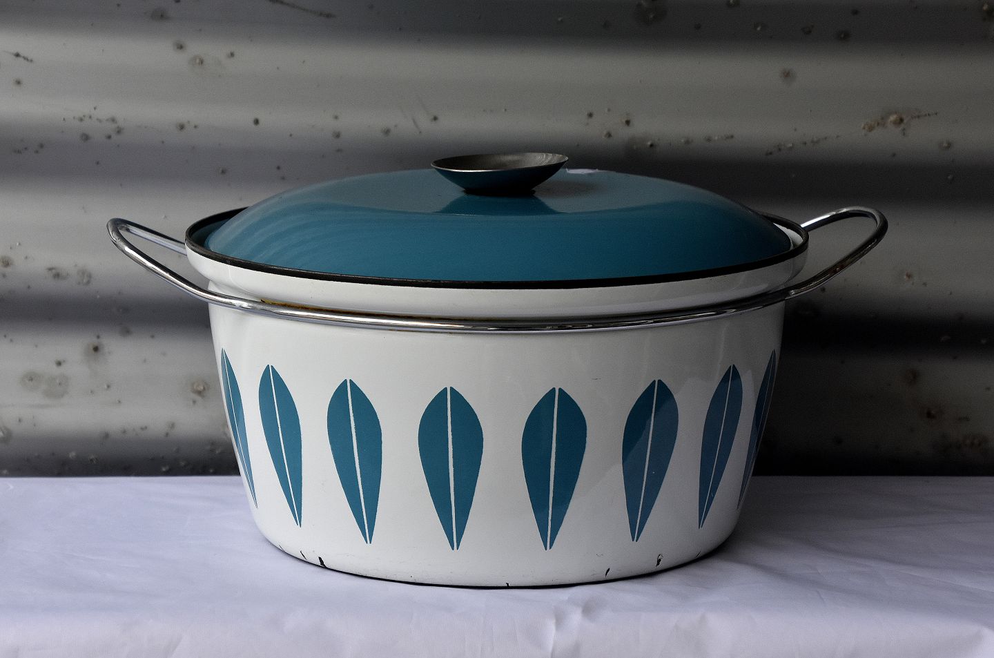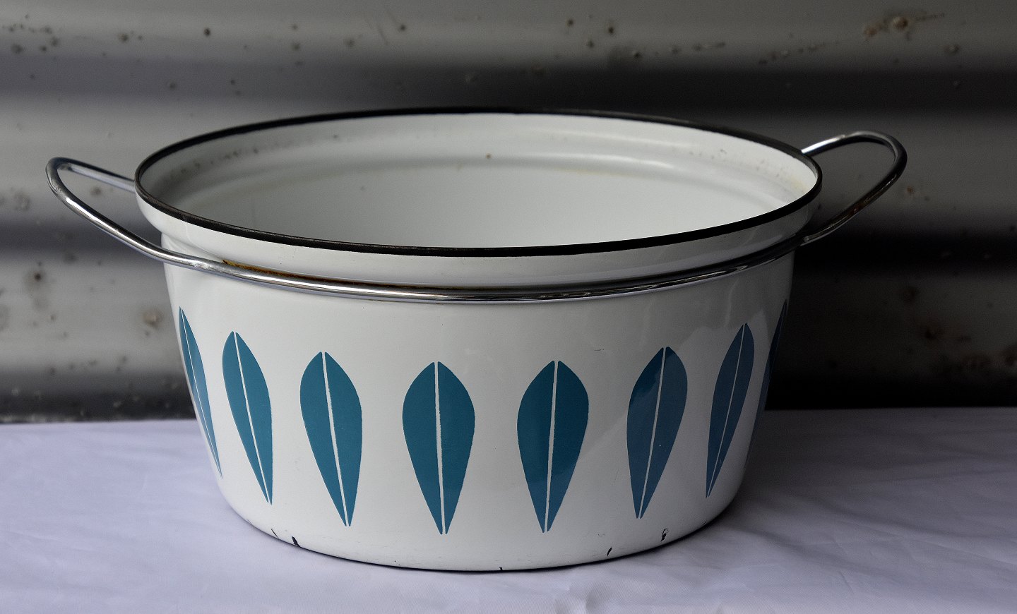 Lotusgryde, hvid med blå blade og blåt låg. Gryden er emaljeret