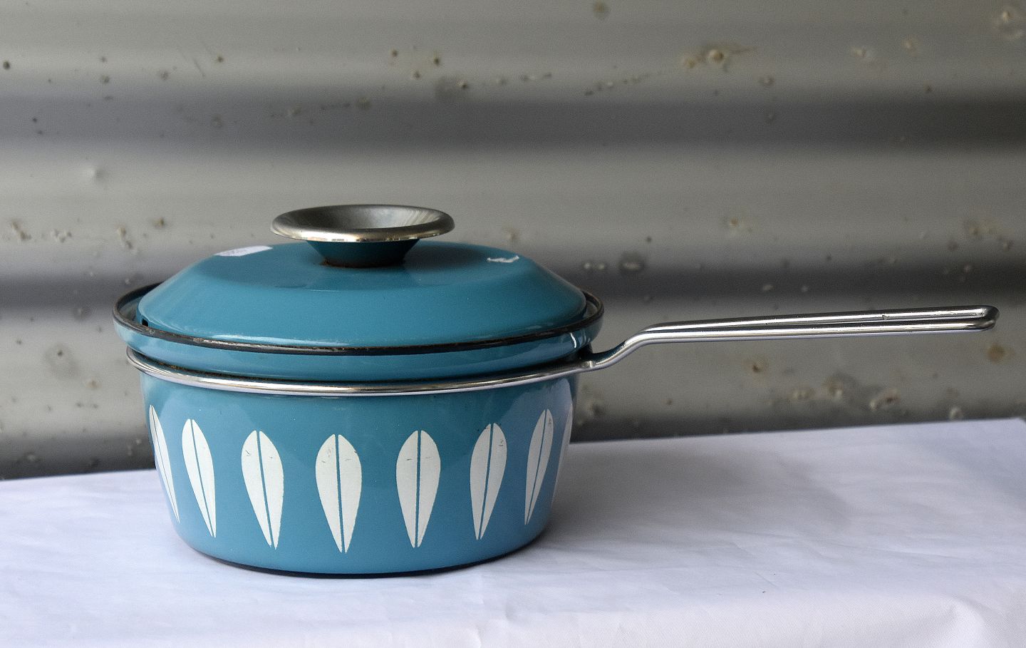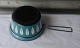 Kasserolle, blå emaljeret med hvide blade, låget er også blåt. Kasserollen er emaljeret
