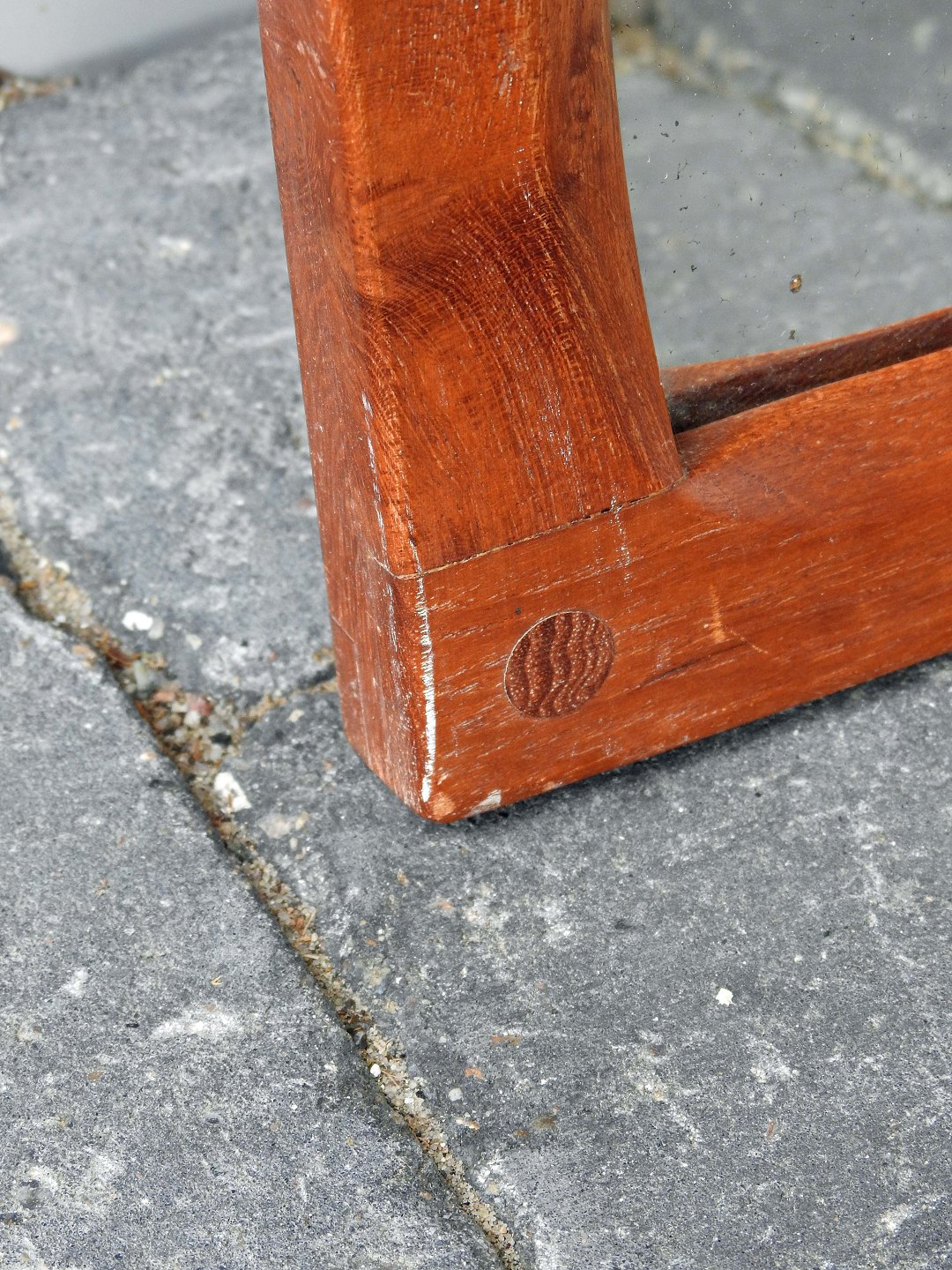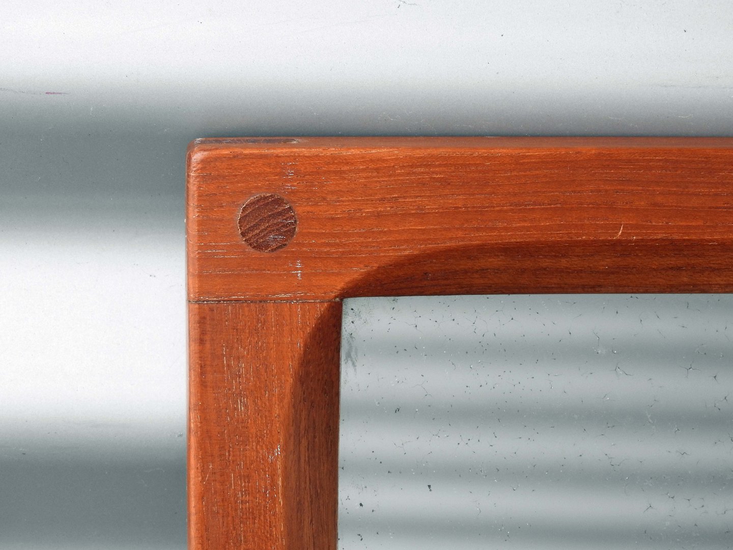 Spejl med ramme af teaktræ med enkelte detaler ved hjørnerne