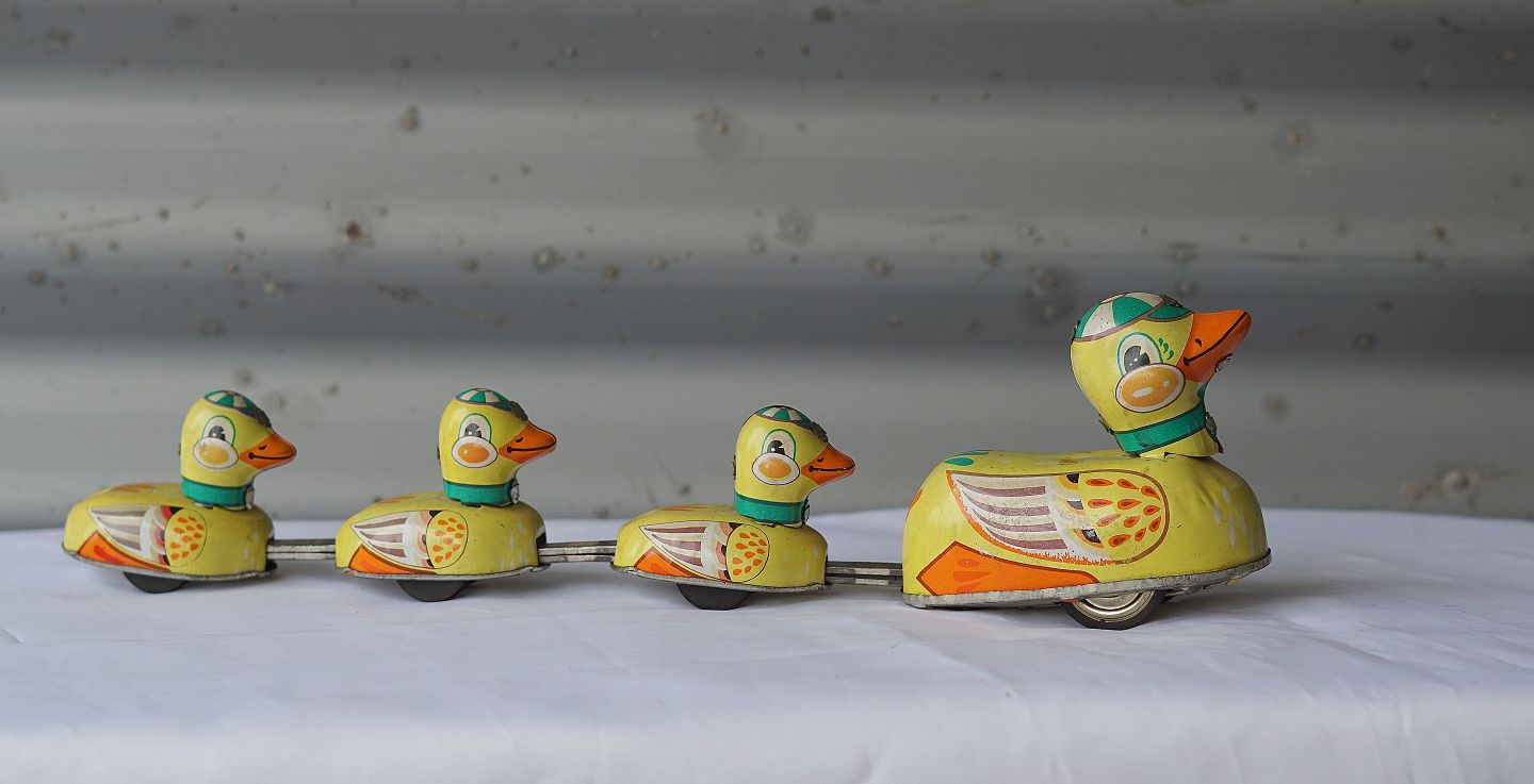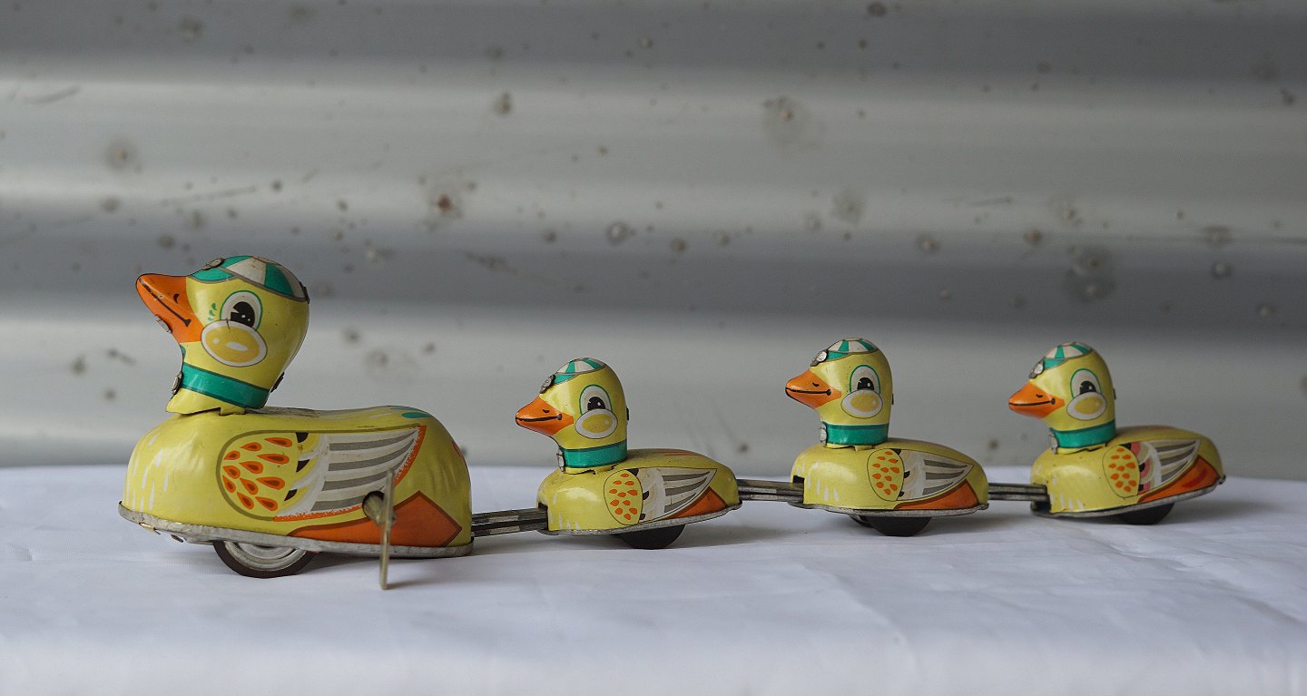 Andefamilie, der kan trækkes op. Med nøgle og fin stand.