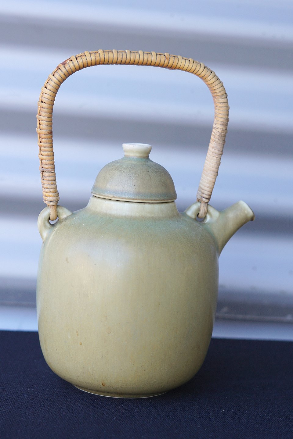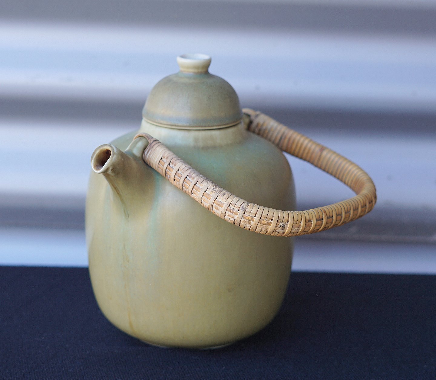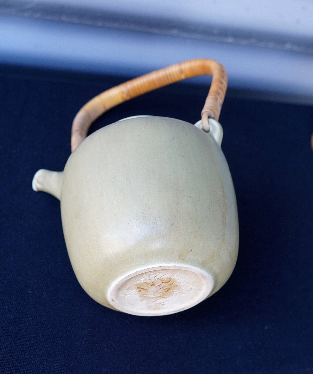 Grå/grøn glasur harepelsglasur og hank med rattan bevikling.