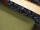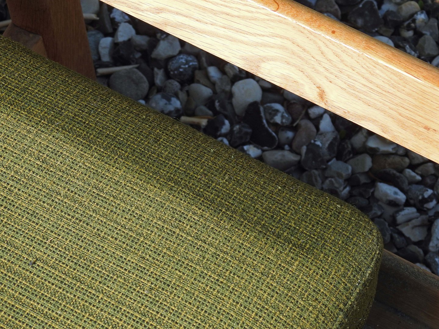 3-personers sofa med egetræstel med grønne stofbetrukne springmadresser, og armlæn beklædt med sort nappe.