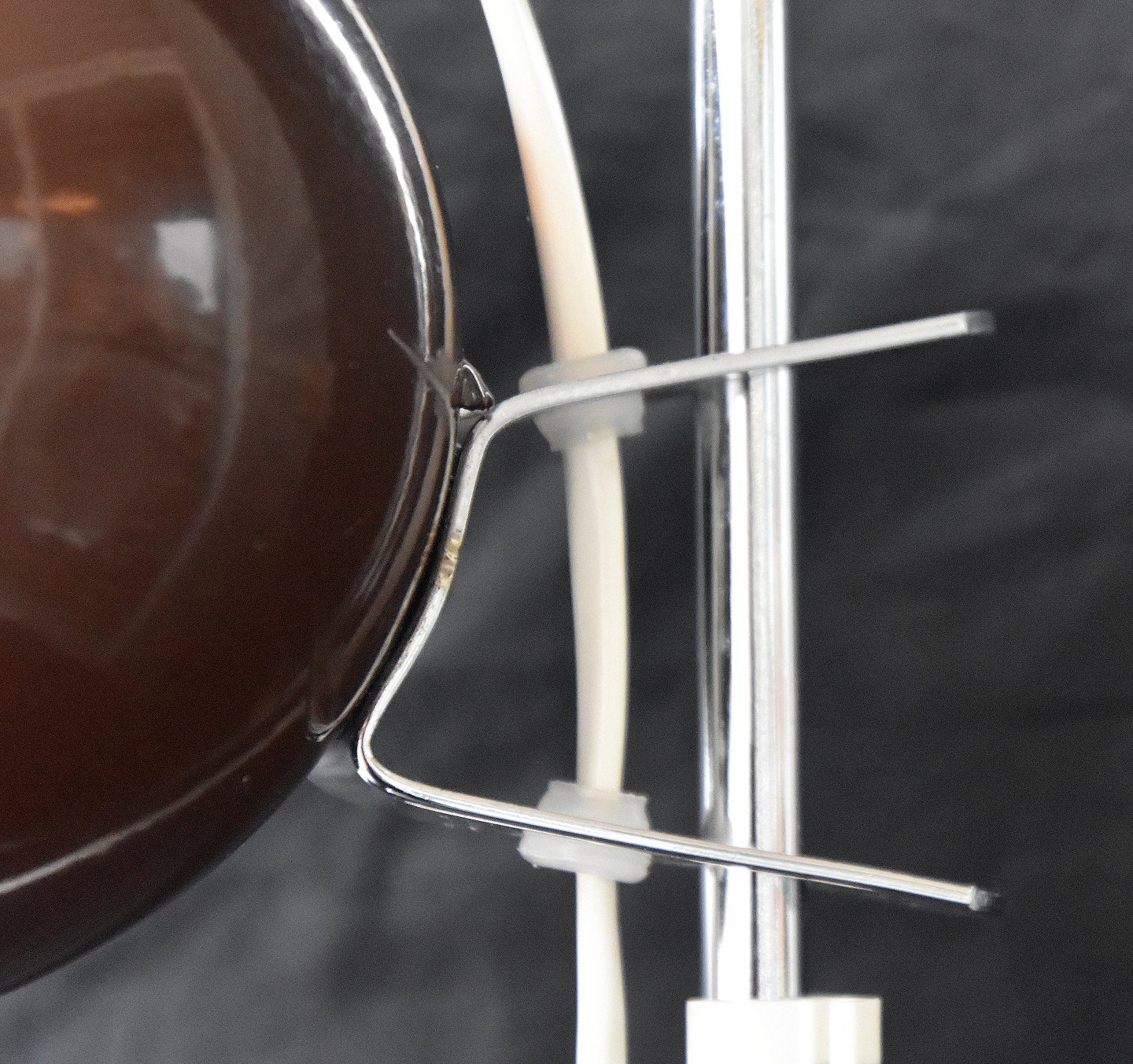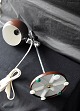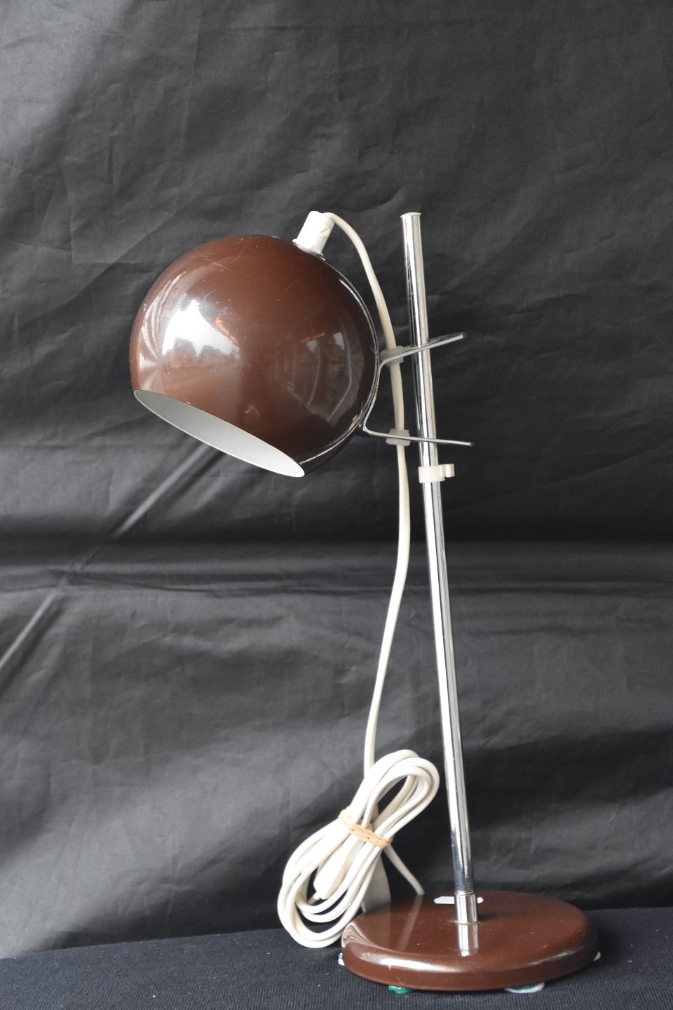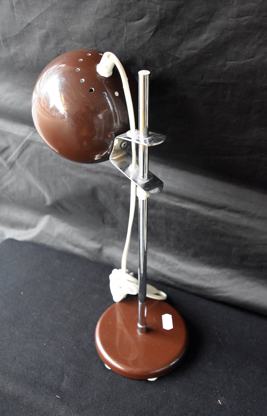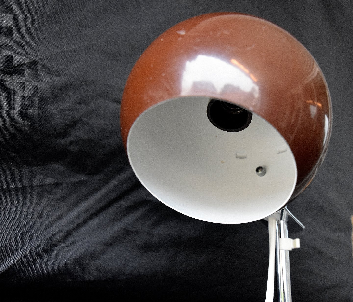 Brun bordlampe, kuglemodel. Lampen er af metal, brunlakeret yderst og på lampefod, hvidlakeret inderst. Stammen er forniklet metal. Kuglehovedet kan justeres via en klips på stammen