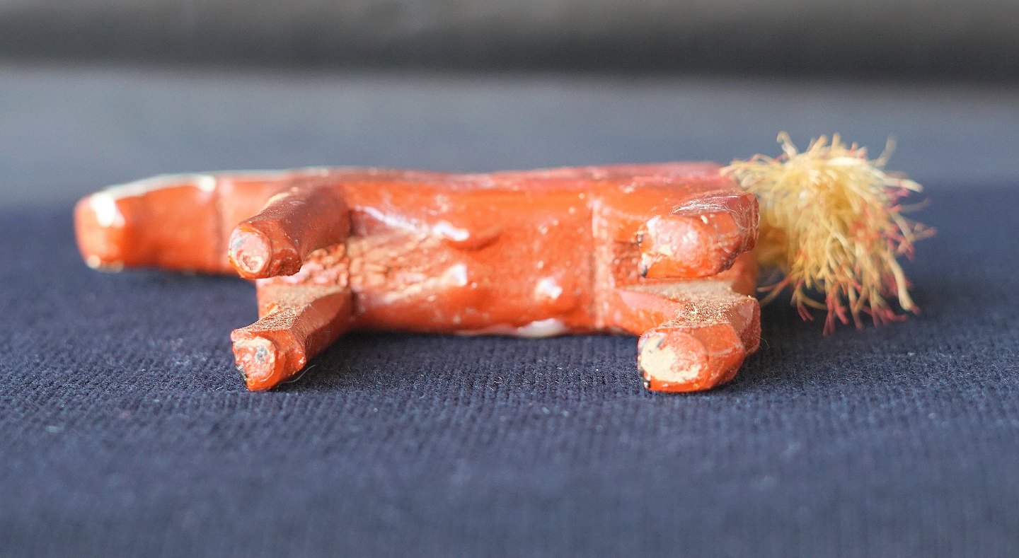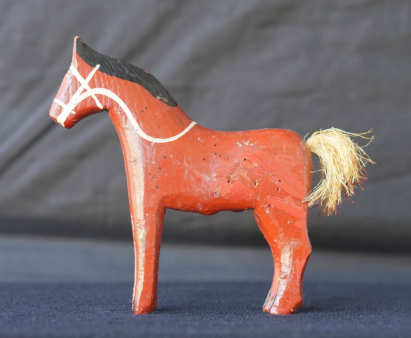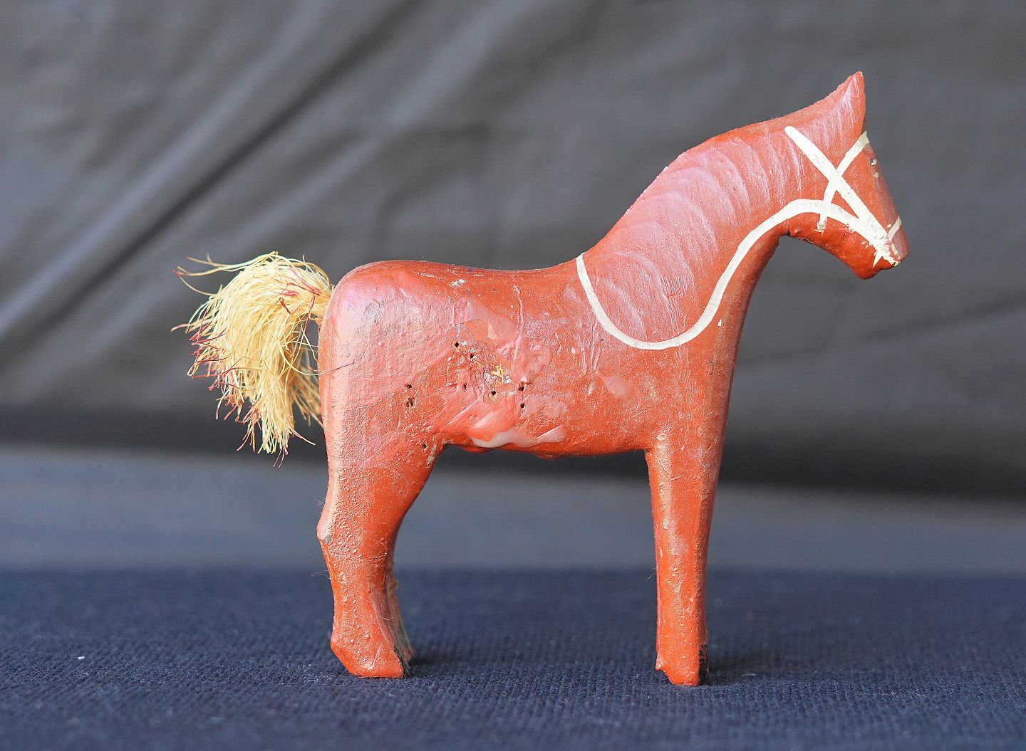 Gammelt legetøj, formodentligt en lille fængselshest. Hesten er udført i træ og malet rødbrun, hale er pjusket, manke er malet på med sort maling og til seletøjet er der brugt hvid maling