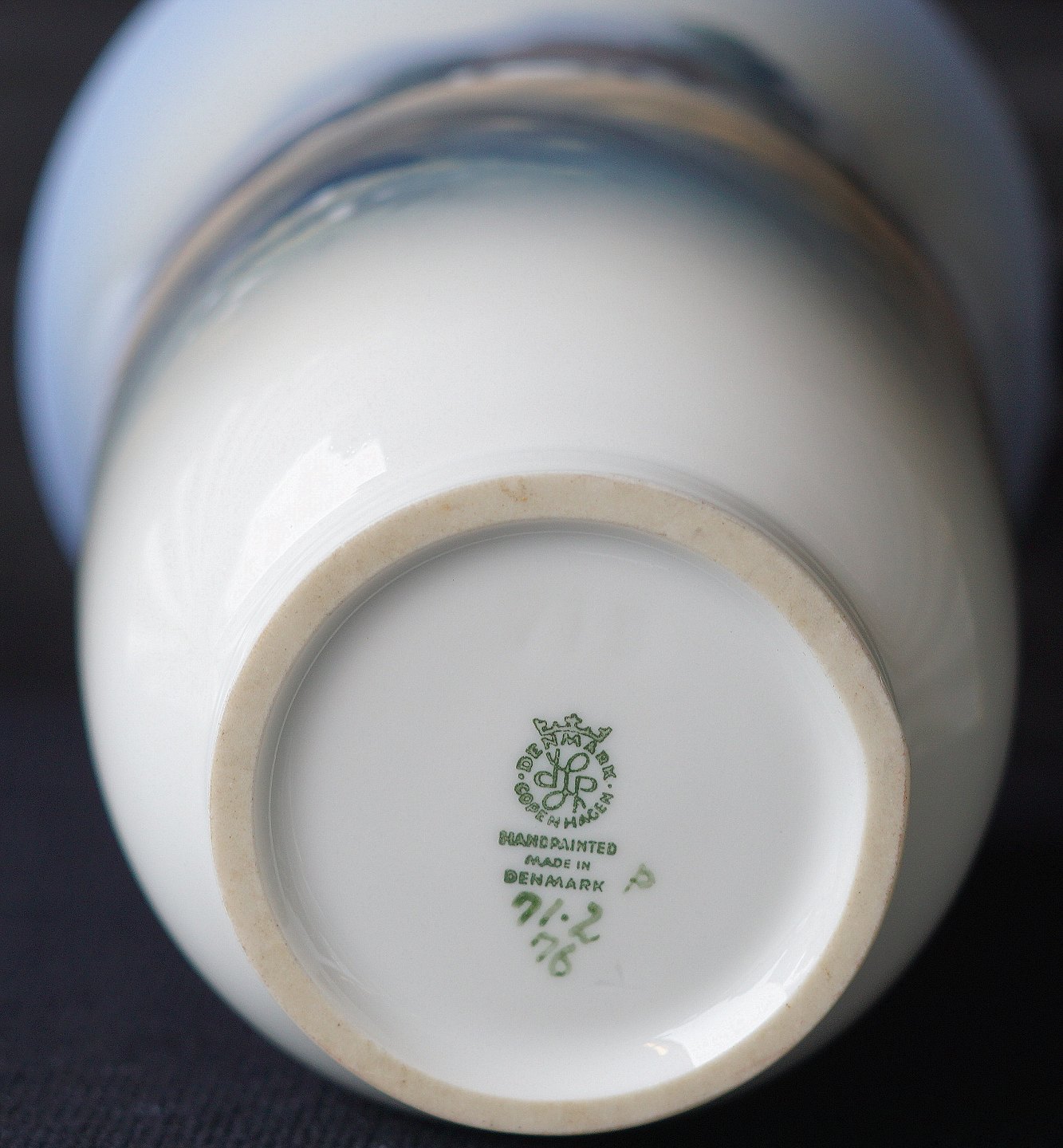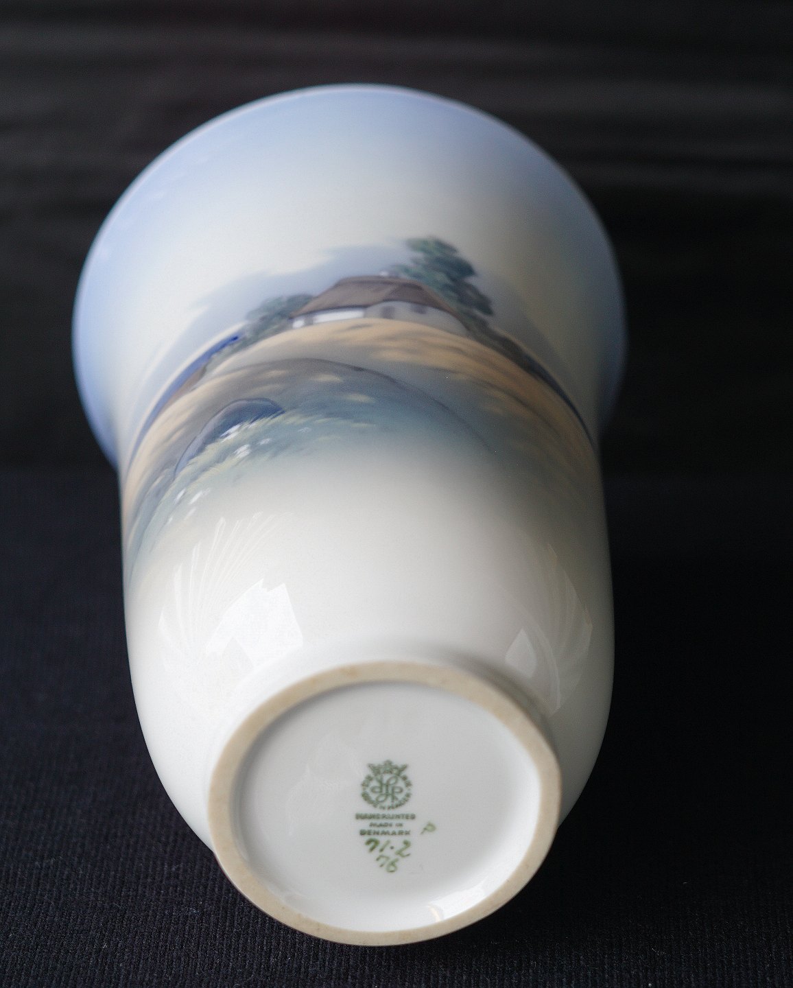 Lyngby Porcelæn, vase 71-2/76, 1. sortering. Dekoration landskab med stråtækt hus, vasen er håndmalet