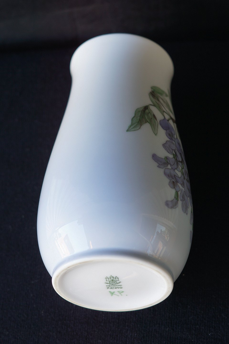 Bing & Grøndahl, Vase 5772-210. Vasen er 1. sortering. Dekorationen er en gren af blåregn med grønne blade