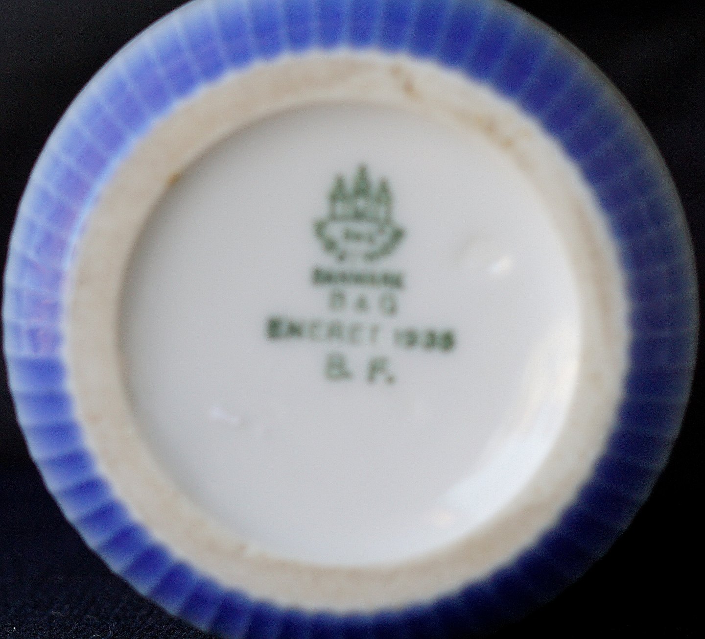 Bing & Grøndahl, Mors dags vase 1935, 1. sortering. I bunden, af vase, står "Eneret" 1935, BF = Børne Fonden?