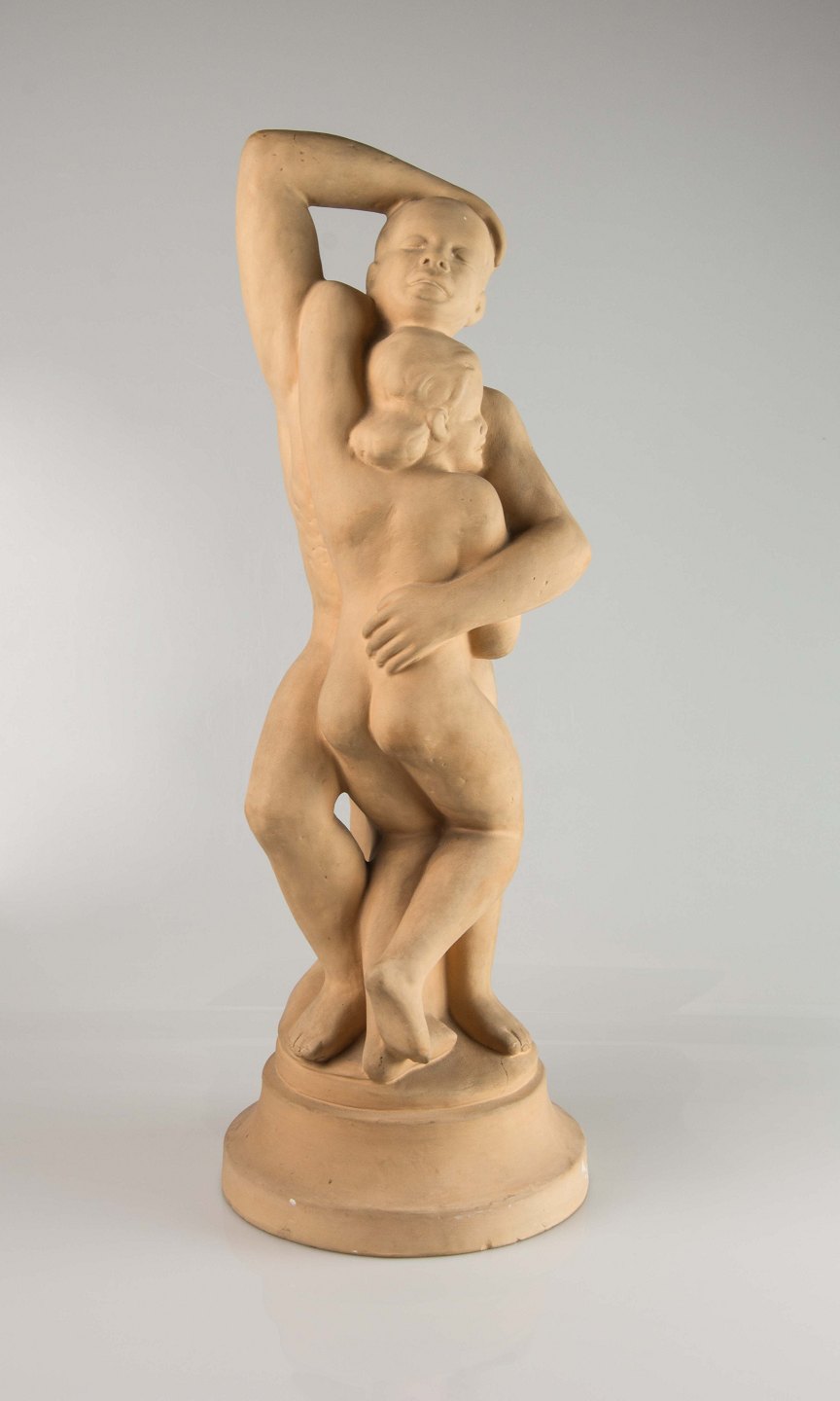Figur i keramik med motiv af mand og kvinde i åben omfavnelse.
