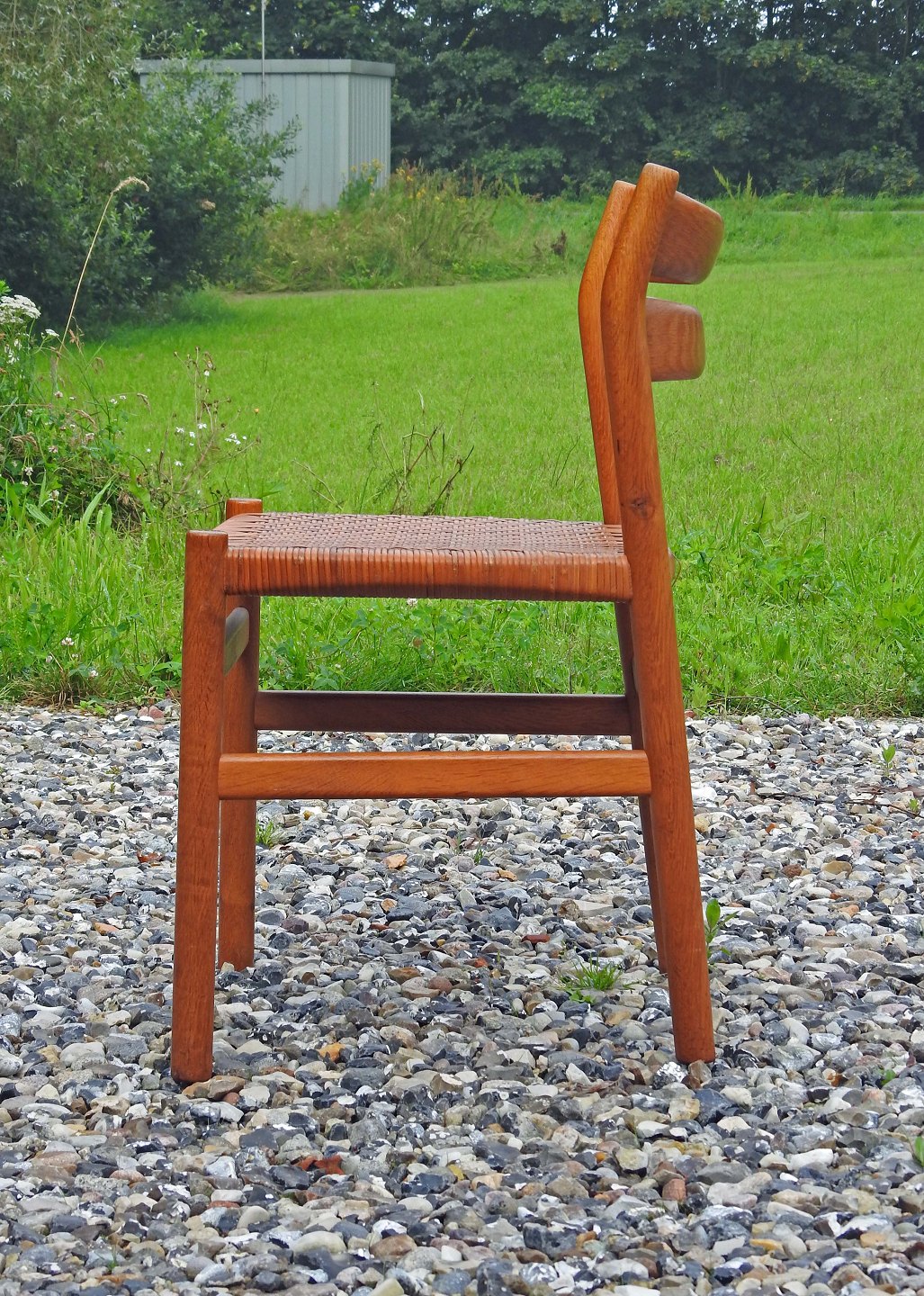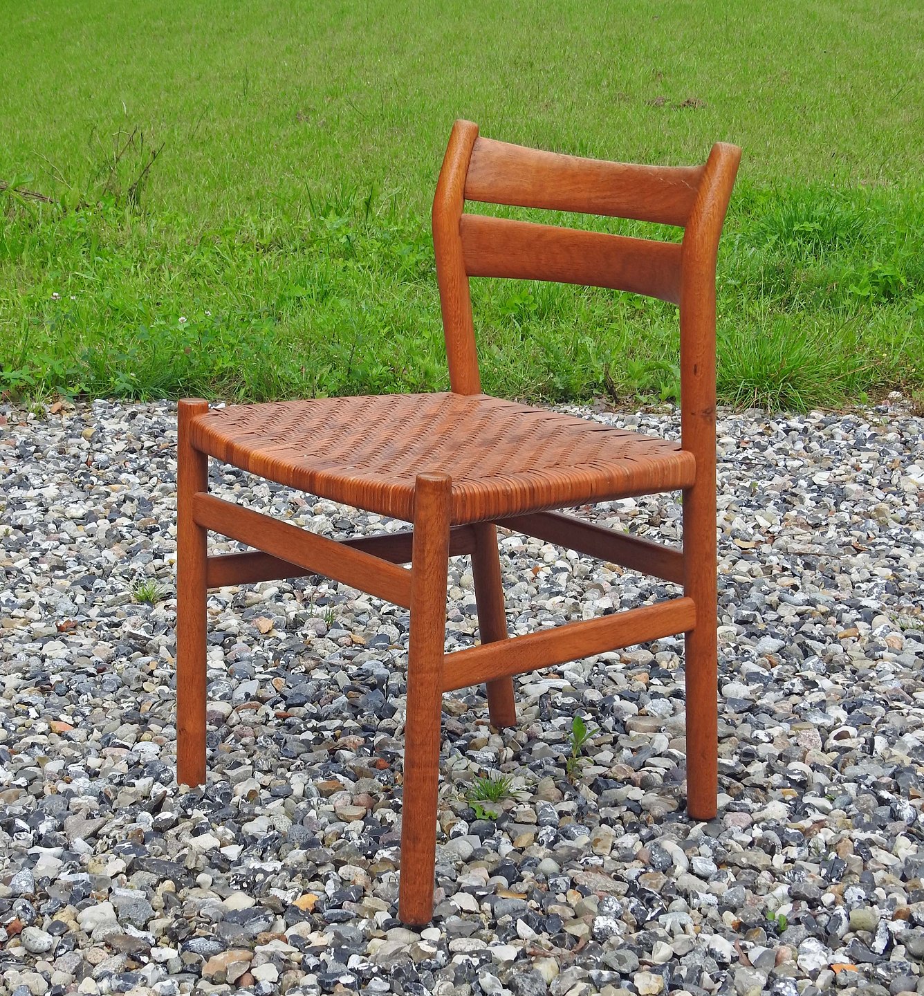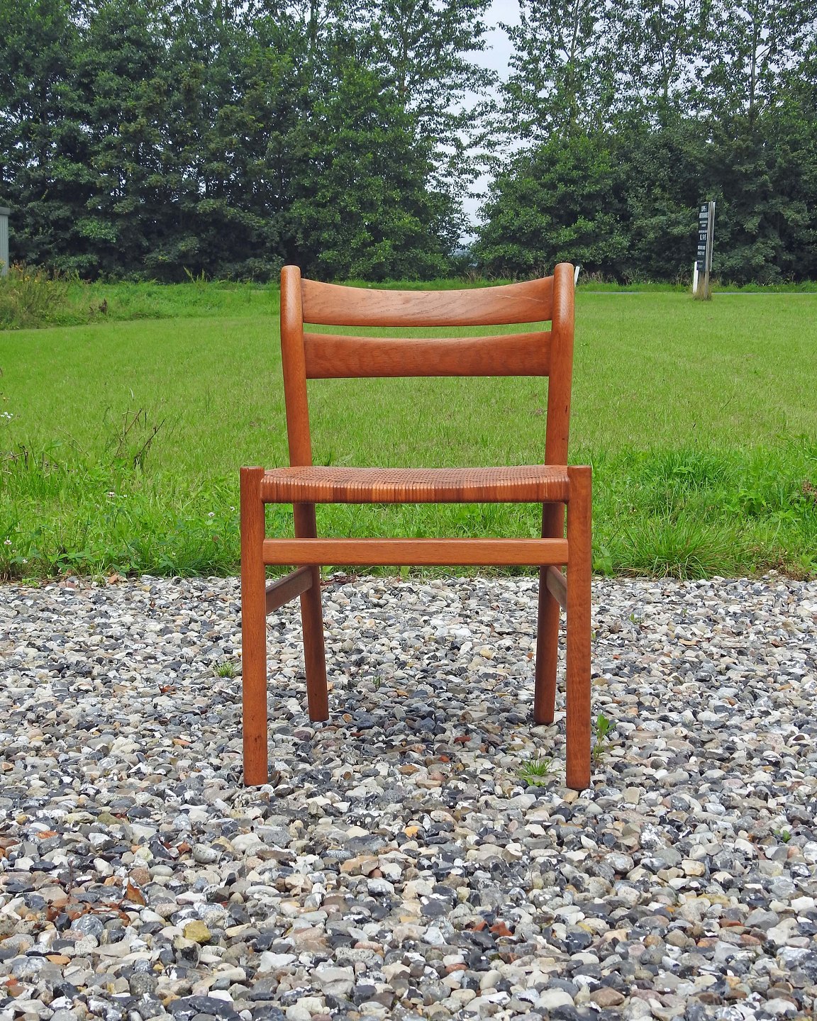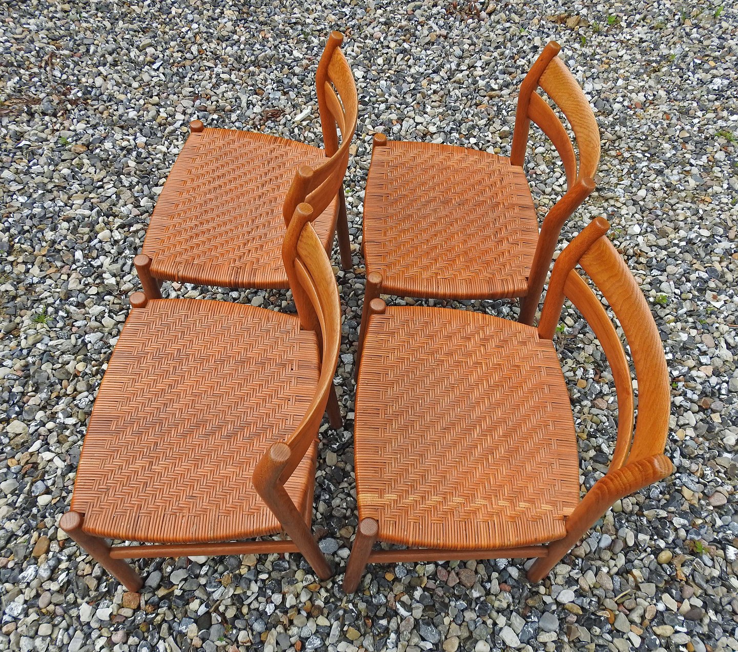 Stolene har en flot gylden glød og sæderne er er fremstillet af peddigrørflet, som sjælden ses på denne model.