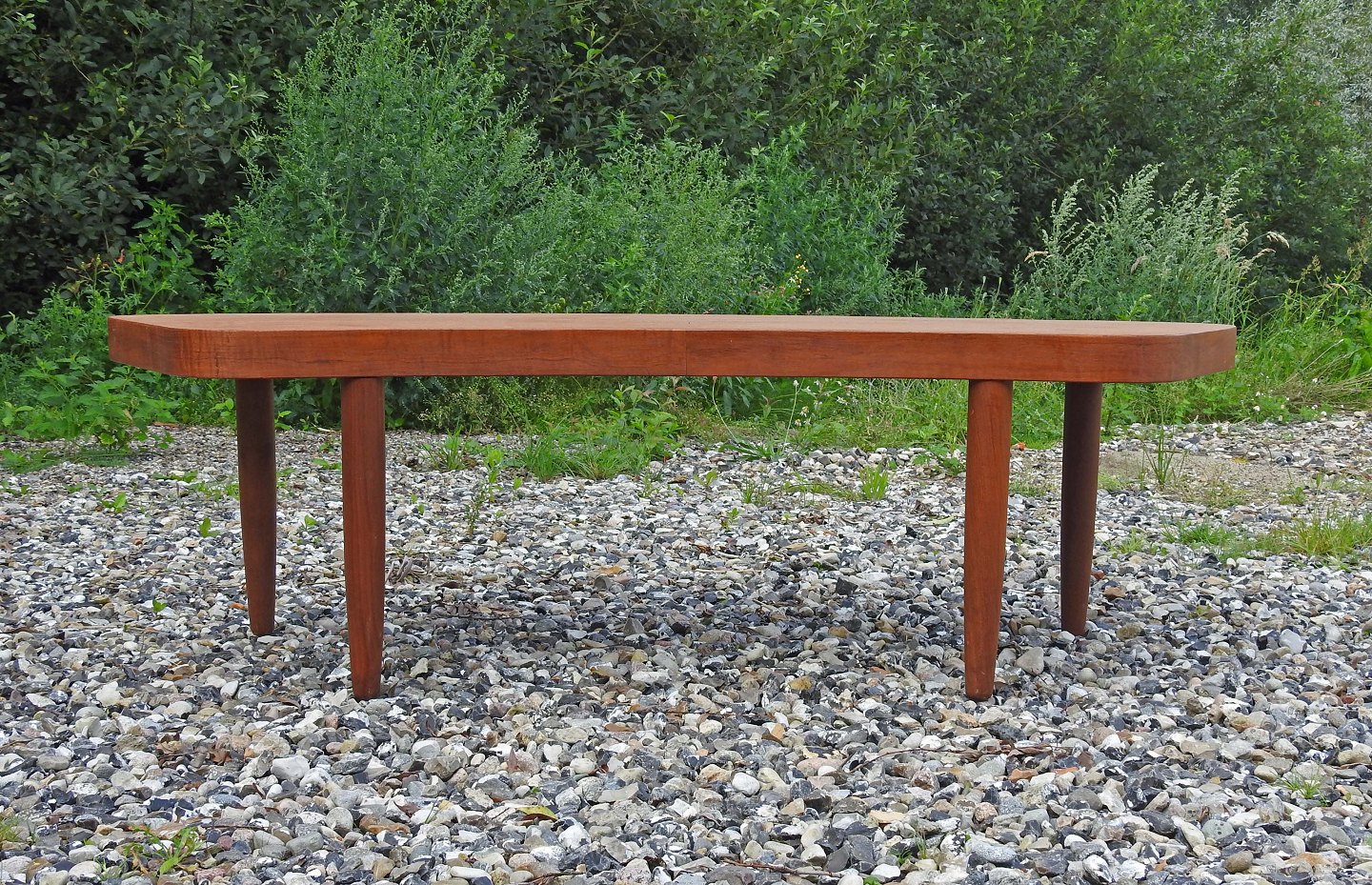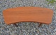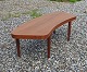 Sofabord i teaktræ med buet form og runde ben i dansk møbeldesign