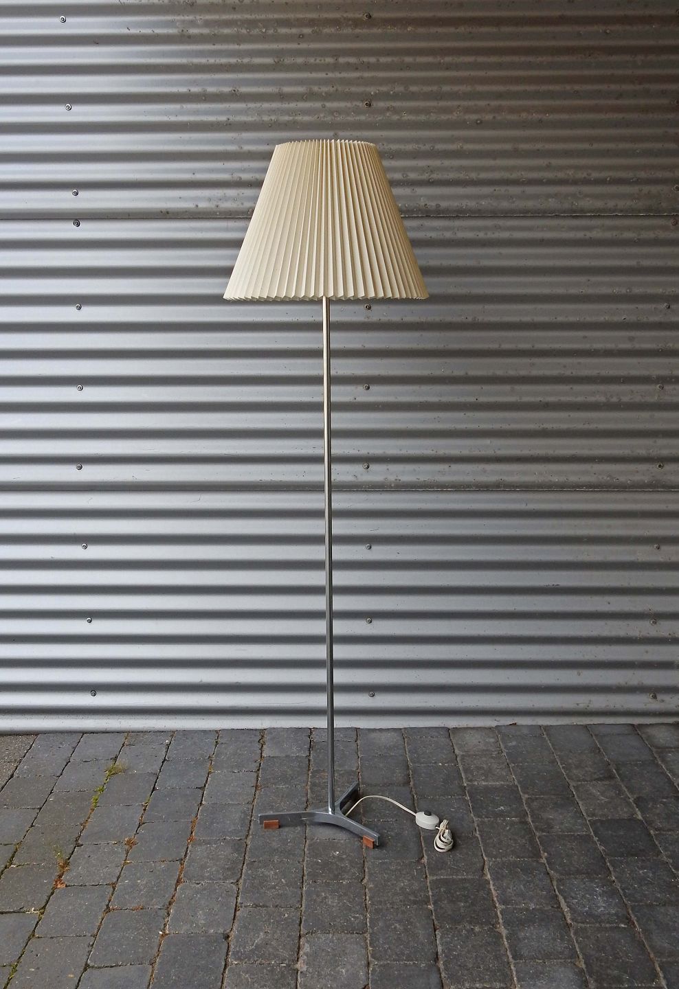 Standerlampe på metal fod med hvid plisseret stofbetrukket skærm. Design Joe Hammerborg