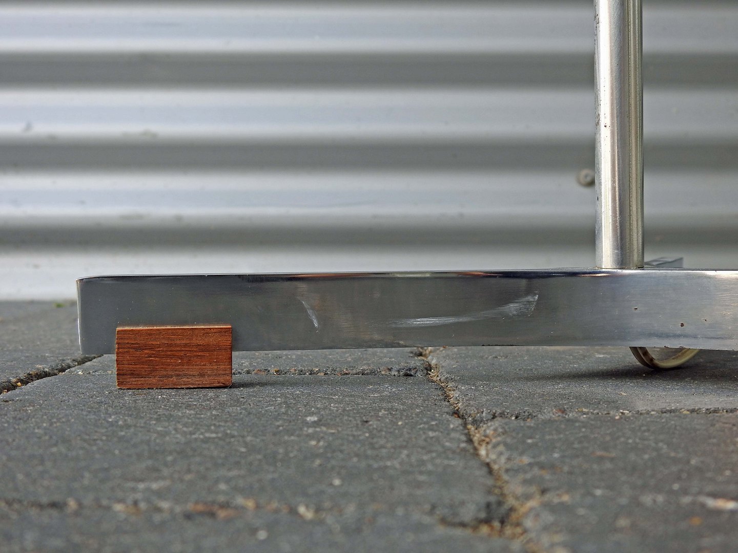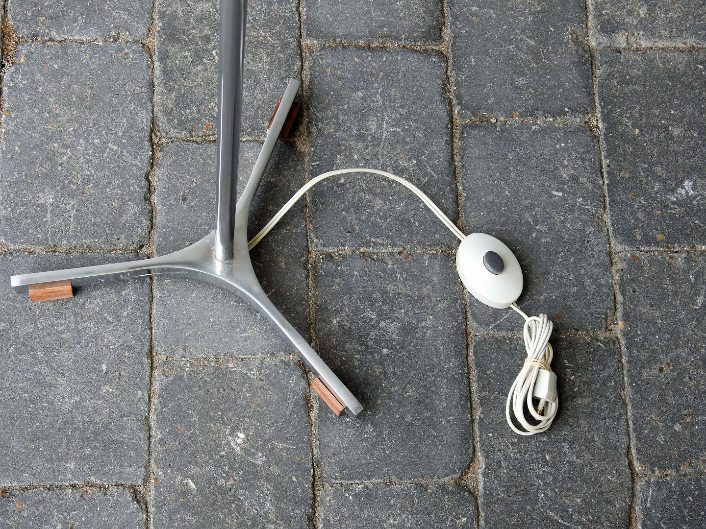 Lampefoden hviler på tre mindre klodser i teaktræ