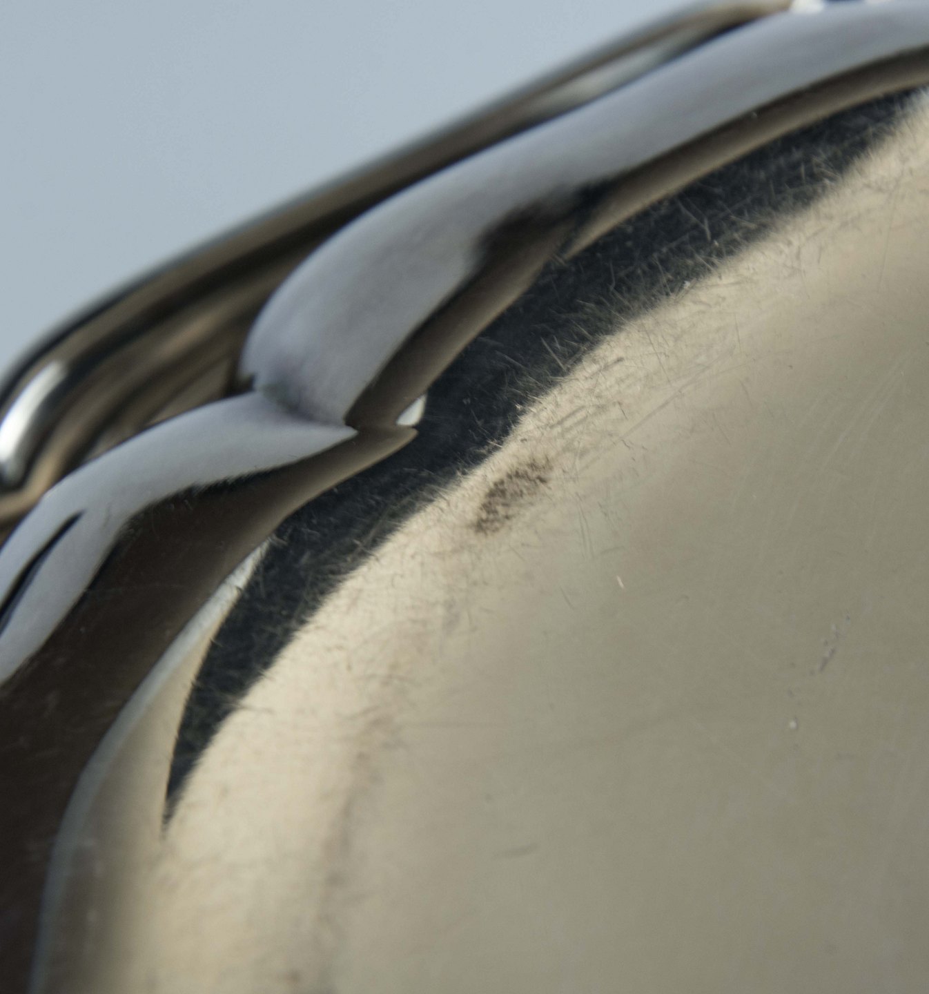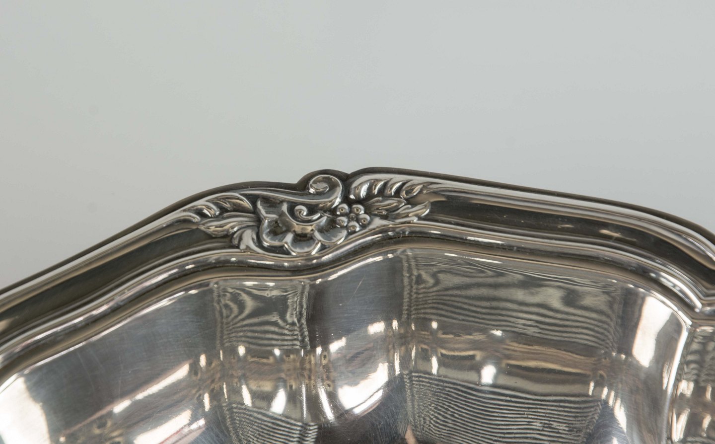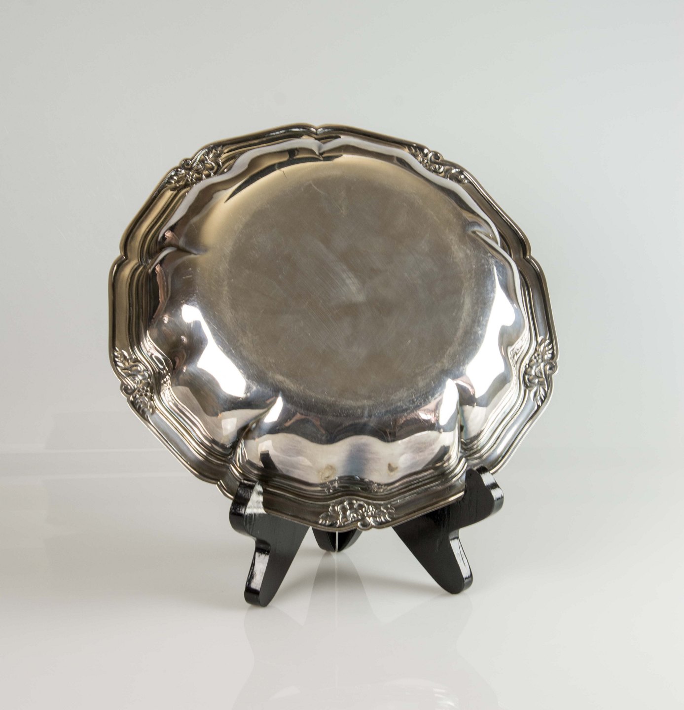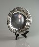 Kantet skål i sølv med dekoration på kant af blomst og blade