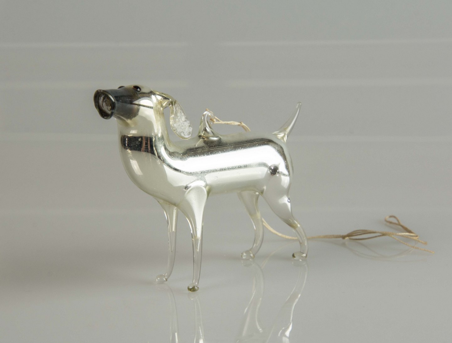 Fire gamle juleophæng i glas med motiv af gris, to hunde og et rensdyr