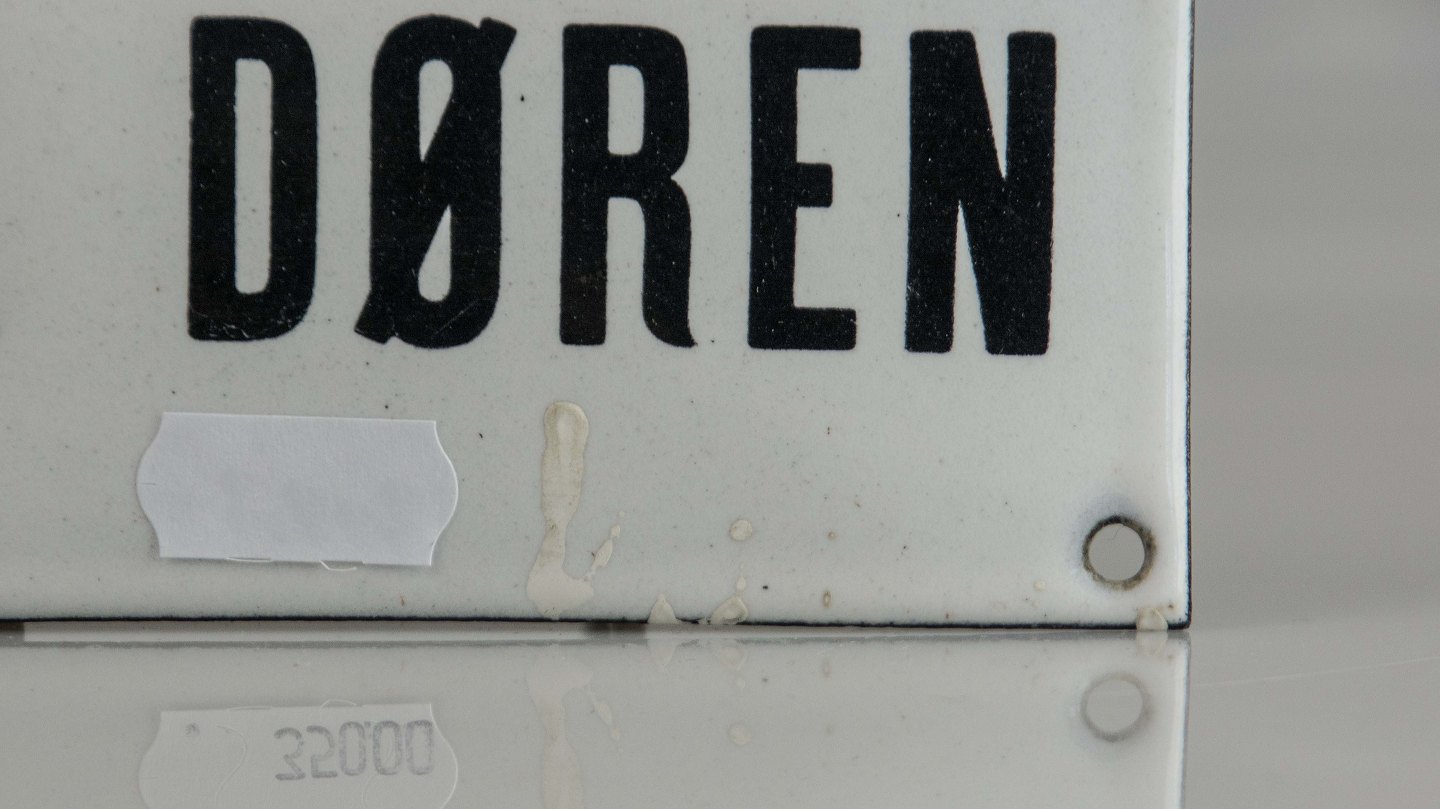 Skilt i hvid og sort emalje med teksten Luk døren